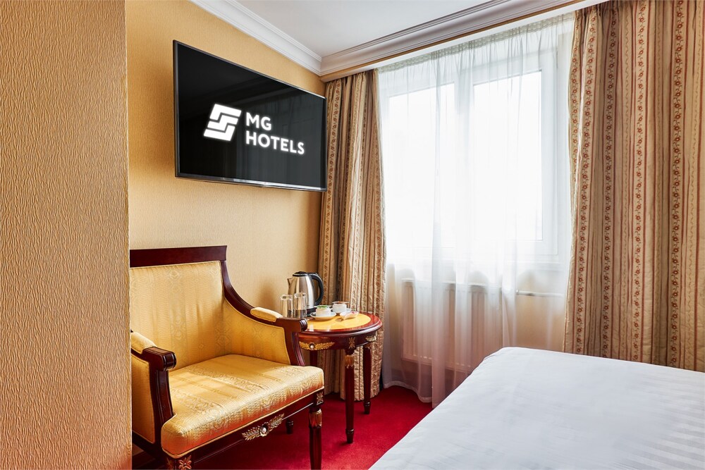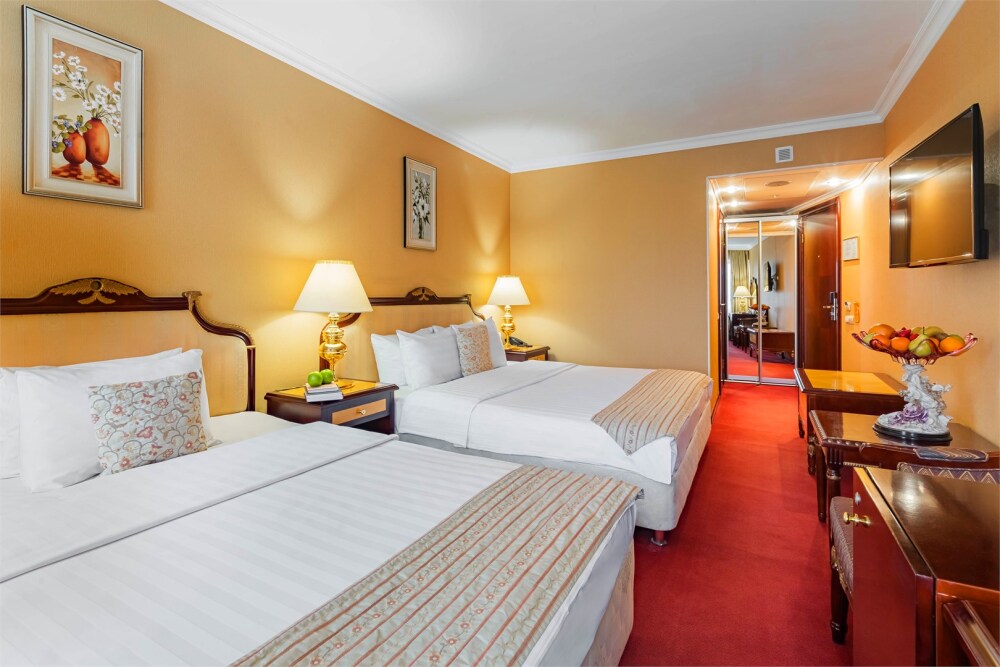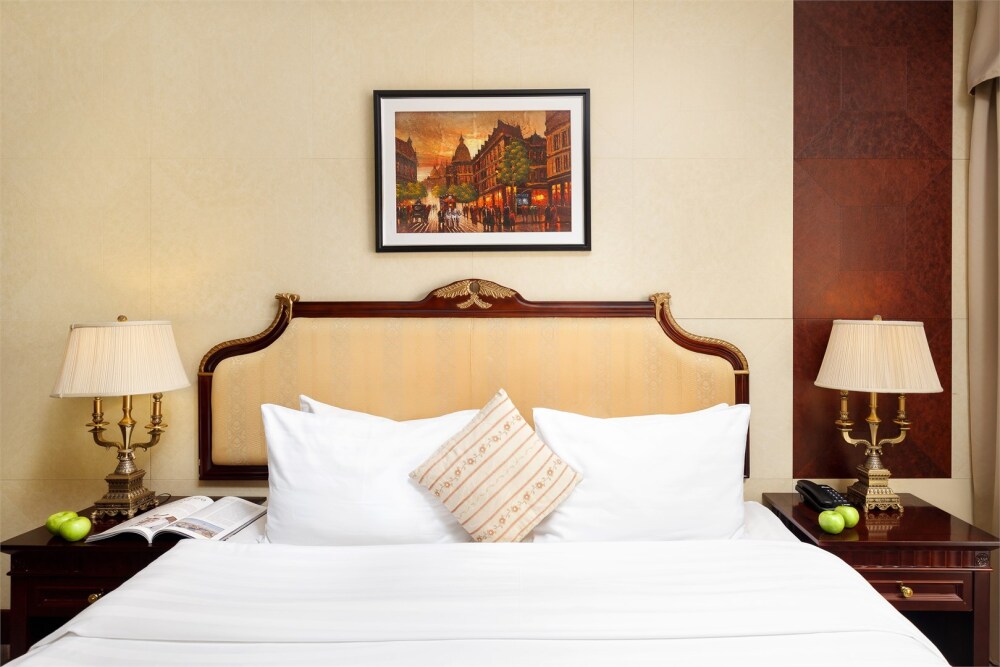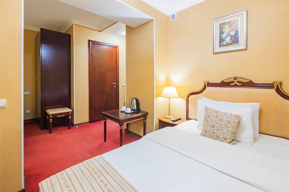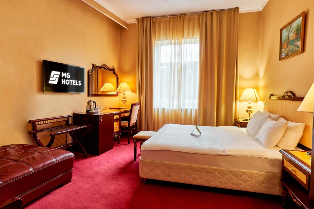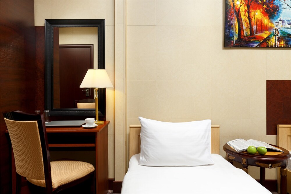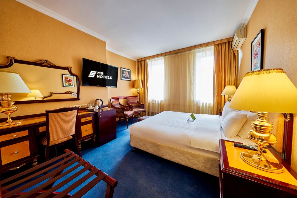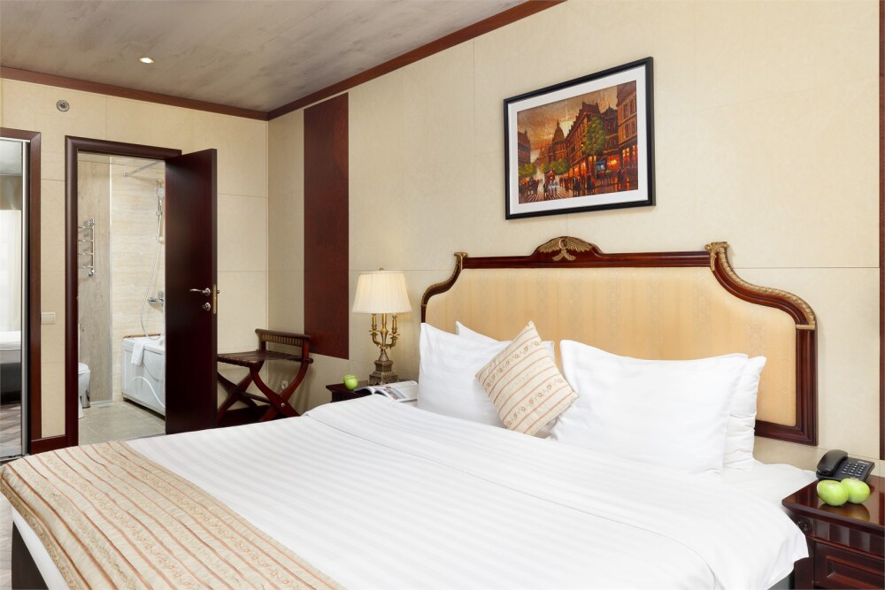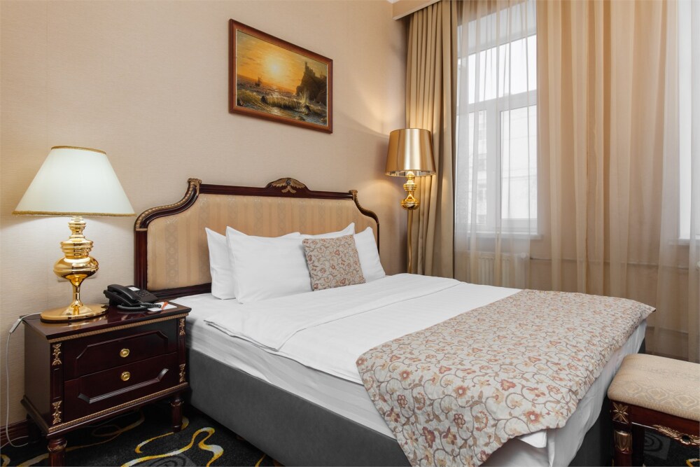 В номере: одна двуспальная (160 см*200 см, или 180 см*200 см) или две раздельные кровати ( 90 см*200 см, или 120 см*200 см).