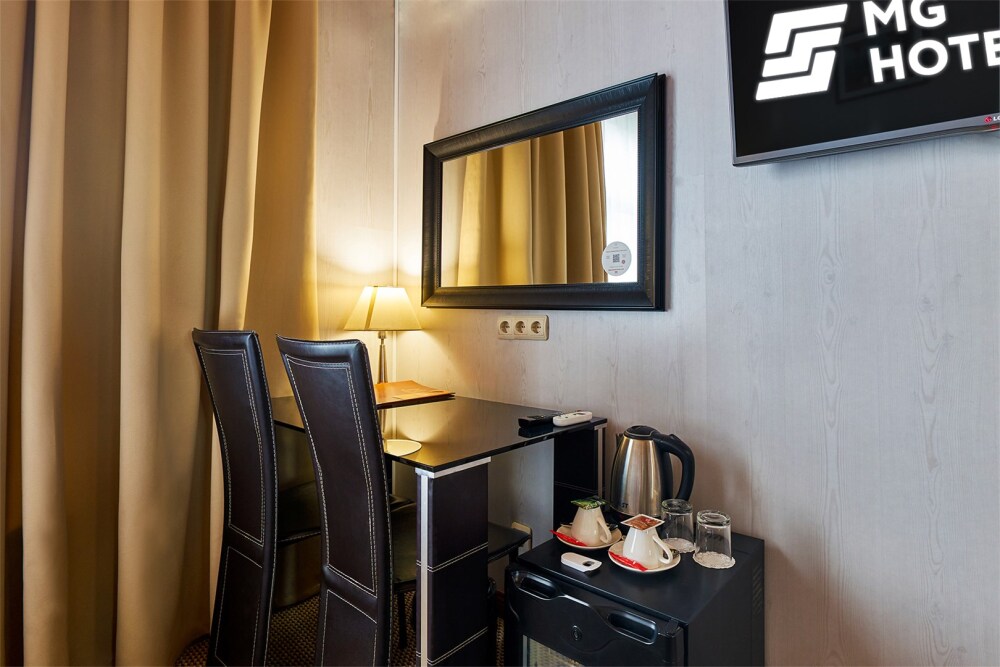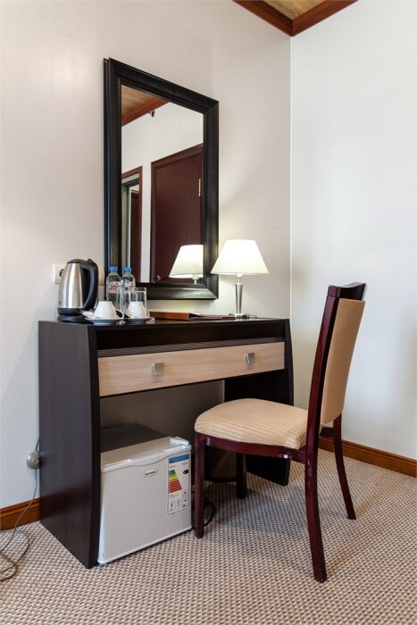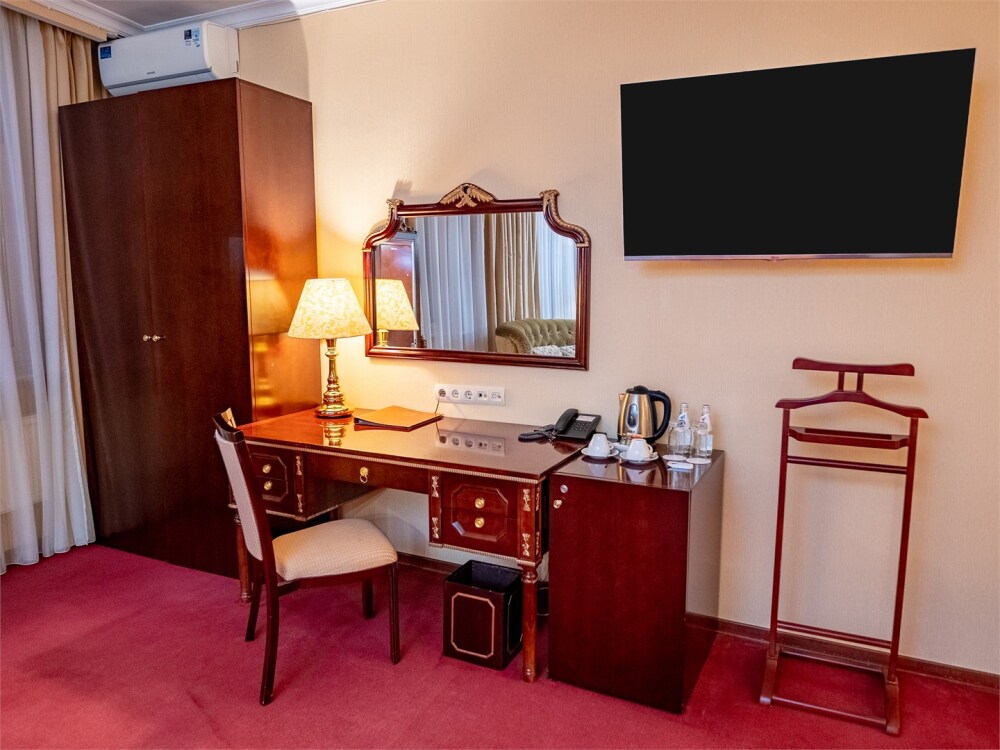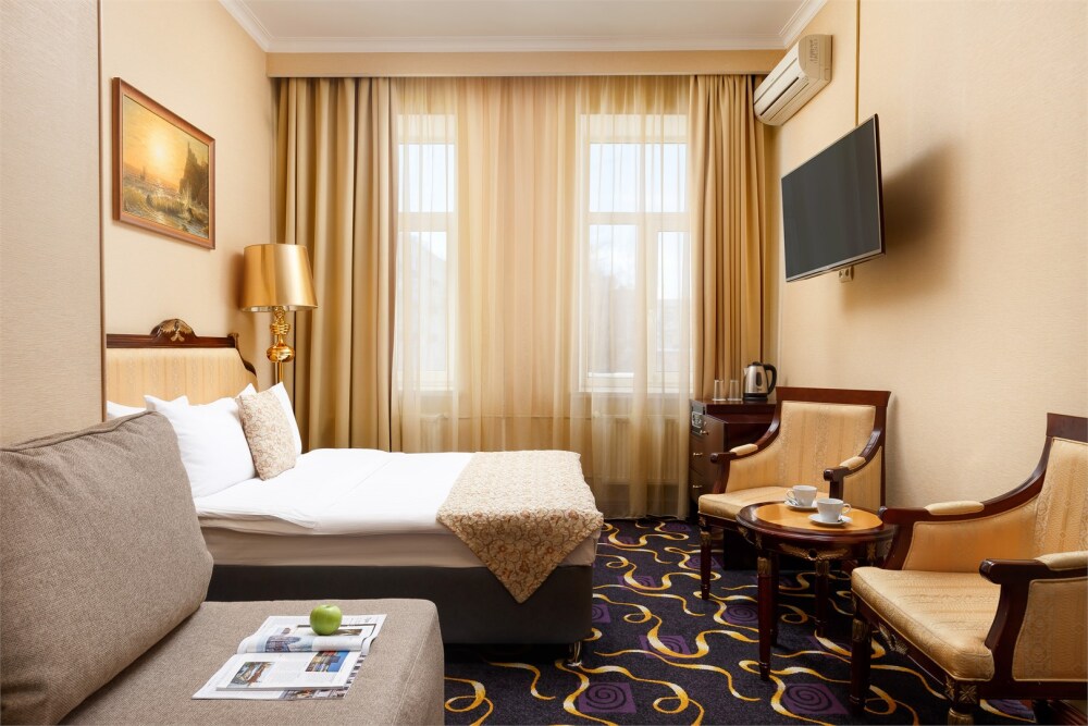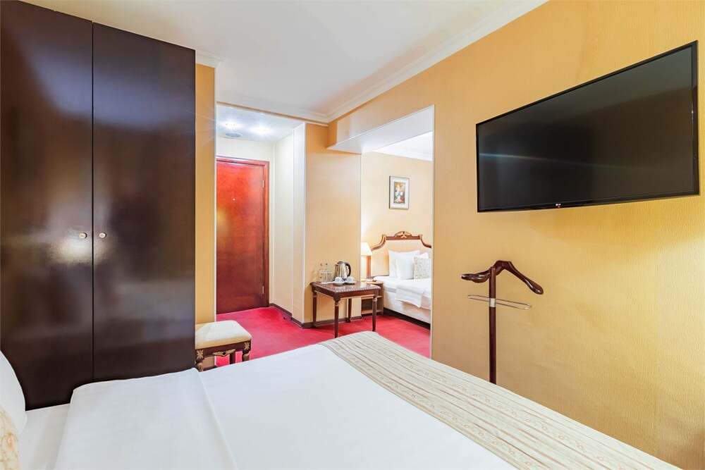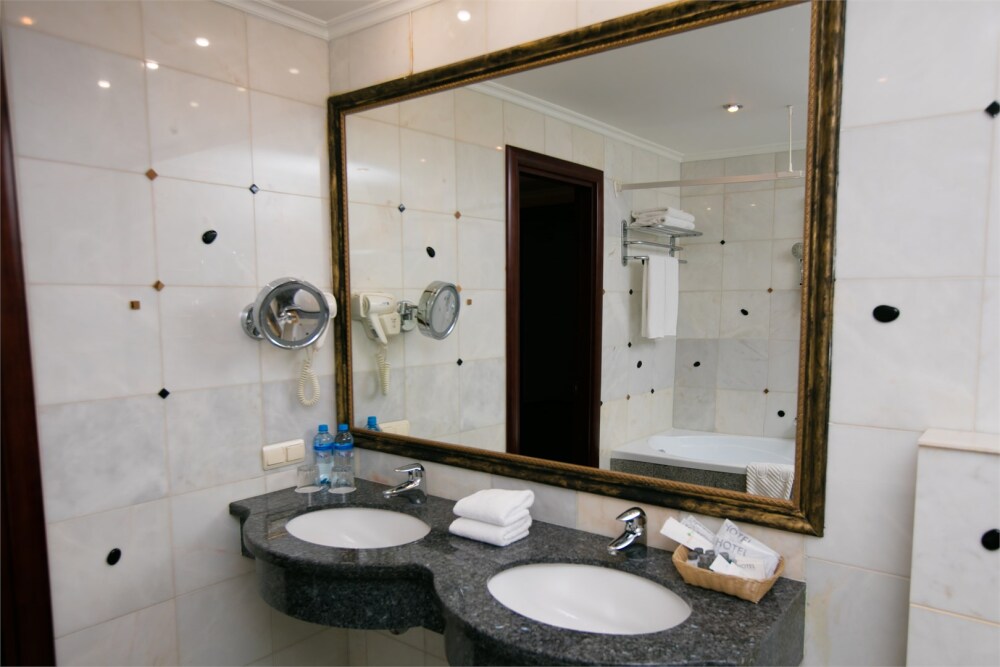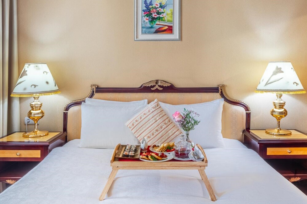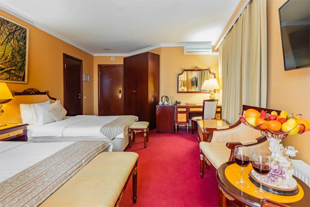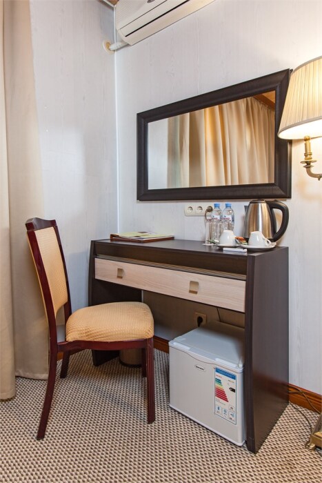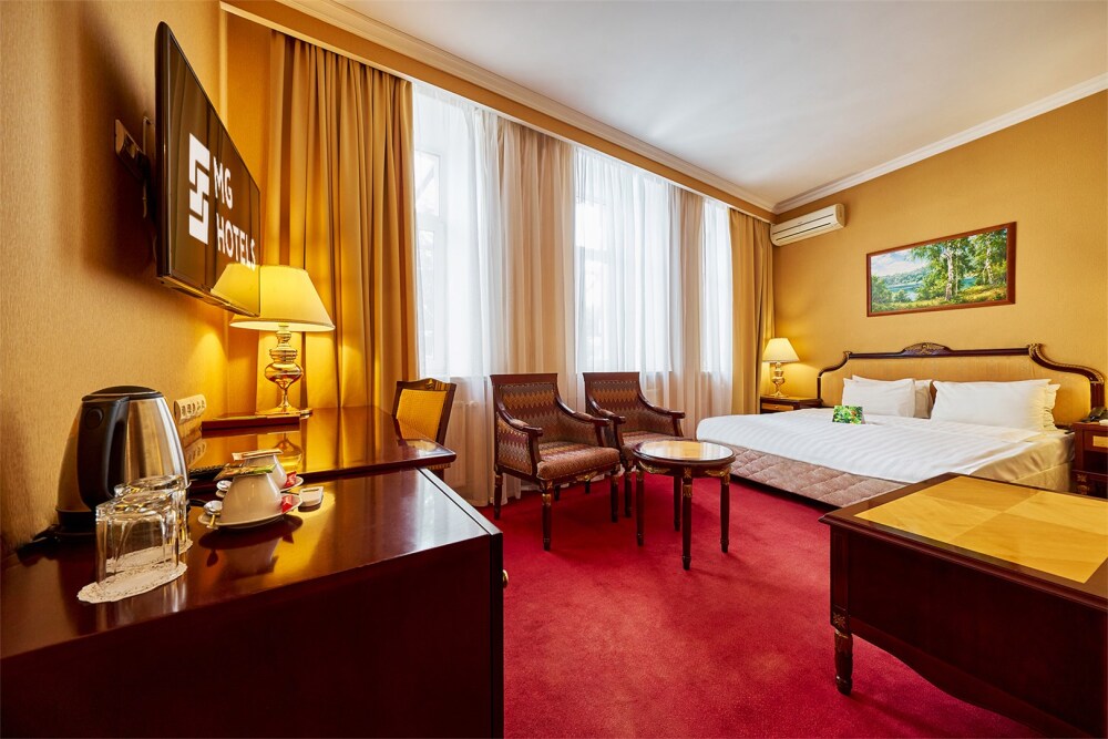 В номере: одна двуспальная (160 см*200 см, или 180 см*200 см) или две раздельные кровати ( 90 см*200 см, или 120 см*200 см).