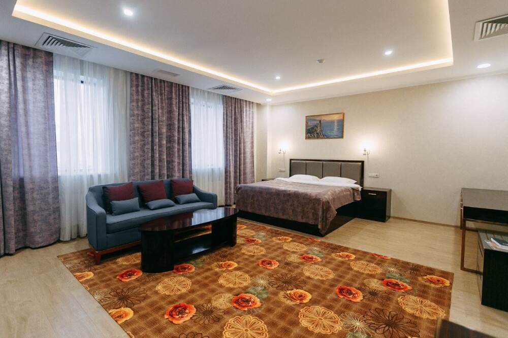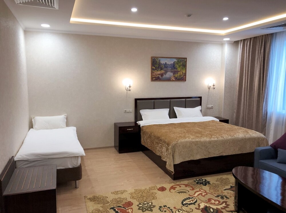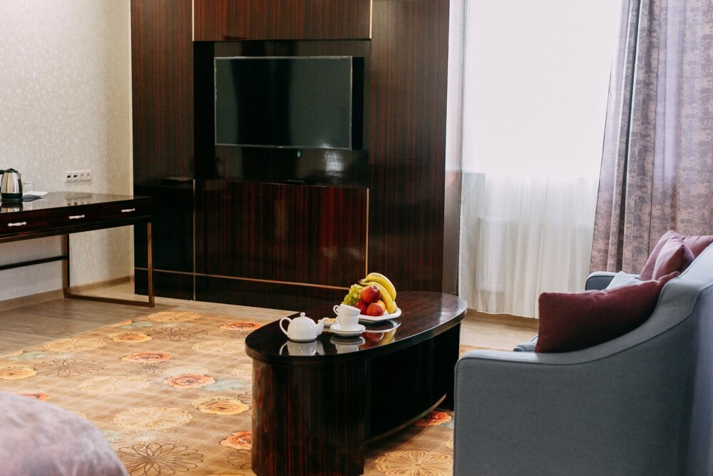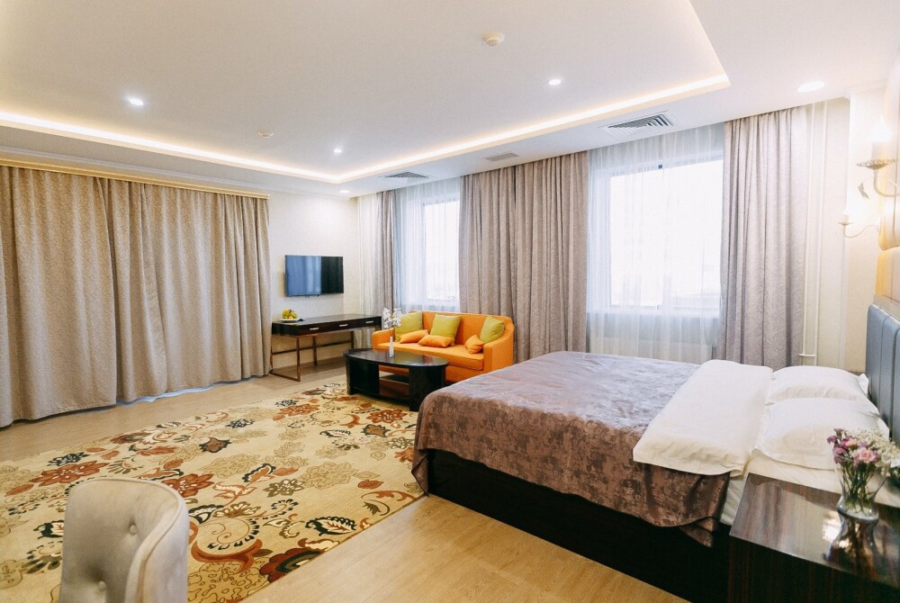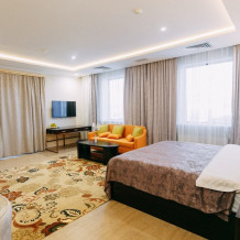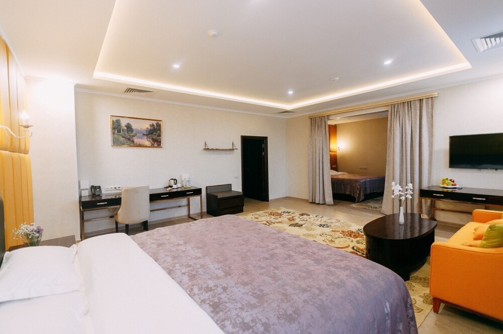 Просторные номера площадью от 53 до 73 кв. м оснащены всем необходимым: телевизор, кондиционер, холодильник, чайник, сейф, телефон, Wi-Fi и ванная комната. Гостям предоставляются полотенца, тапочки и косметические принадлежности.