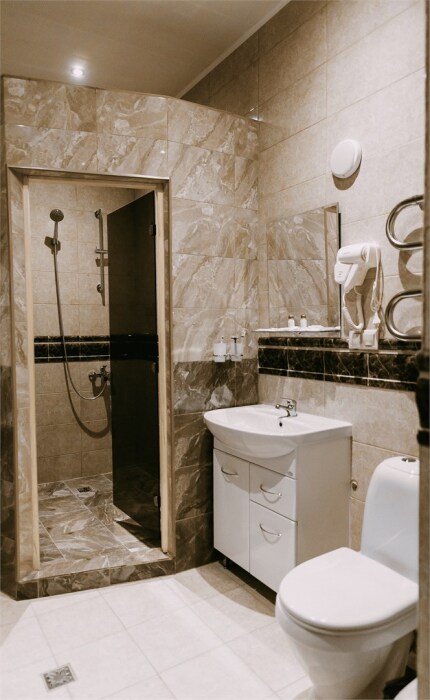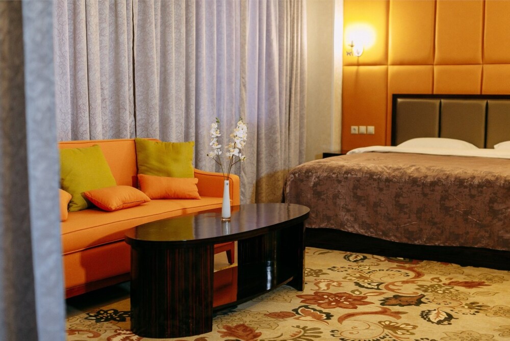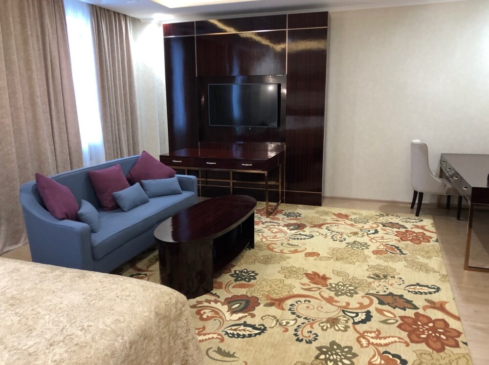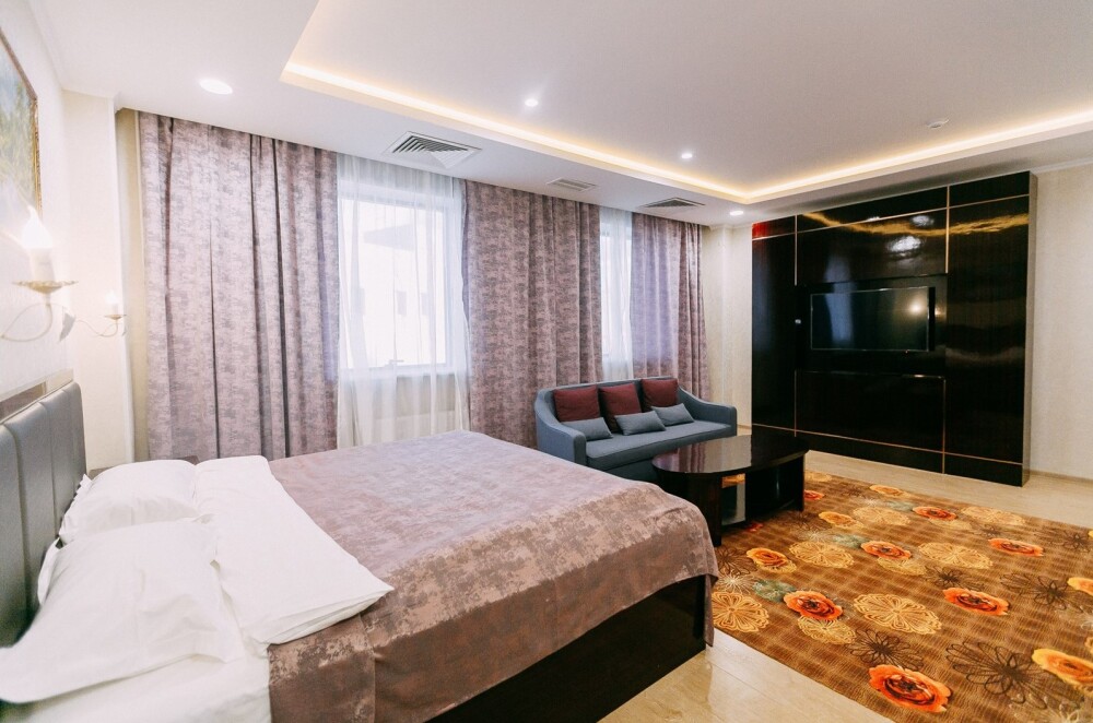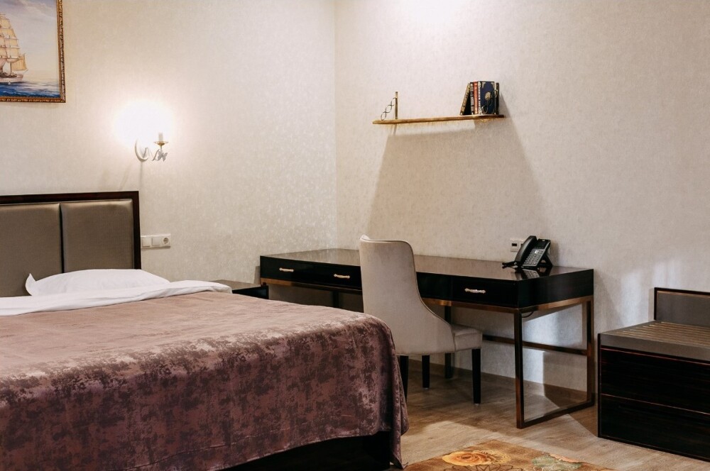 Просторные номера площадью от 53 до 73 кв. м оснащены всем необходимым: телевизор, кондиционер, холодильник, чайник, сейф, телефон, Wi-Fi и ванная комната. Гостям предоставляются полотенца, тапочки и косметические принадлежности.