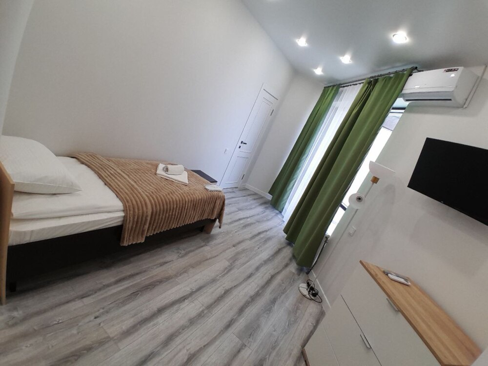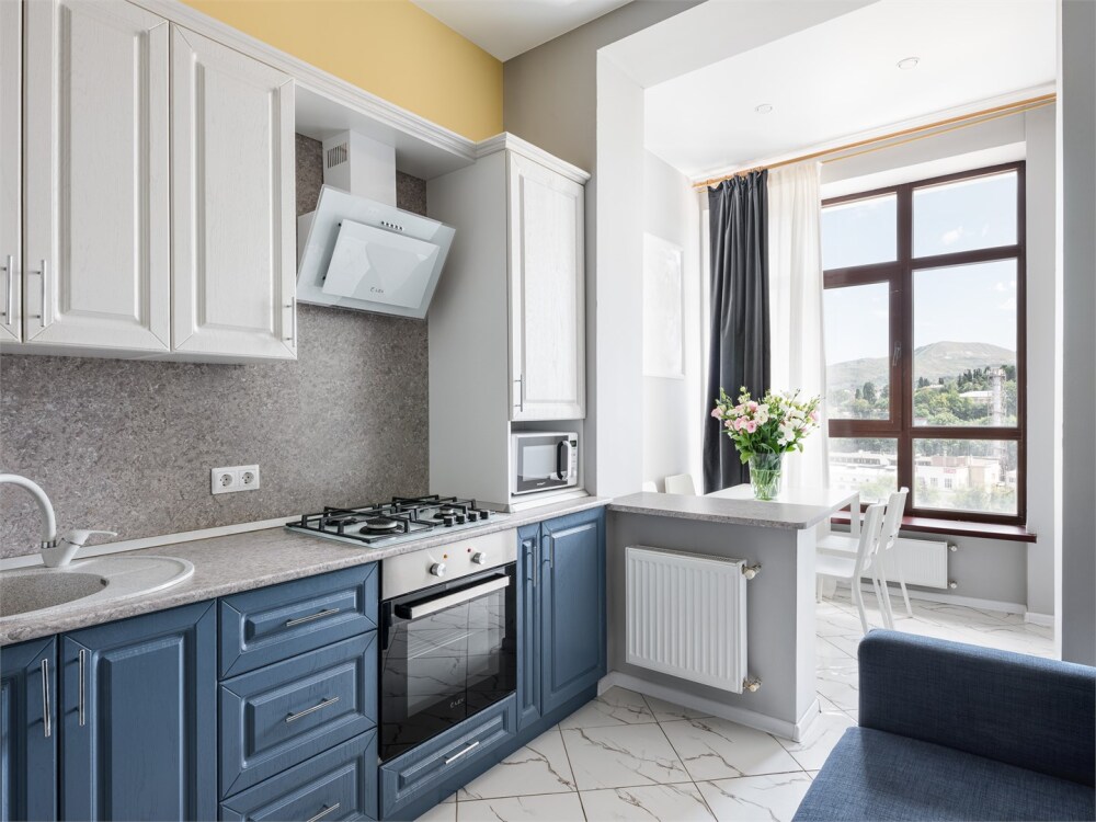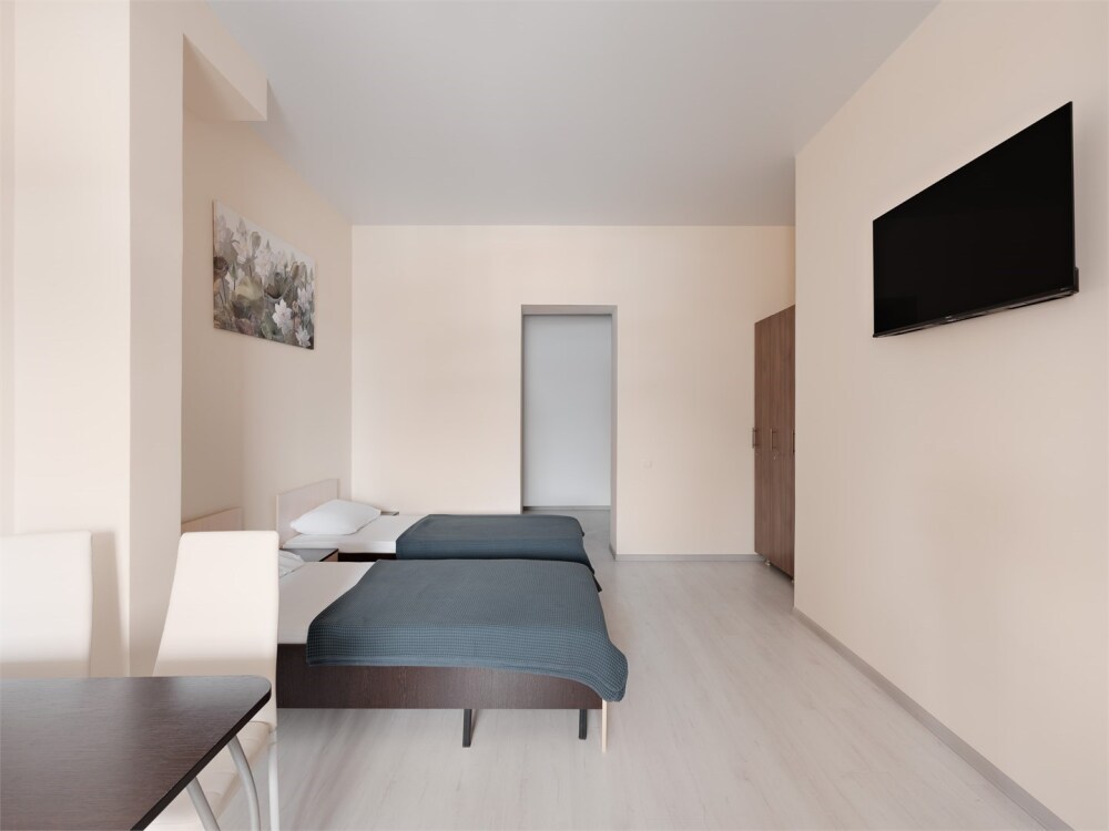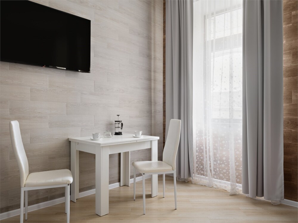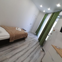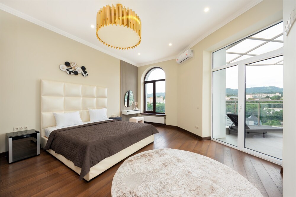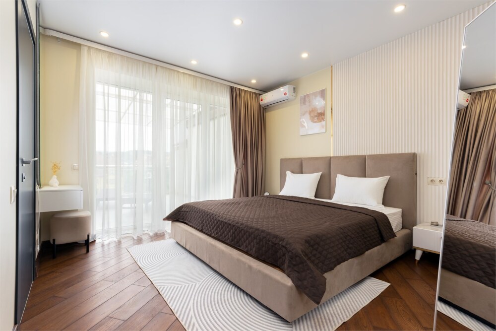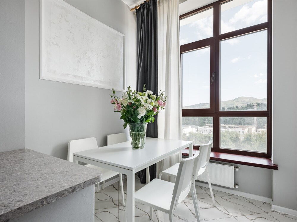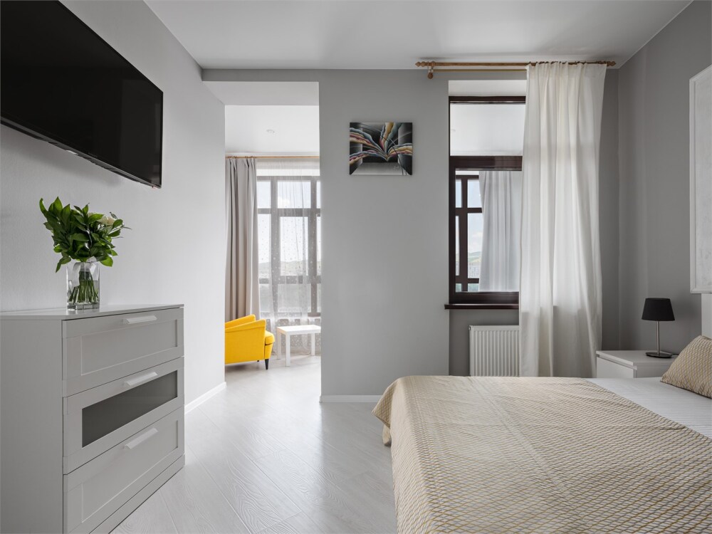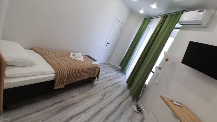 Апартаменты представляют собой двухкомнатные апартаменты, включающие гостиную, спальню, лоджию, кухню и террасу с великолепным видом на город и склоны Джинальского хребта.