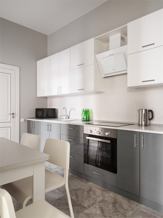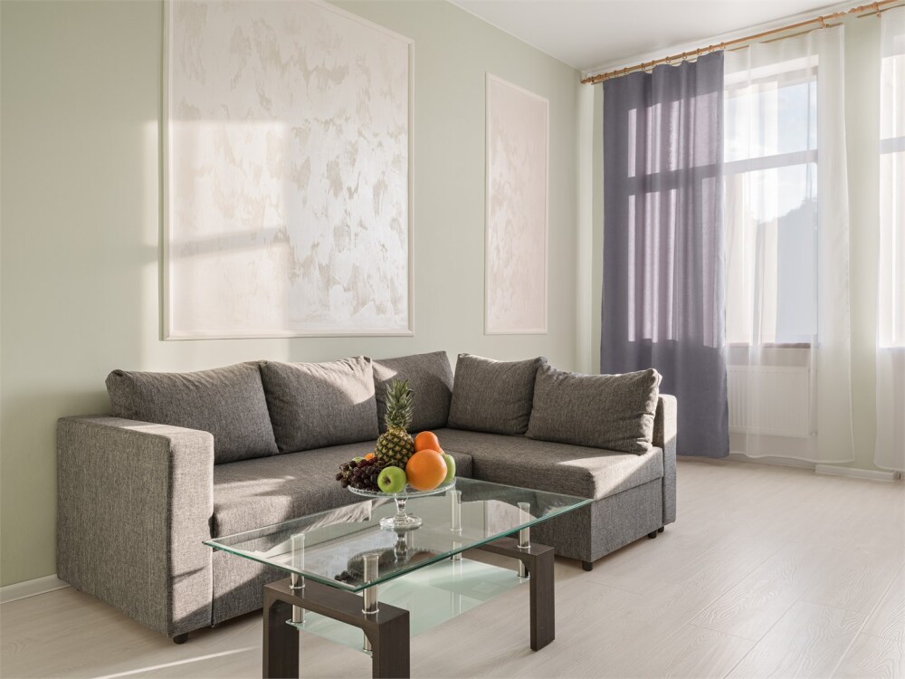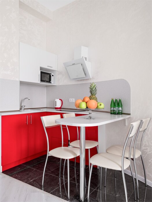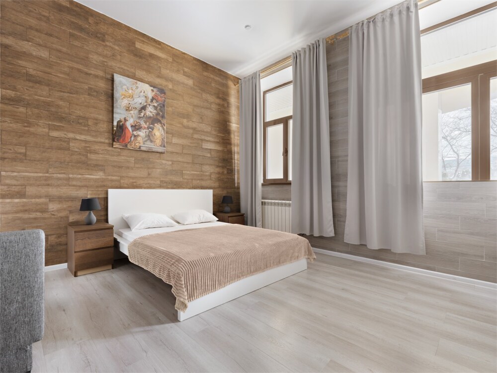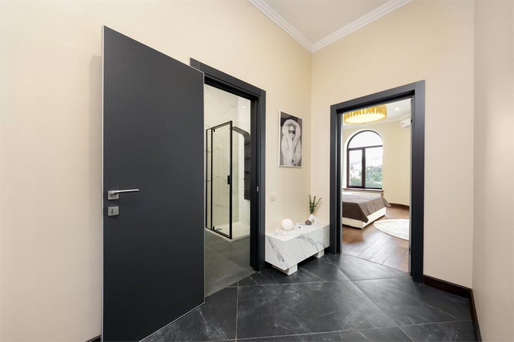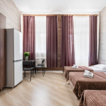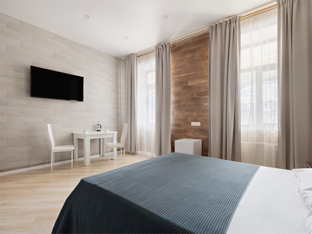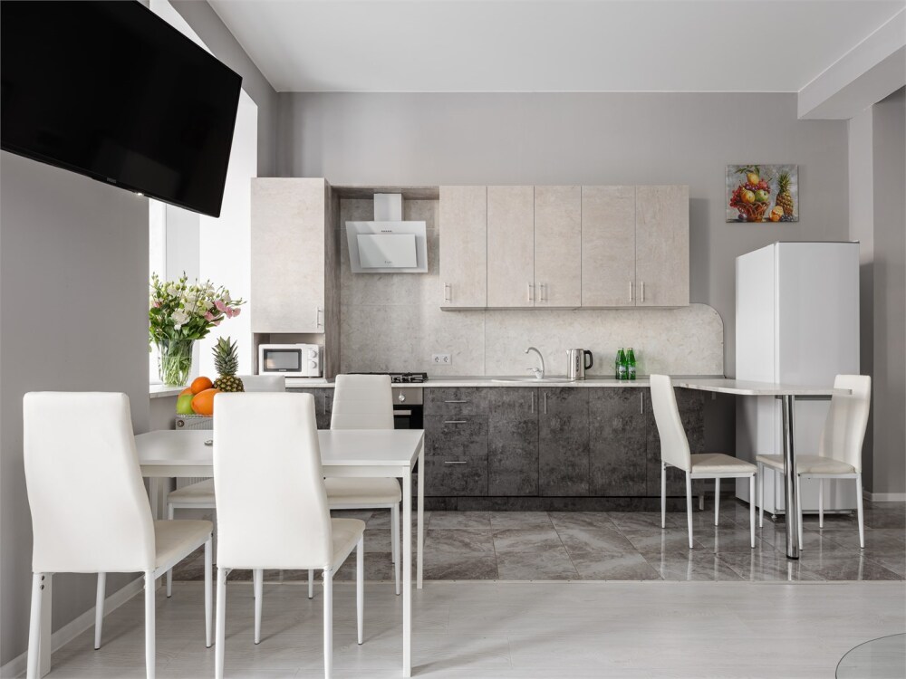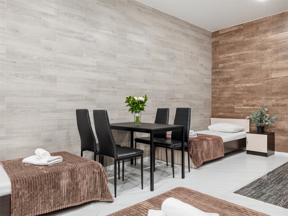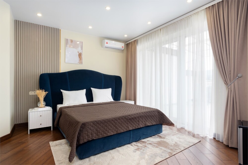 Апартаменты представляют собой двухкомнатные апартаменты, включающие гостиную, спальню, лоджию, кухню и террасу с великолепным видом на город и склоны Джинальского хребта.