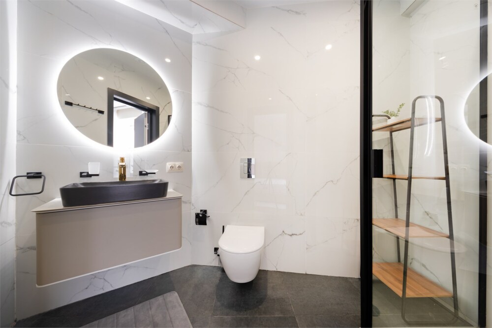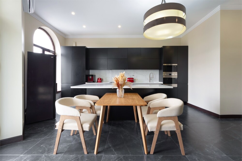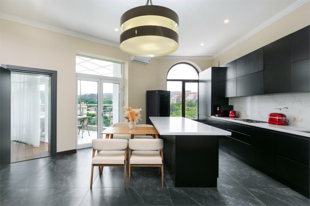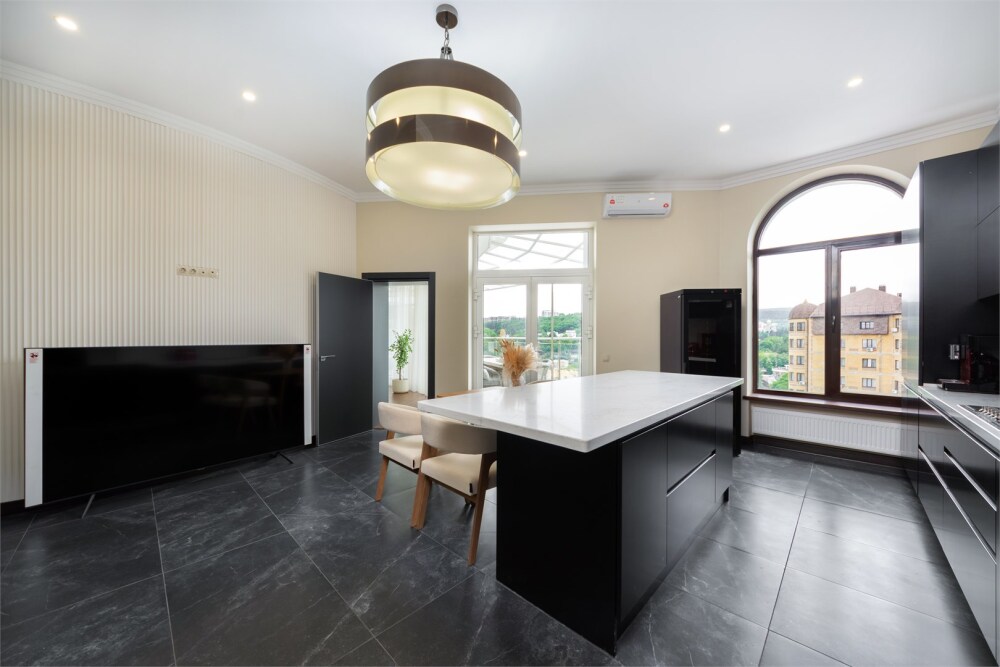 Этот номер расположен в пентхаусе, где есть общая зона отдыха в виде гостиной, кухня премиум-класса и терраса с видом на город, доступная для пяти номеров.