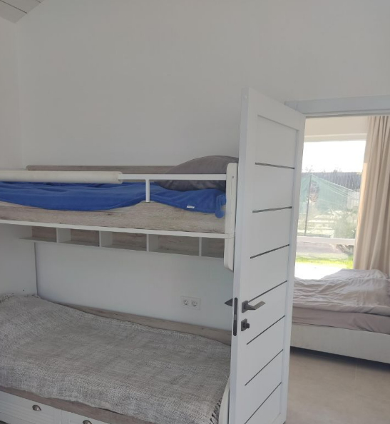 В коттедже 1 спальня с 2-спальной кроватью, двухъярусная детская кровать и дополнительный раскладной диванчик.