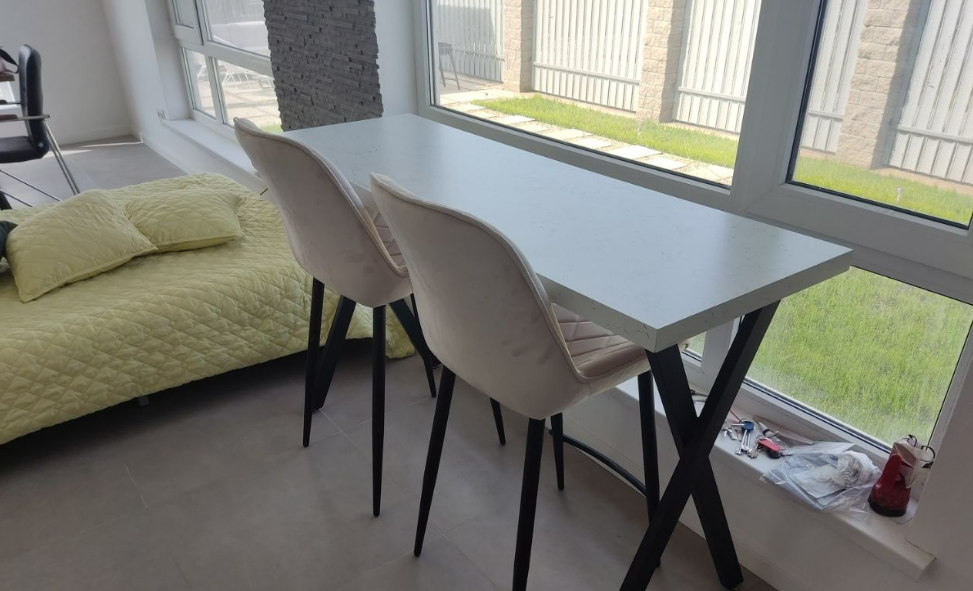 Гостиная на 35 кв.м создаёт уникальное пространство. Здесь и зона столовой вместимостью 6 персон, удобная кухонная зона и зона отдыха с дополнительным местом.