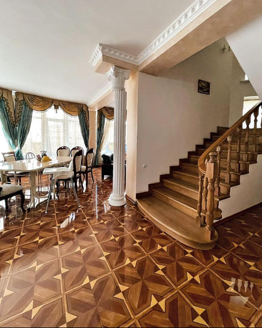 Коттедж в 3 этажа на частной огороженной территории для отдыха семейного или большой компанией. В коттедже 5 комнат в основном здании плюс 2 комнаты в дополнительном, кухня-столовая с бытовой техникой (варочная панель, духовой шкаф, посудомоечная машина, холодильник, микроволновая печь, электрический чайник). В комнатах - сплит-системы, телевизоры. В пользовании - стиральная машина, мангальная зона с беседкой для отдыха, парковка на 4 автомобиля внутри двора, шезлонги для загара.