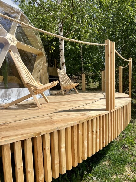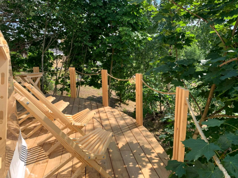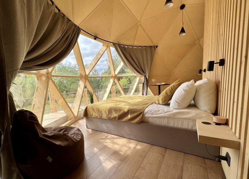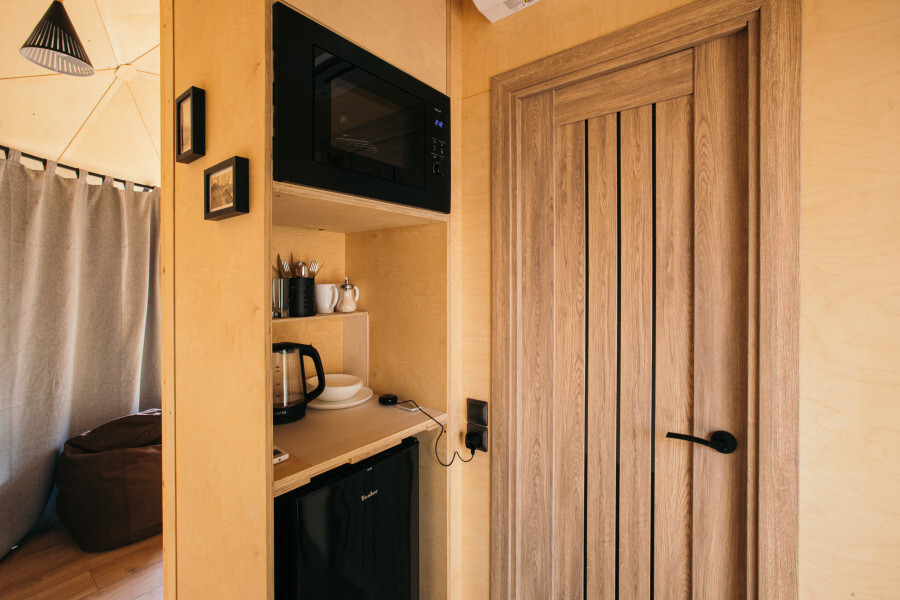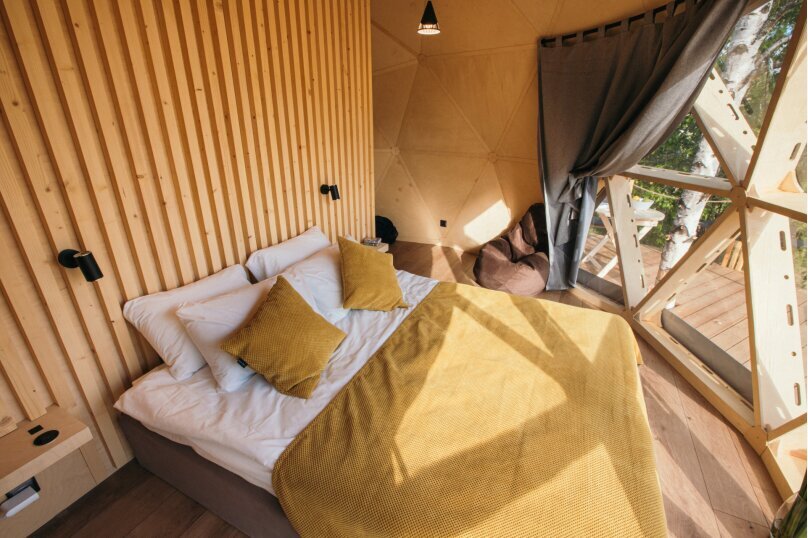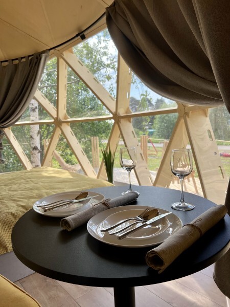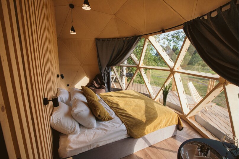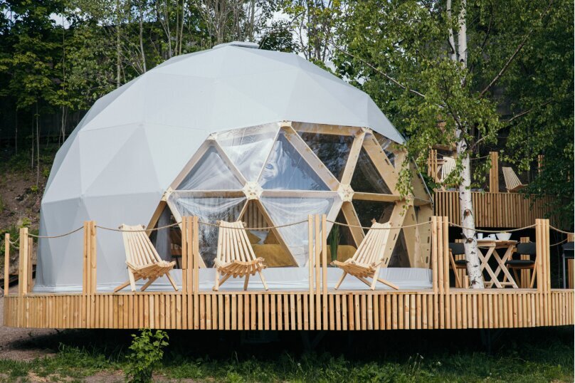 Глэмп: Уютный и современный купольный дом с панорамным остеклением и собственной террасой. Внутри Вы найдете комфортную двуспальную кровать, кухонную и обеденную зоны и современный санузел с необходимыми туалетными принадлежностями и полотенцами, а на террасе шезлонги и зона для барбекю. Если Вы планируете путешествие с ребёнком до 3-х лет, предупредите нас заранее и мы предоставим ему отдельную кроватку.