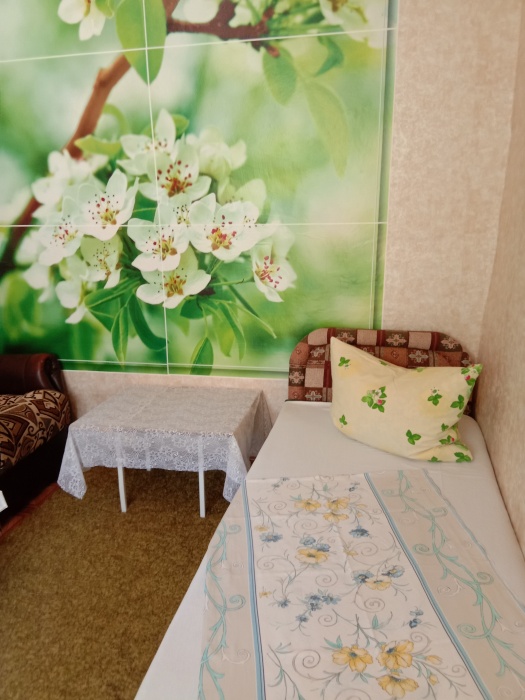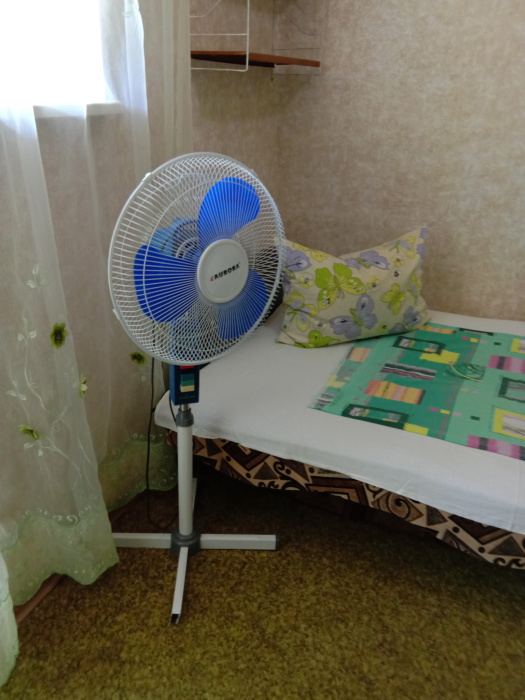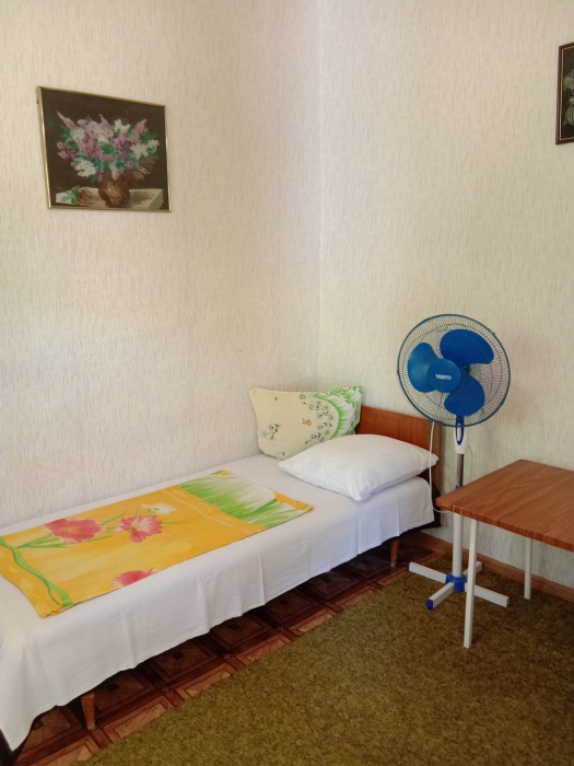 Номер имеет отдельный выход во двор. Под навесом около номера, в тени винограда находится обеденная зона. В номере есть всё необходимое: постельное белье, журнальный столик, комод для белья, плечики для одежды, зеркало, полочки, напольный вентилятор. Полотенца выдаем по требованию. Горячий душ, туалет - раздельные, общие на три номера. На общей кухне есть необходимое оборудование: газовая плита, разделочный стол, мойка, холодильник, посуда.