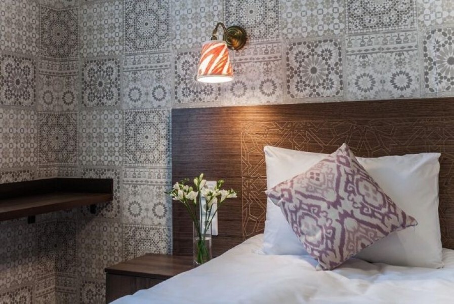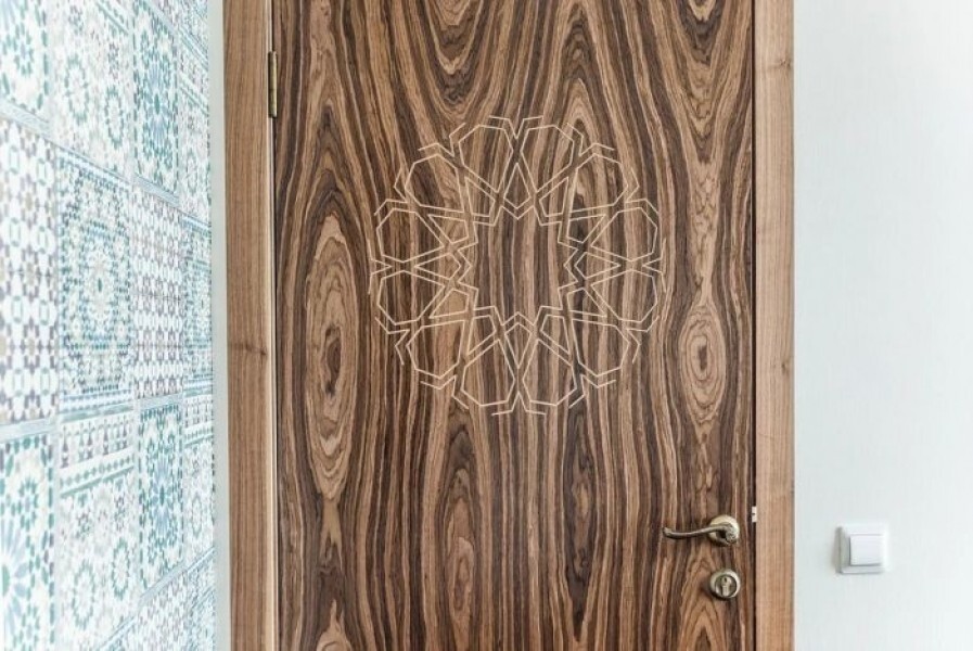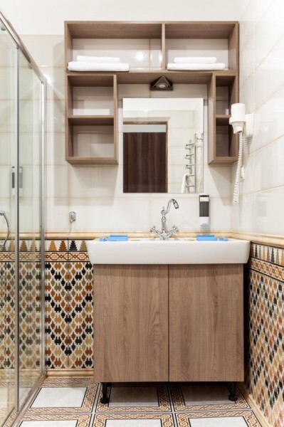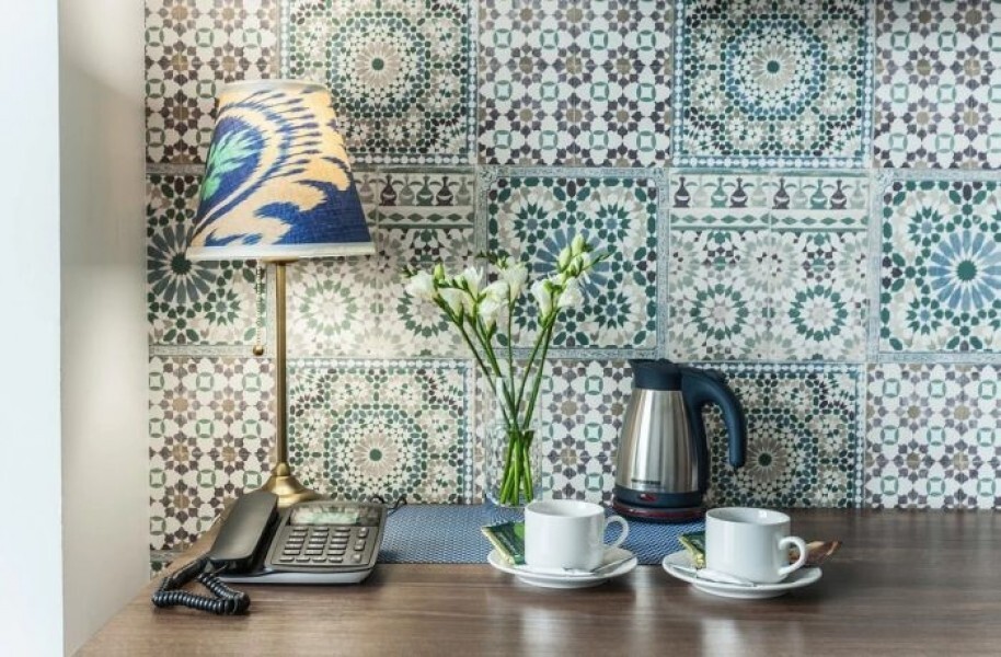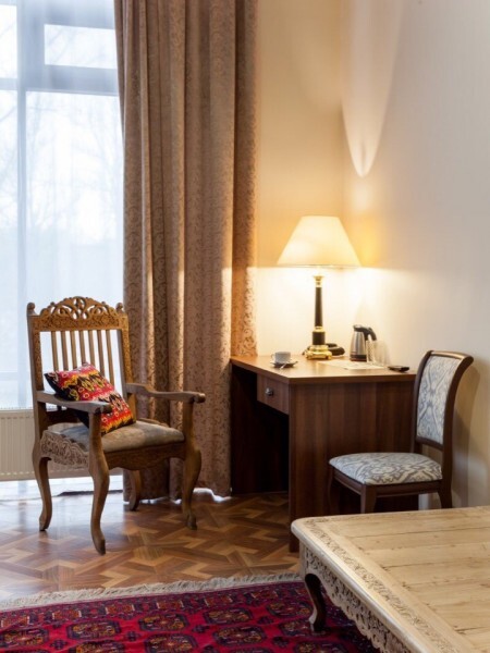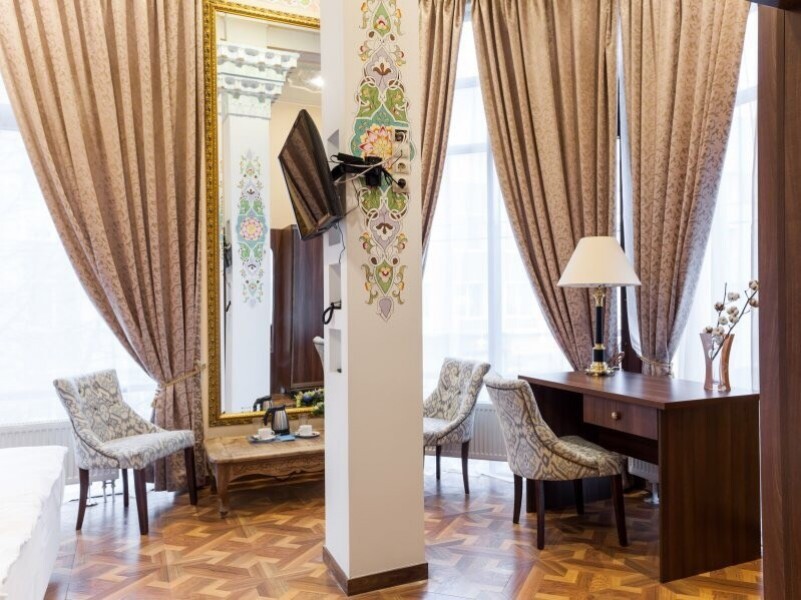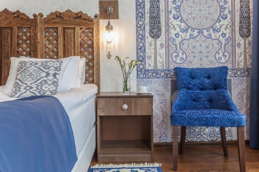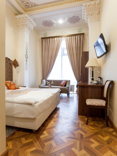 Все номера нашего отеля оформлены в восточном стиле с элементами и арабского, и персидского, и среднеазиатского искусства. В дальнейшем каждому номеру будет присвоено имя одного из городов Шелкового пути по порядку их прохождения, и в зависимости от названия, в номере будут присутствовать особые декоративные элементы или картины. Картины с изображением пейзажей и достопримечательностей стран, территории которых входили в Великий Шелковый Путь, мы планируем также повесить в холле отеля. Интерьер отеля мы старались сделать более уютным, в отличие от ресторана «Навруз», где он более музейный, поэтому технику ганча и росписи почти не использовали, кроме элементов стен в некоторых номерах и потолка в холле отеля, который расписывали приглашенные мастера из Узбекистана. Дизайн-проекта у нас не было, все до мелочей продумывалось самостоятельно: мебель делали на заказ, обои, плитку, светильники и т.д. выбирали тоже лично. Изголовья кроватей во многих номерах привезёны из Хивы, где были вырезаны вручную из уникального и очень прочного дерева Карагач.
