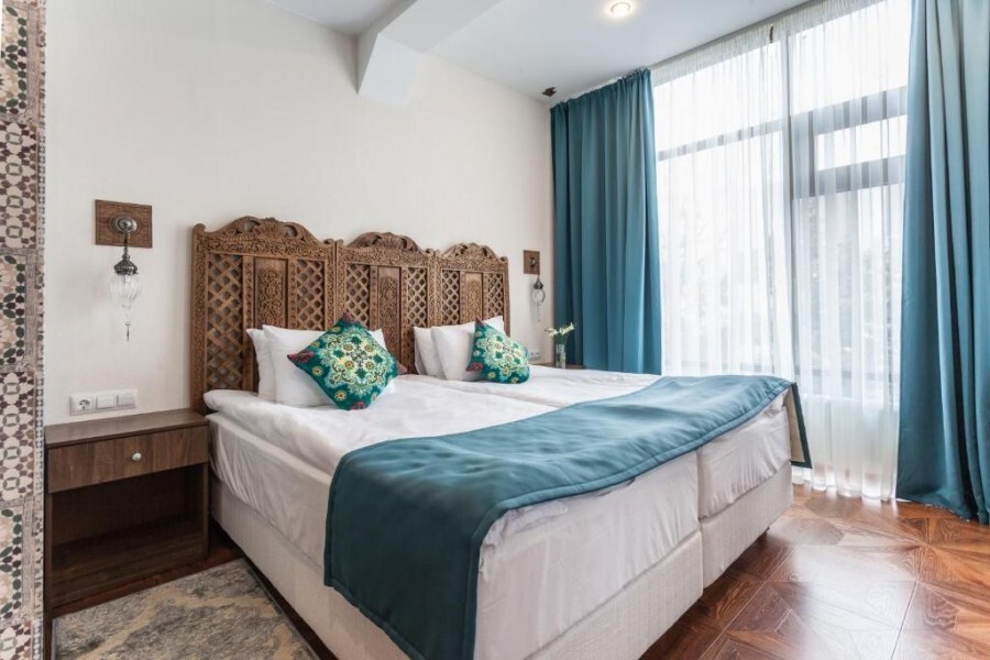 Во многих номерах гостей ждут удобные кровати с изголовьями, вырезанными вручную из дерева карагач искусными мастерами Хивы (Узбекистан).