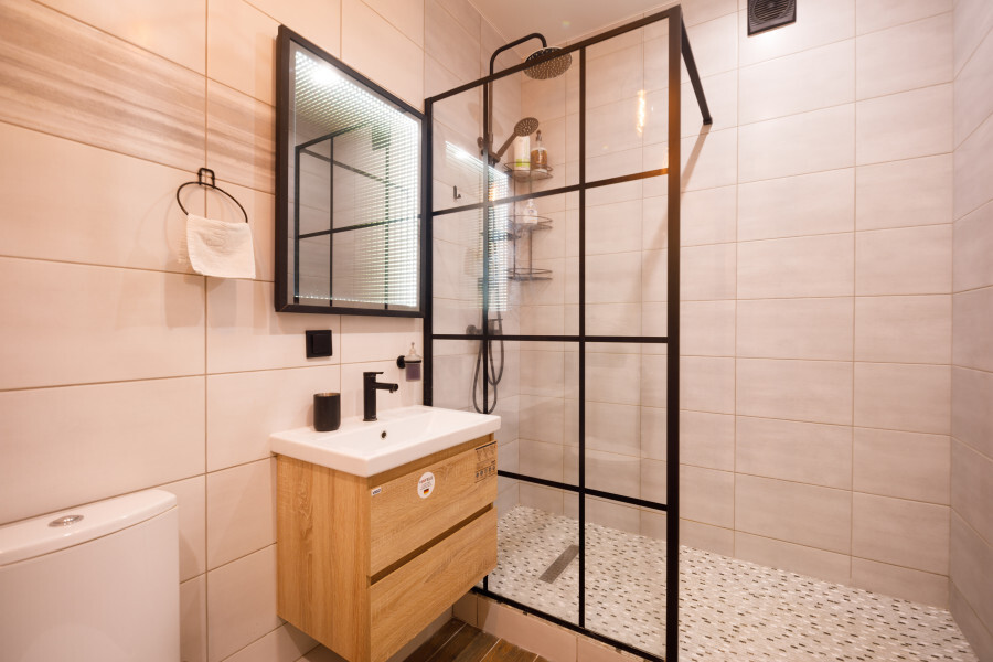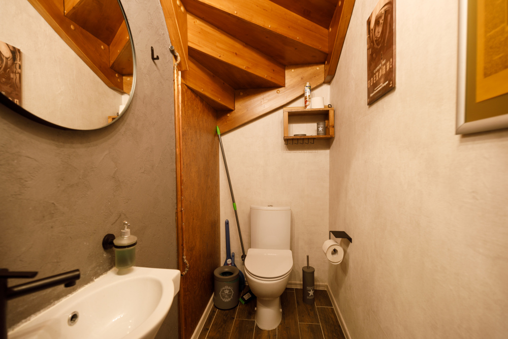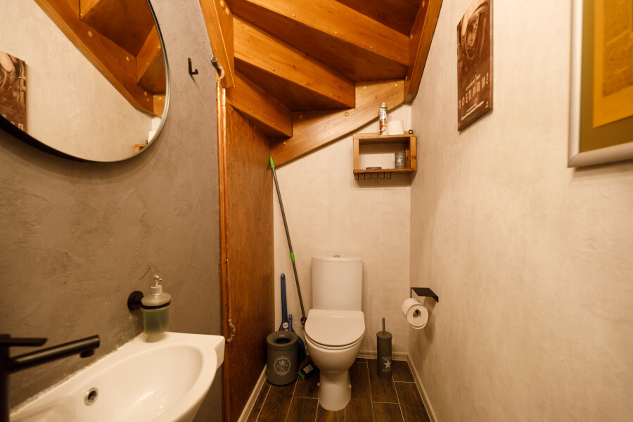 Кухня-столовая оборудована всей необходимой бытовой техникой (посудомоечная машина, духовой шкаф, тостер, электрочайник, блендер, микроволновая печь, холодильник), посудой. Два санузла: гостевой туалет на первом этаже ванная комната с душевой кабиной на втором этаже.