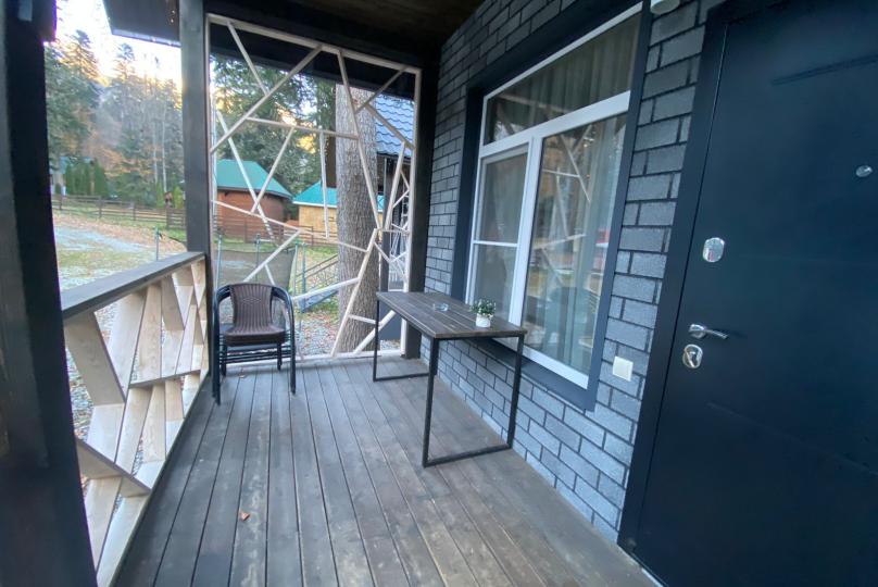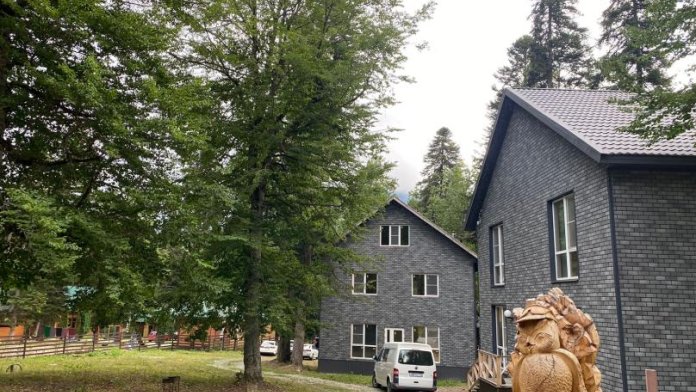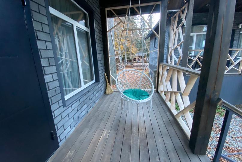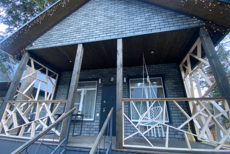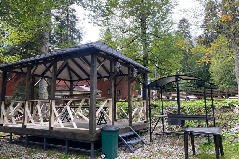 Также на зеленой территории расположены 2 бани, вместимостью до 6-ти и 8-ми человек. Мангальные зоны для всех домиков, собственная беседка для большой виллы. Детская площадка для самых маленьких.