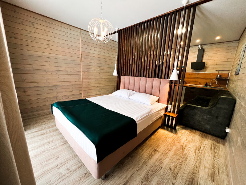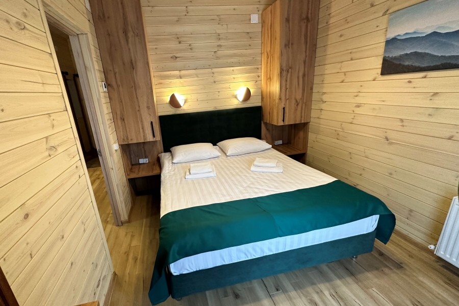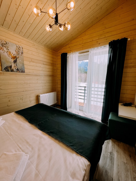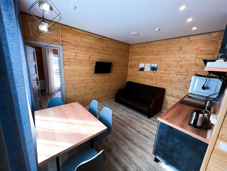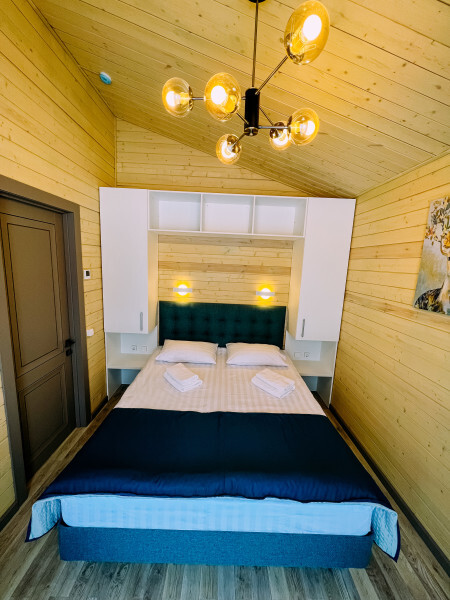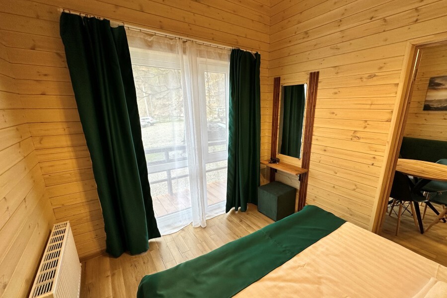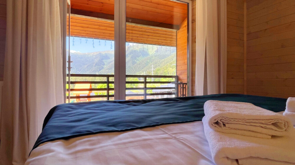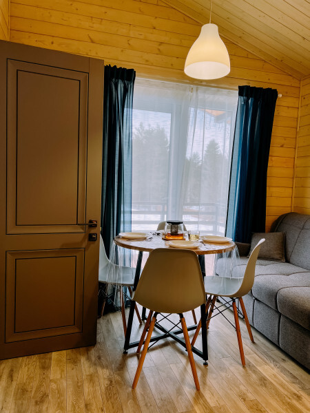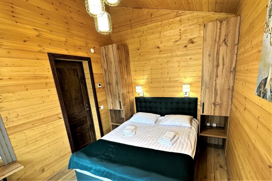В спальной комнате располагается большая двуспальная кровать, в кухне-гостиной раскладной диван на двоих. Панорамное остекление из спальни данного номера, открывает незабываемый вид на Кавказские горы, которыми можно насладиться лежа в теплой постели.
