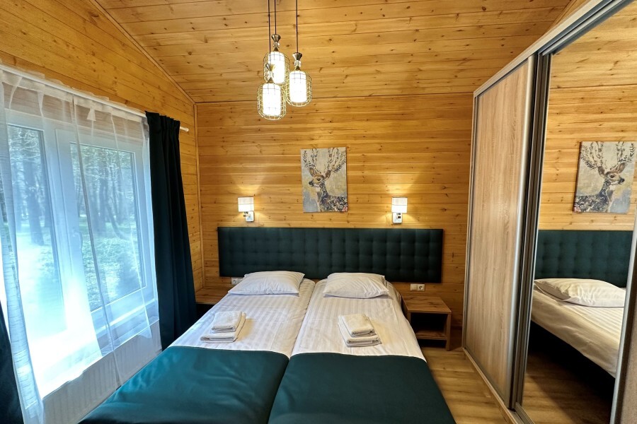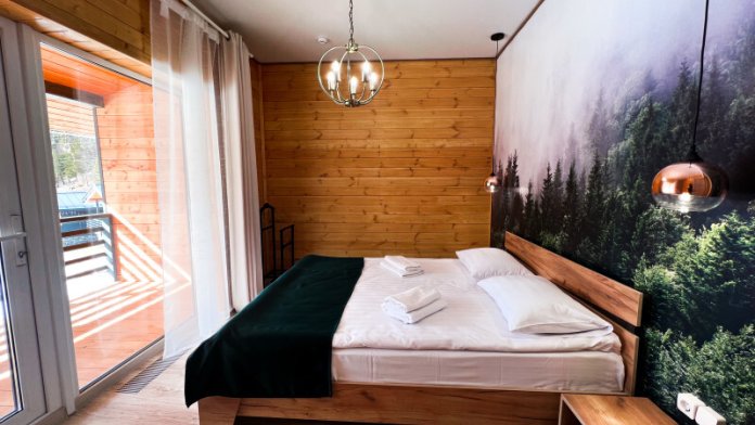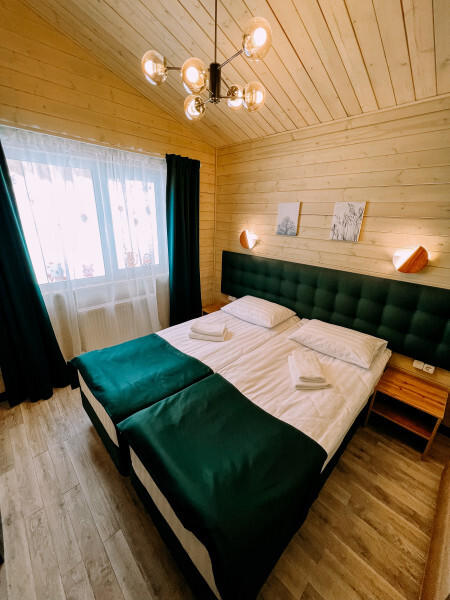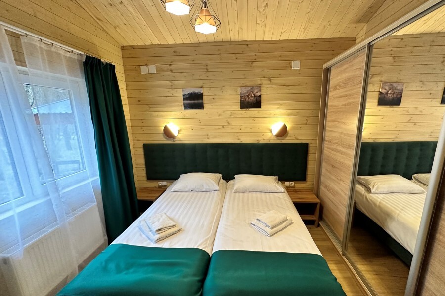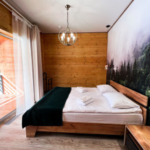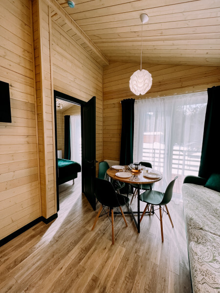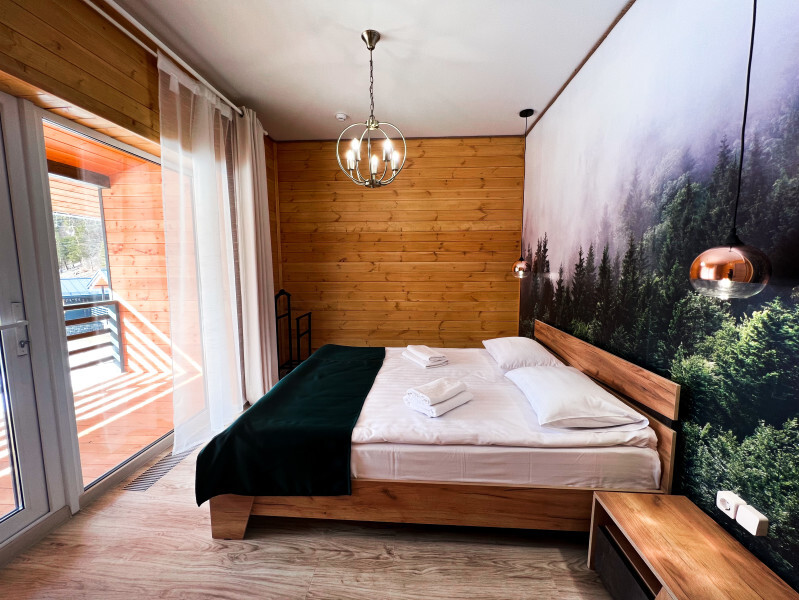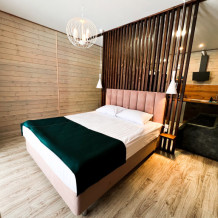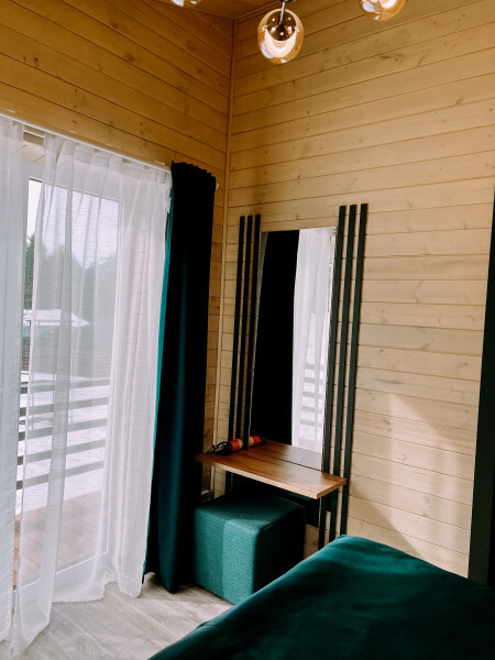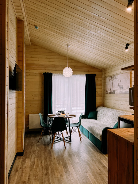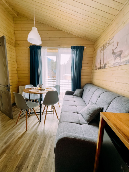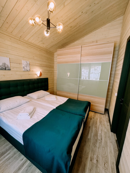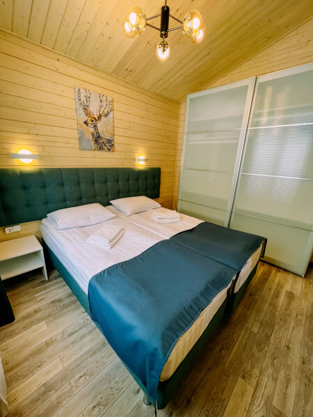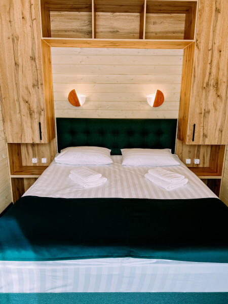 В спальной комнате располагается большая двуспальная кровать, в кухне-гостиной раскладной диван на двоих. Панорамное остекление из спальни данного номера, открывает незабываемый вид на Кавказские горы, которыми можно насладиться лежа в теплой постели.