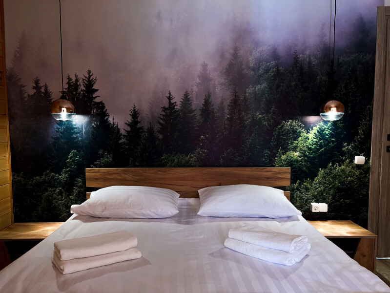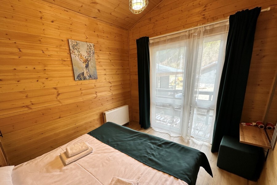 В комнате располагается большая двуспальная кровать и раскладной диван на двоих. Панорамное остекление из данного номера, открывает незабываемый вид на Кавказские горы, которыми можно насладиться лежа в теплой постели.