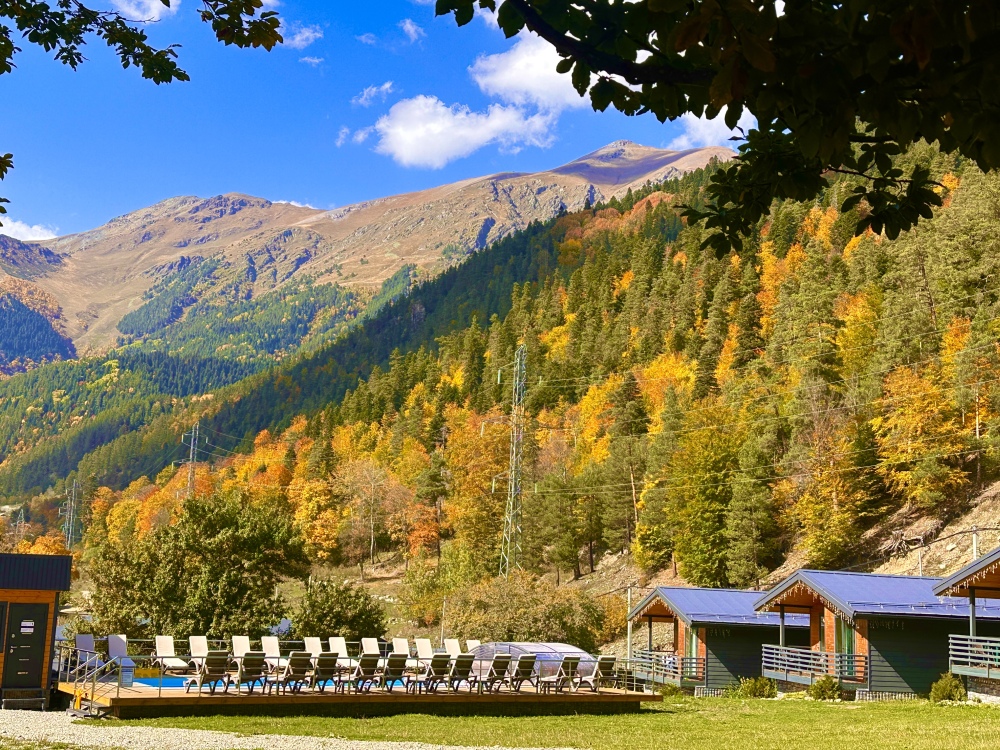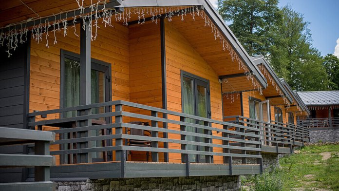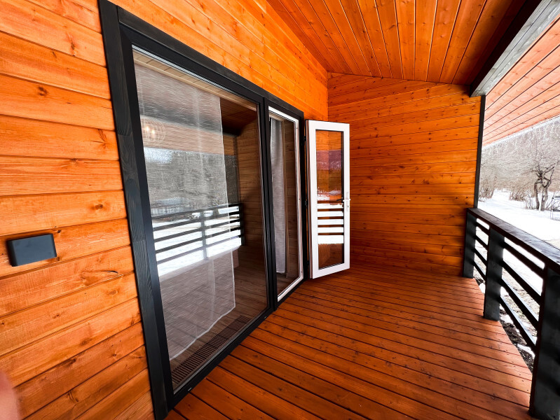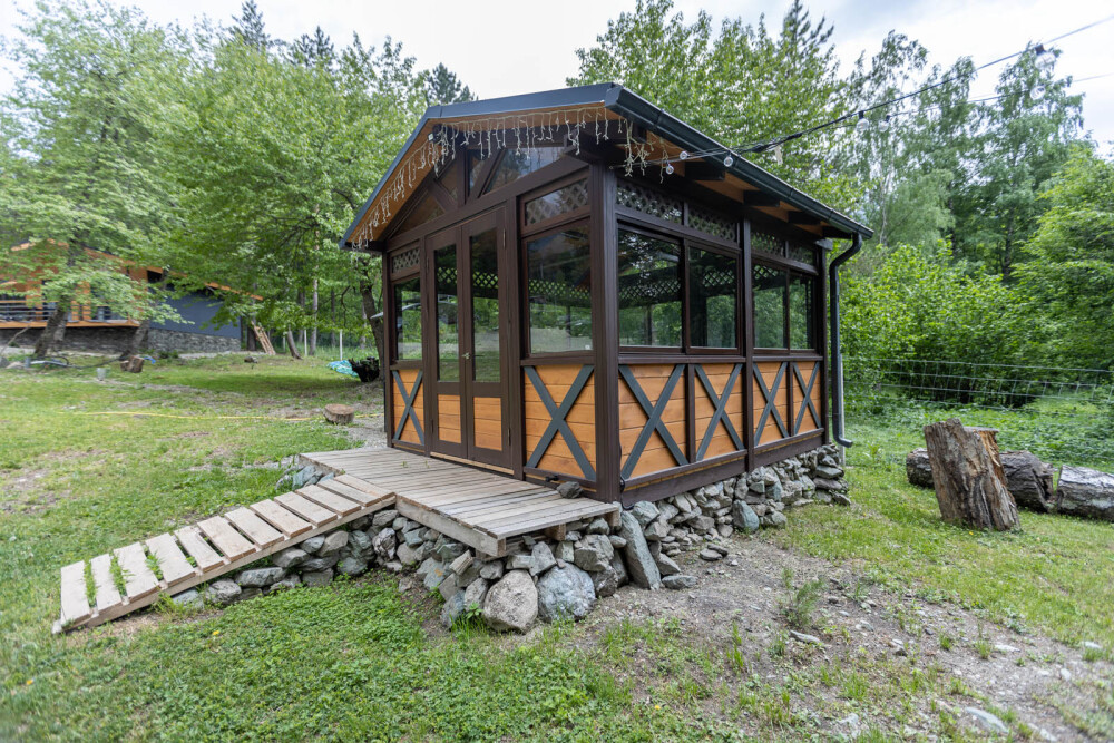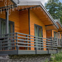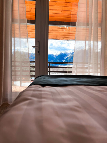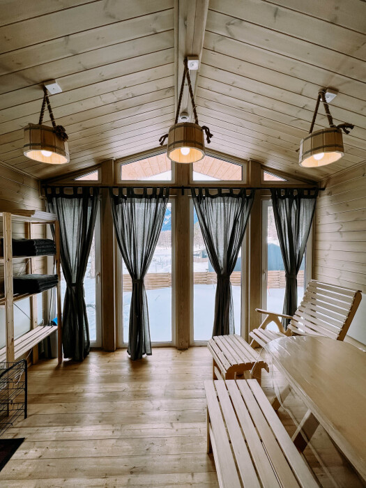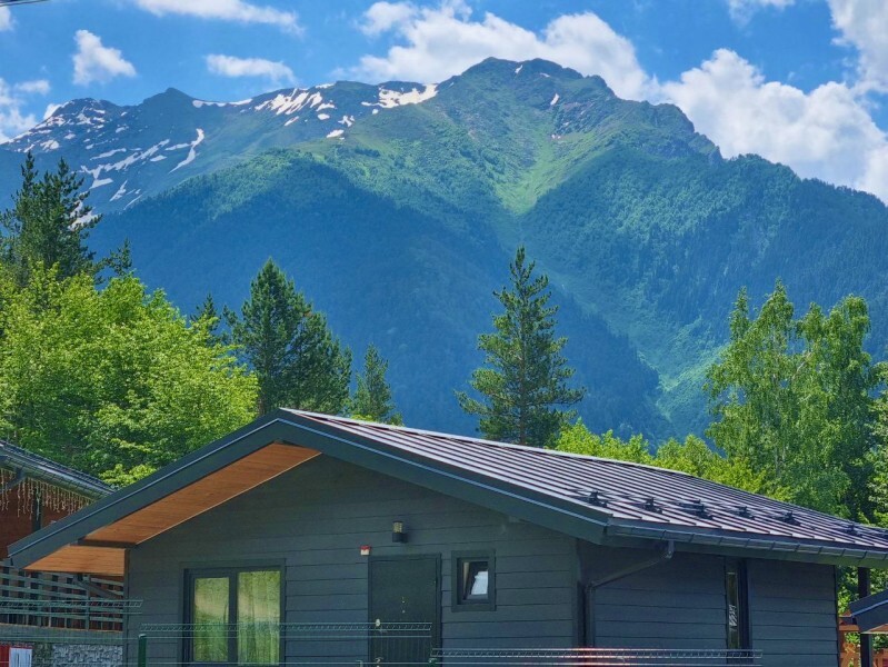 В каждом шале своя мебелированная терраса, а так же панорамное остекление. Из всех домов открывается потрясающий вид на горы.