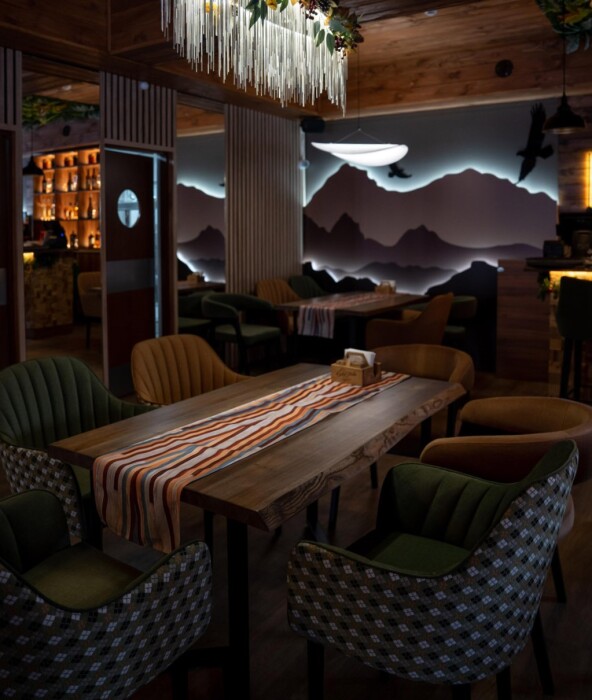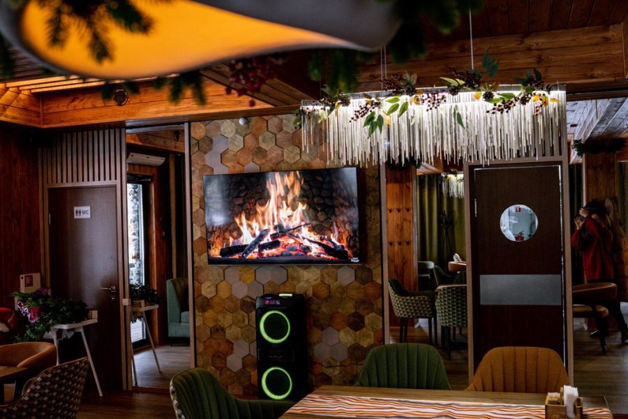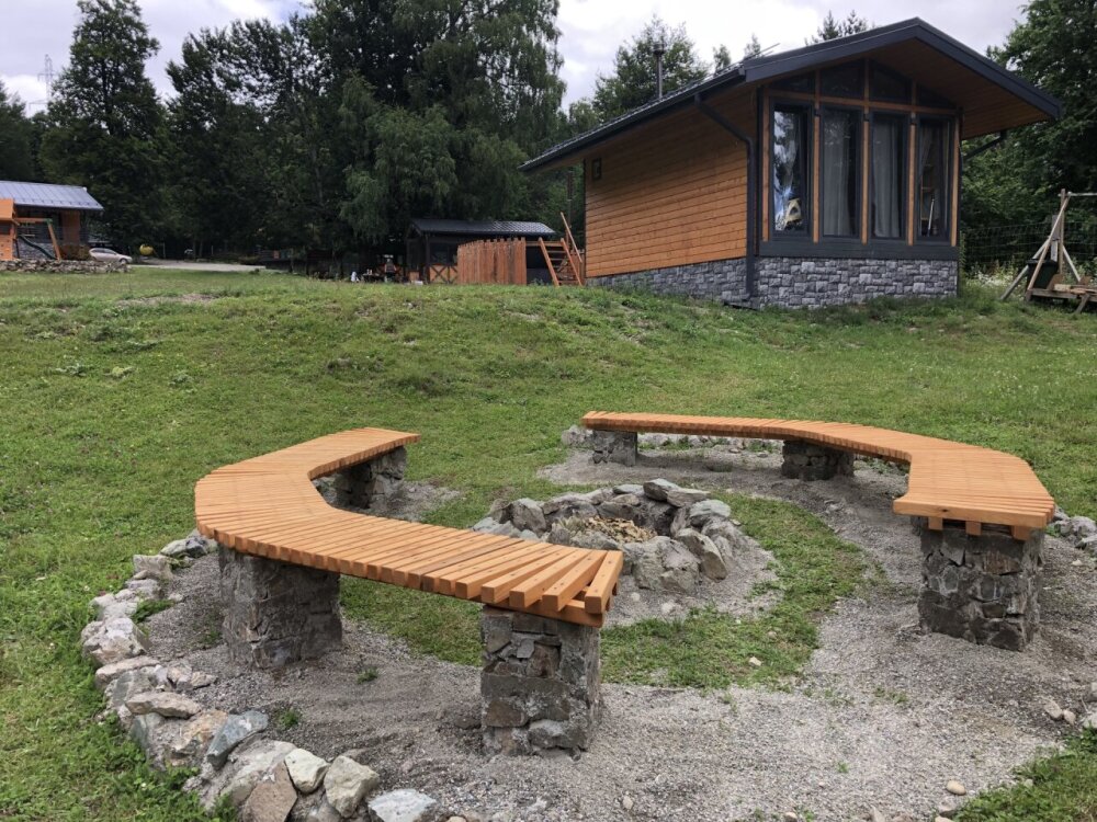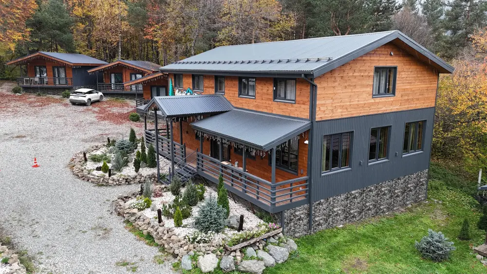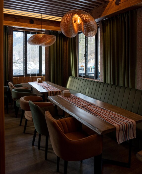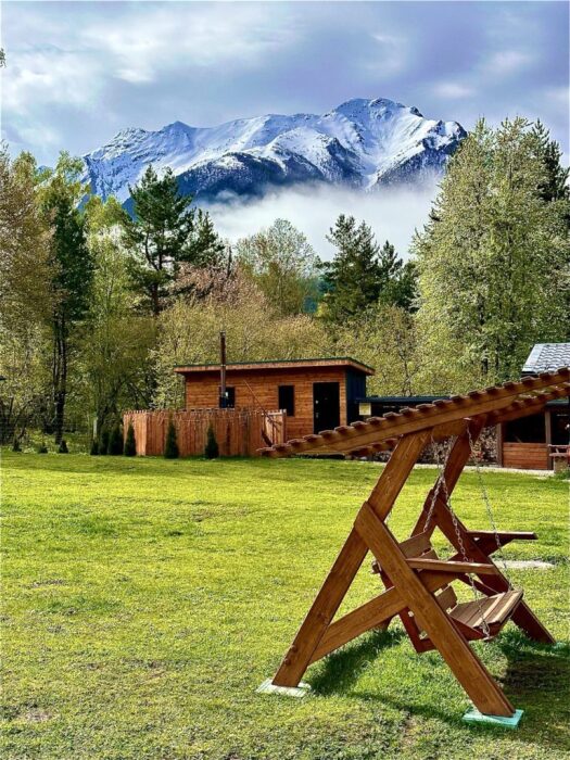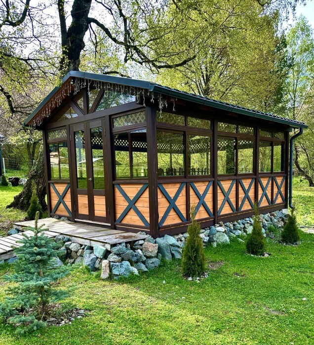 В каждом шале своя мебелированная терраса, а так же панорамное остекление. Из всех домов открывается потрясающий вид на горы.