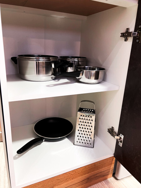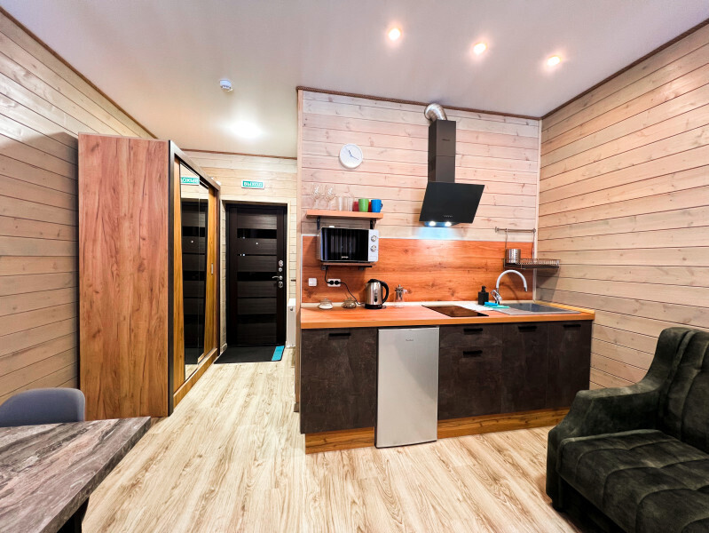 Номер оснащен полноценной кухонной зоной и всем необходимым для приготовления пищи инвентарем.