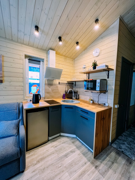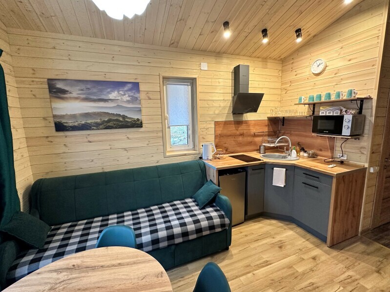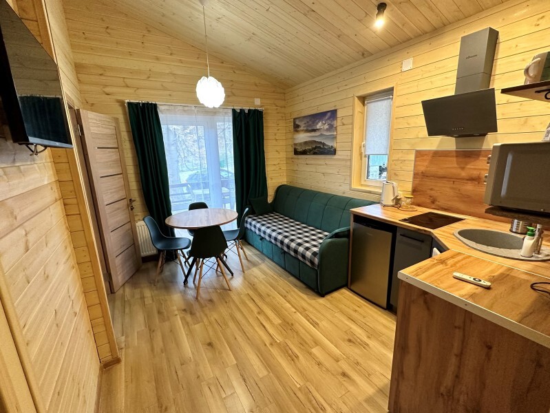 Шале оснащен полноценной кухней, с варочной панелью, холодильником, микроволновой печью и всей необходимой посудой для приготовления пищи.