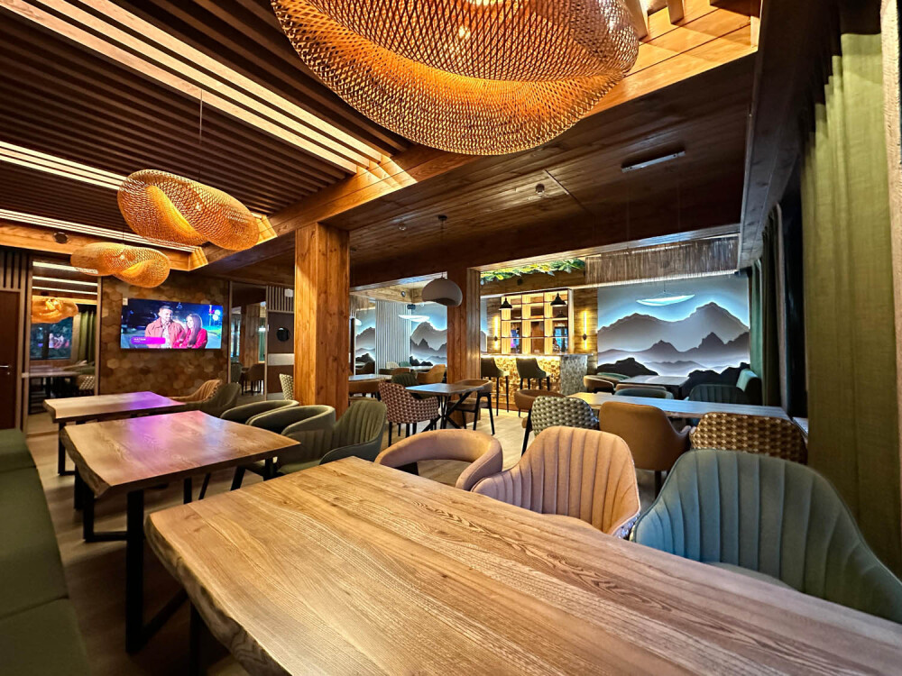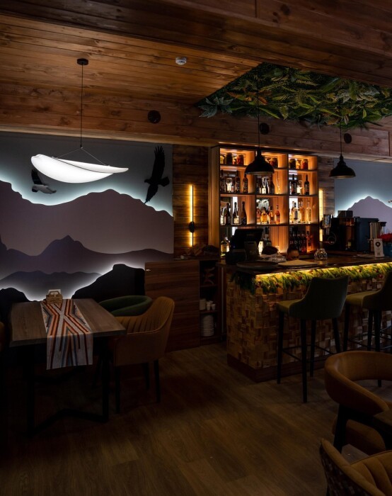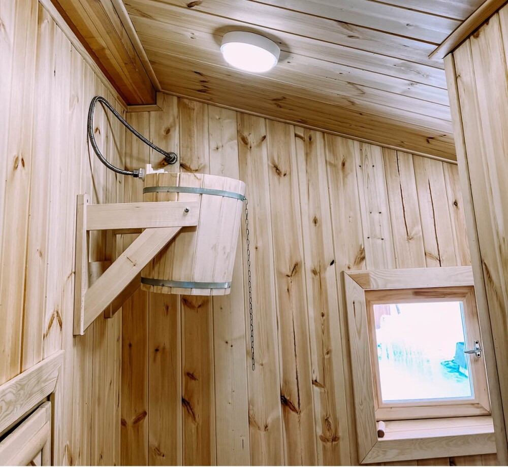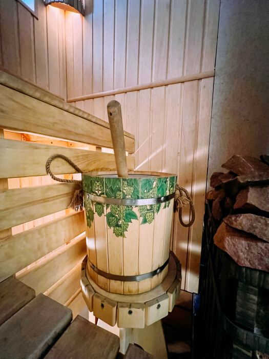- банный комплекс (вместимость 6-8 человек): терраса, спа-купель с теплой водой, подсветкой и аэрацией, холодная купель, обливное устройство, комната отдыха, горный чай, мед, посуда, полотенца, простыни, тапочки, шапочки, санузел, душевая, веники за дополнительную плату;