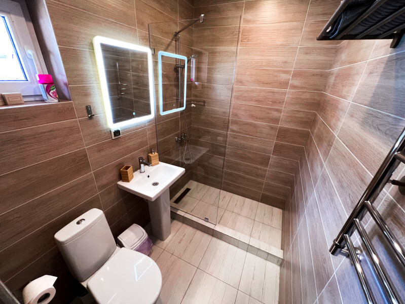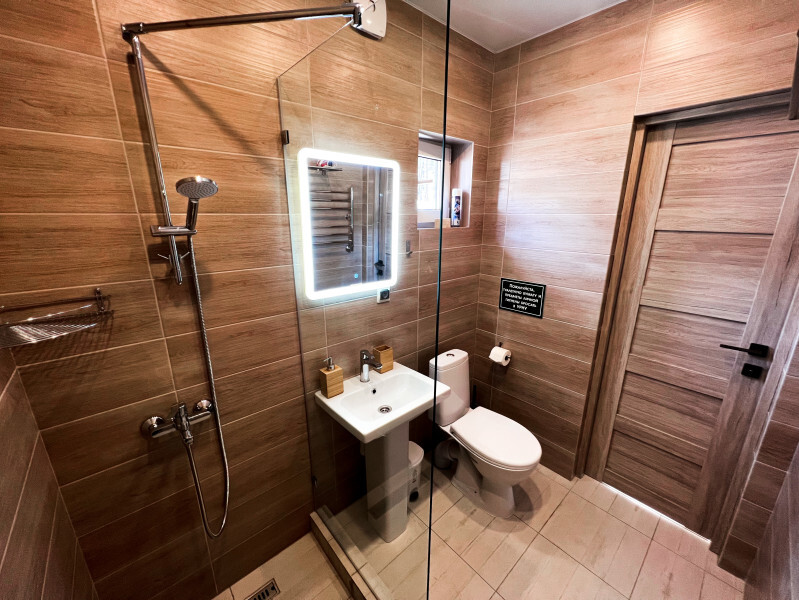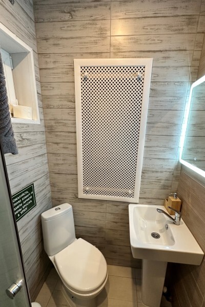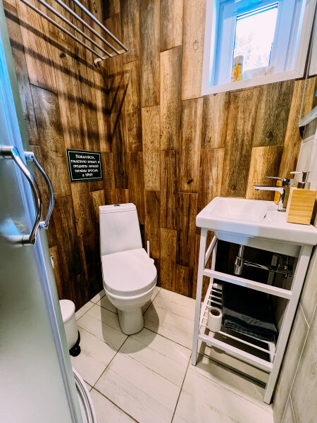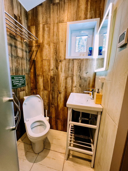 В санузле - душ, раковина, унитаз, полотенцесушитель и средства личной гигиены.