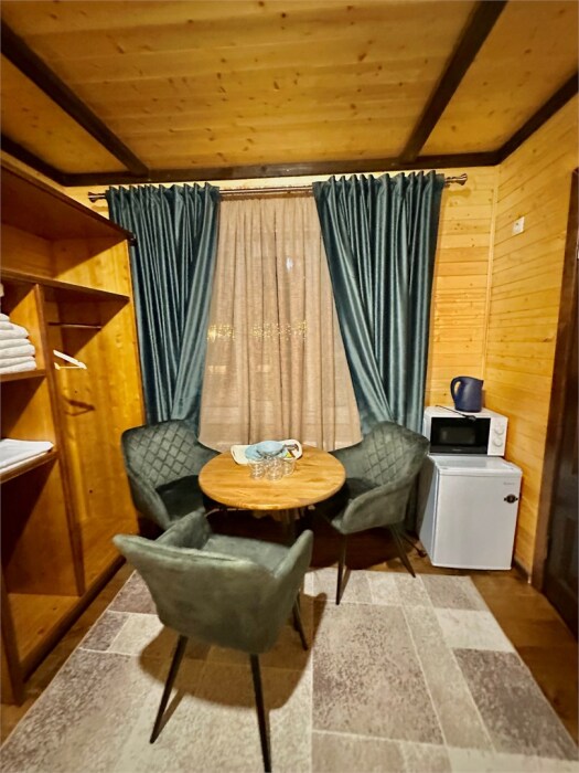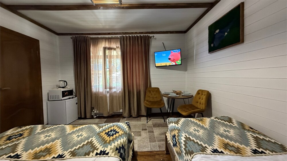 Имеется телевизор, шкаф, вешалка, анти-москитная сетка, плотные шторы, отопление, журнальный столик, чайник, холодильник, свч-печь, стол обеденный, стулья, мини кухня, посуда, корзина для мусора.