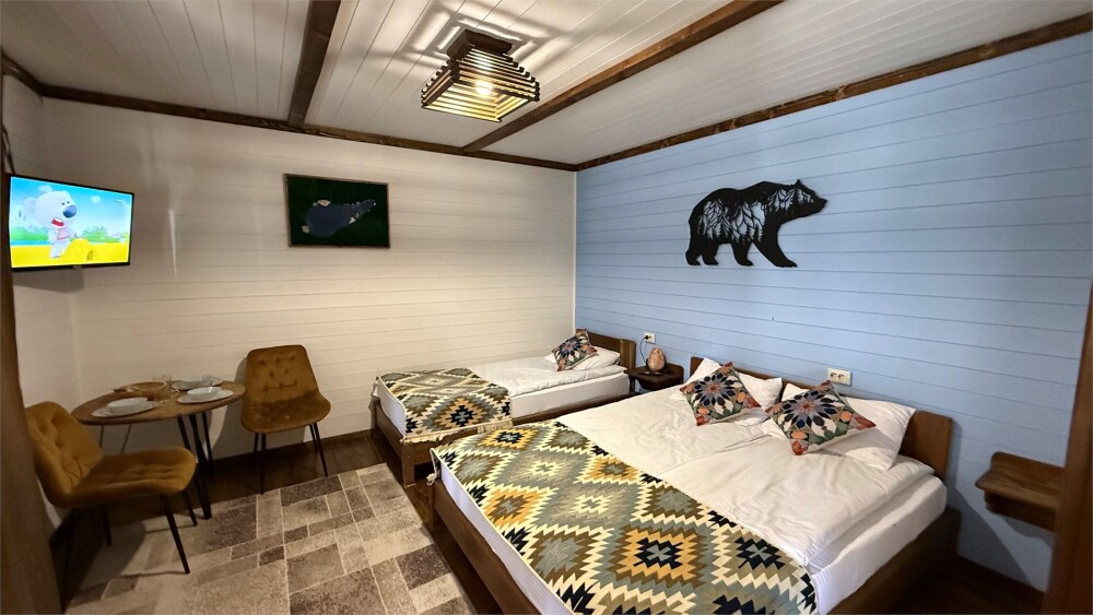 В номере: 1 двуспальная кровать, 3 односпальных кровати.