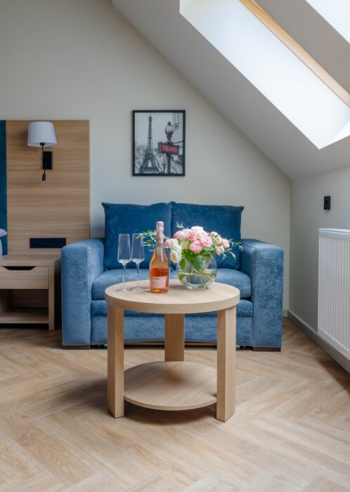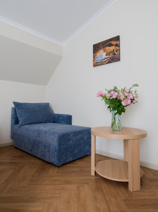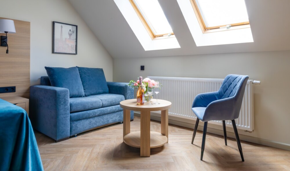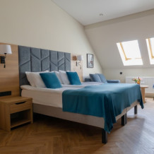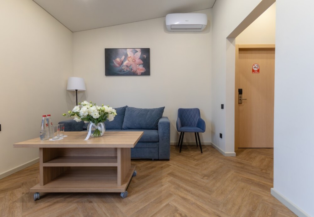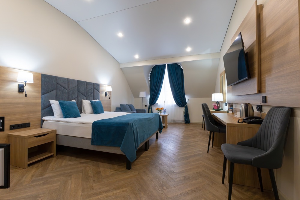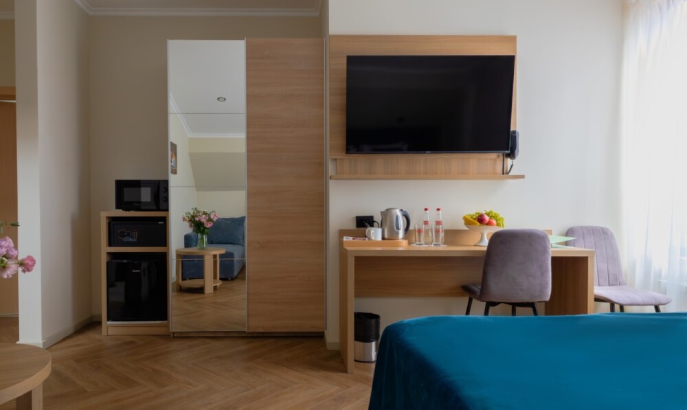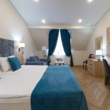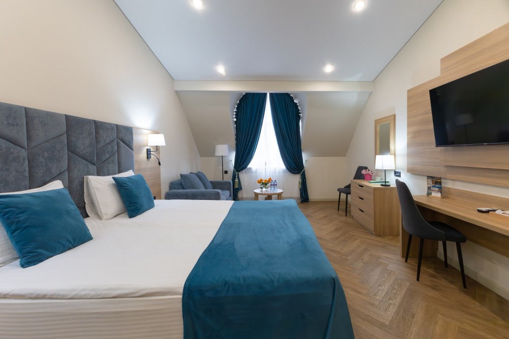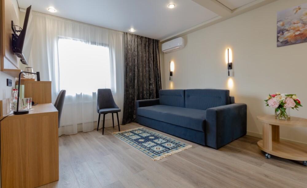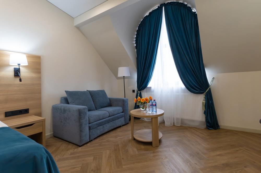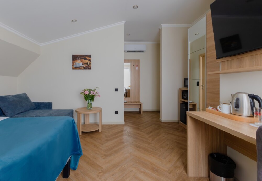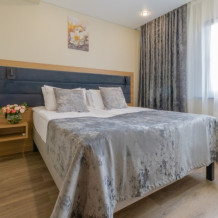 Просторный, однокомнатный номер, высшей категории, позволяющий с комфортом разместить от одного до трех гостей. В номере находится двуспальная кровать, с ортопедическим матрасом, удобными подушками, одеялами и диван-кровать.