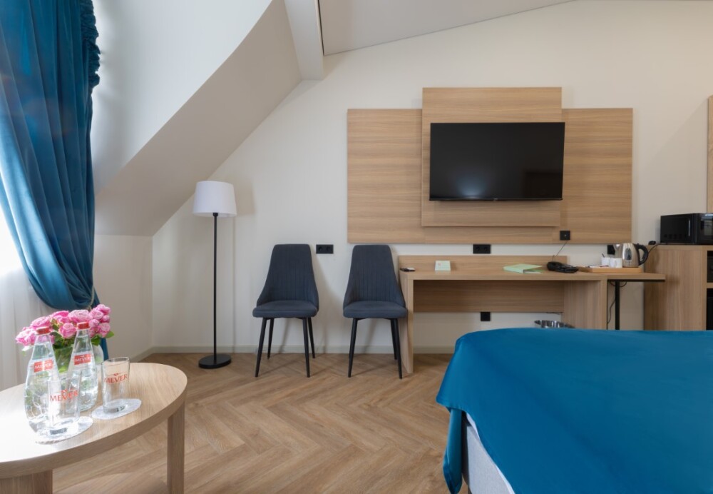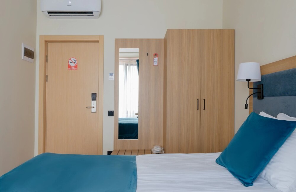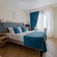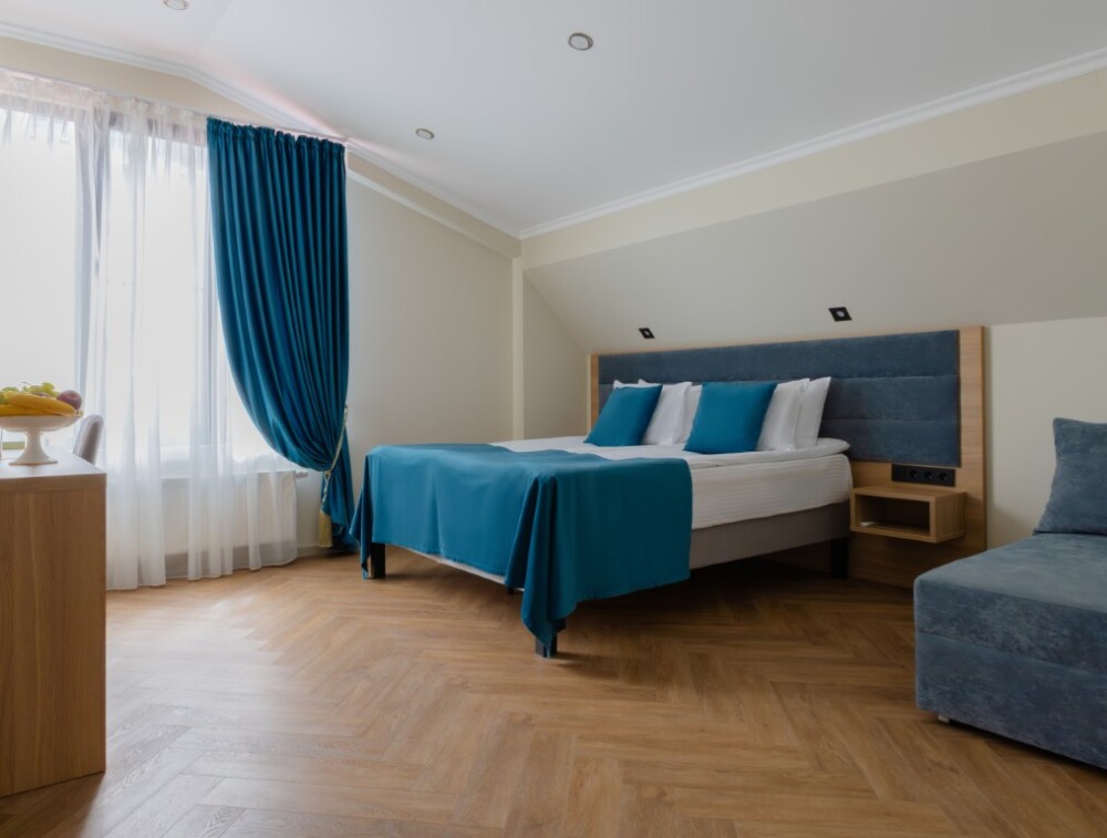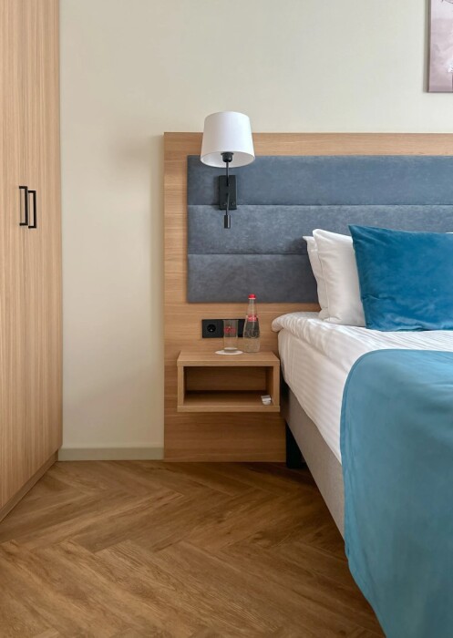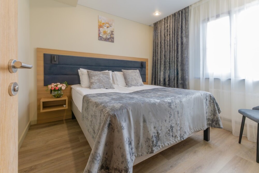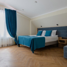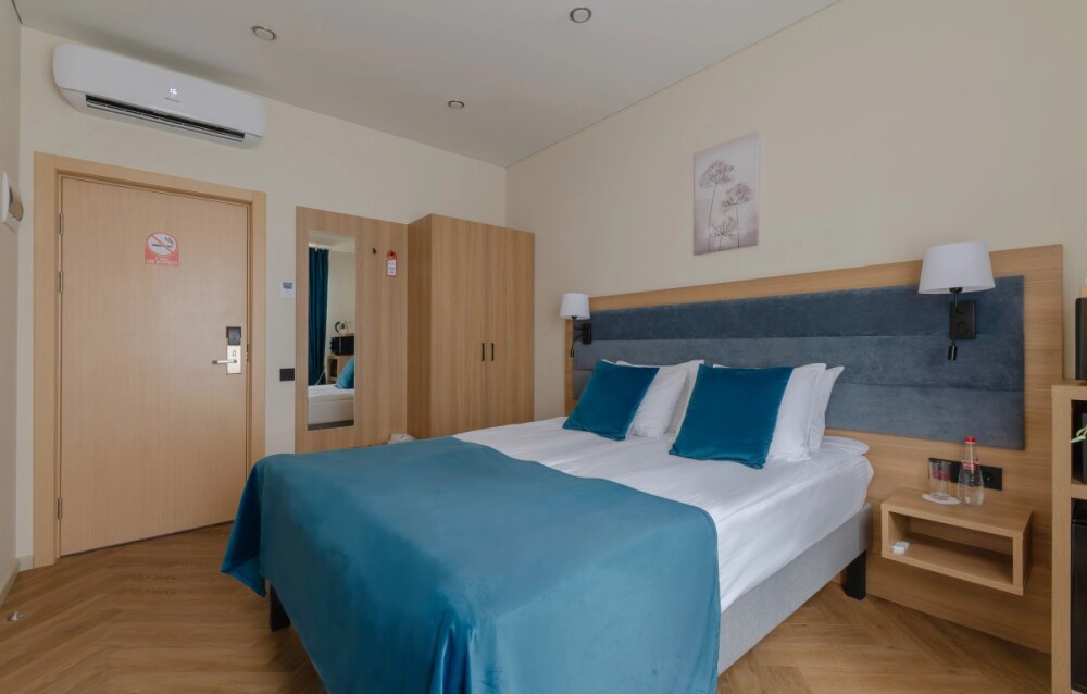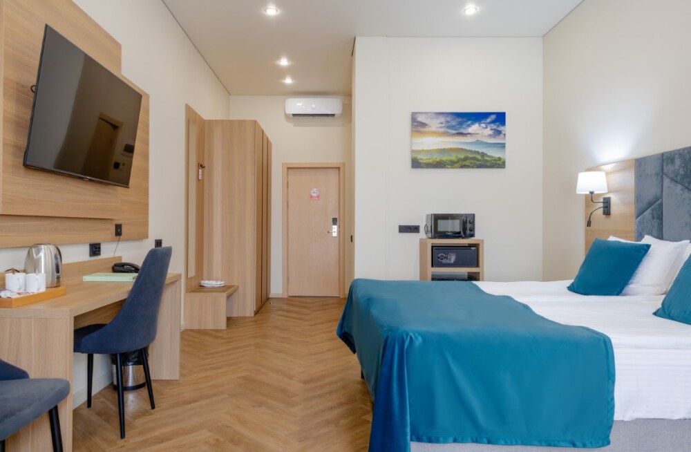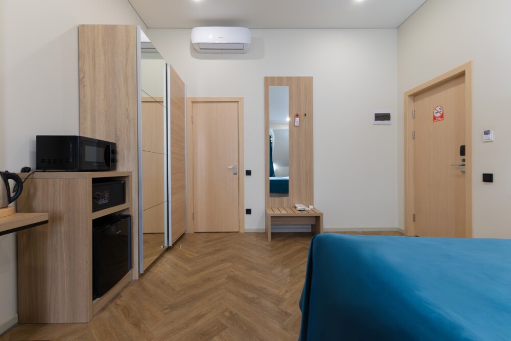 Просторный номер для размещения одного, двух, трех или четырёх гостей. Включает в себя: одну двуспальную или две односпальные кровати с ортопедическим матрасом, удобными подушками, одеялами. Комплект постельного белья высокого качества из натуральных материалов. Тв, холодильник, бесплатный wi-fi, микроволновая печь, кондиционер, телефон, сейф, регулируемое отопление, шкаф, зеркало и прикроватные тумбы.
