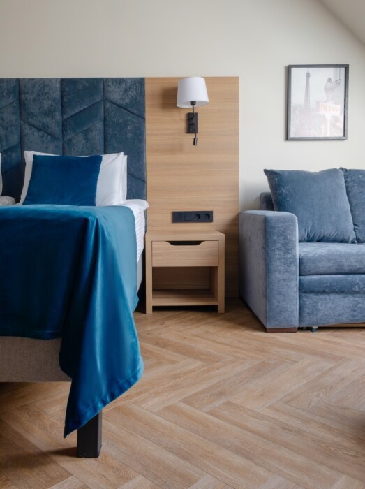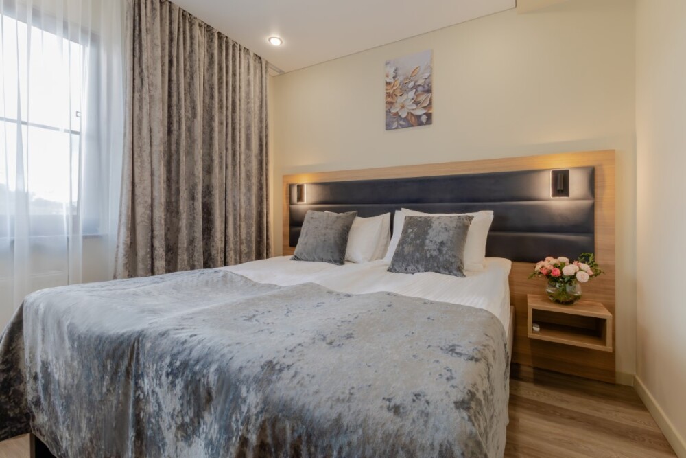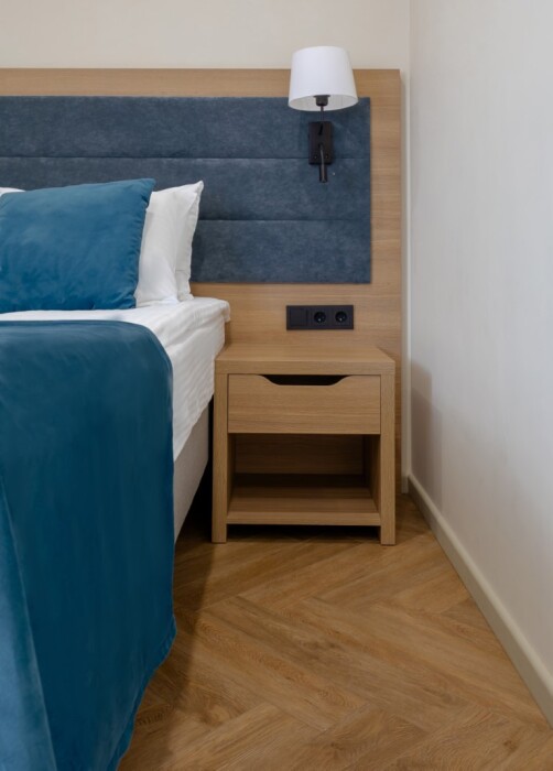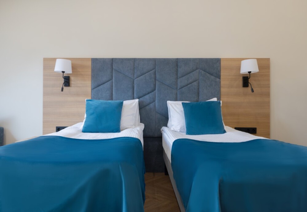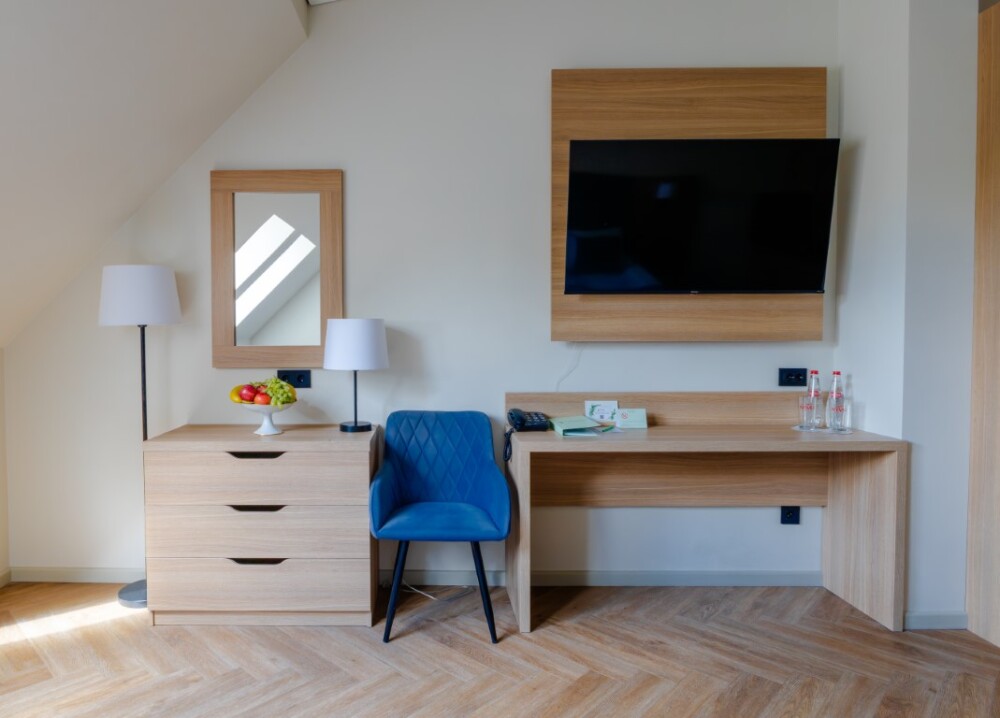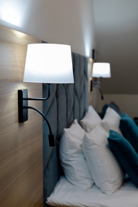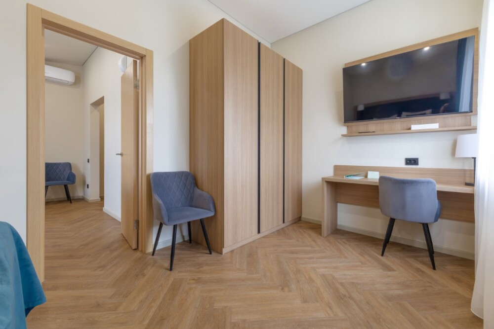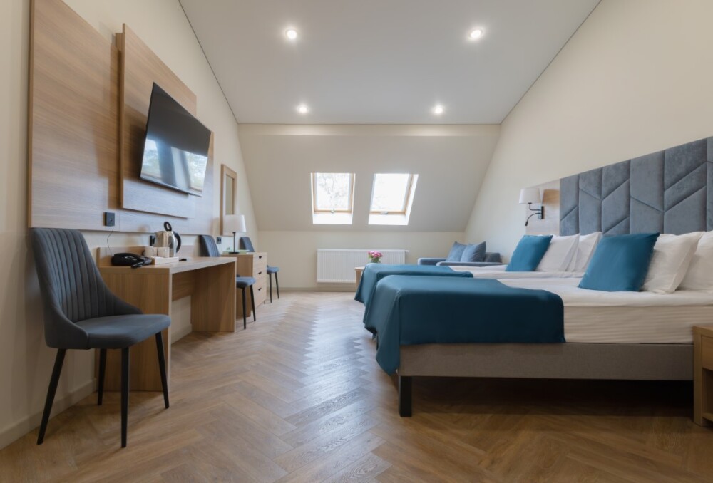 Просторный номер для размещения одного, двух, трех или четырёх гостей. Включает в себя: одну двуспальную или две односпальные кровати с ортопедическим матрасом, удобными подушками, одеялами. Комплект постельного белья высокого качества из натуральных материалов. Тв, холодильник, бесплатный wi-fi, микроволновая печь, кондиционер, телефон, сейф, регулируемое отопление, шкаф, зеркало и прикроватные тумбы.