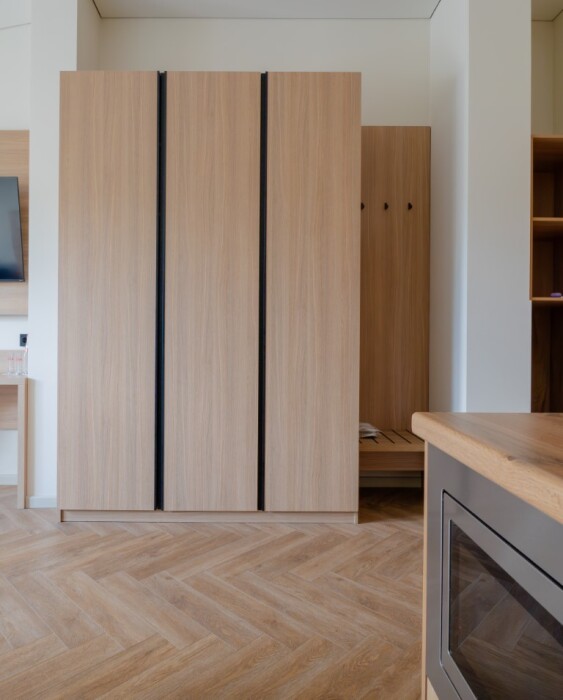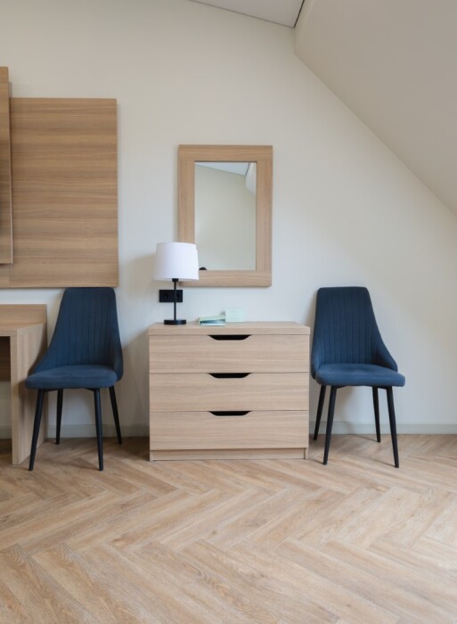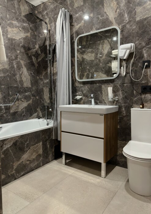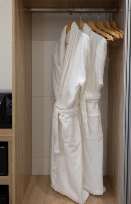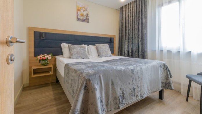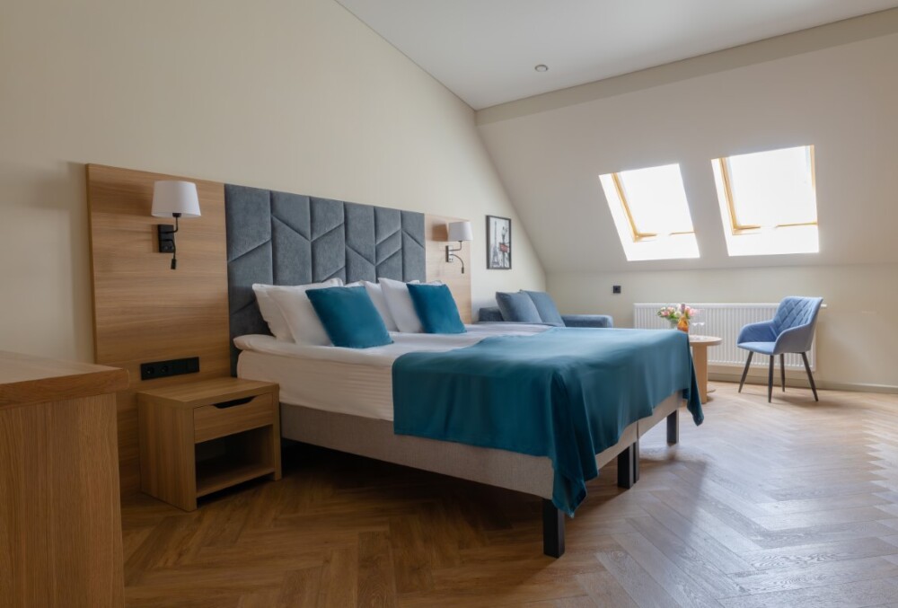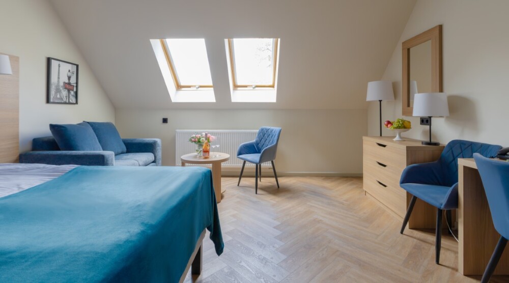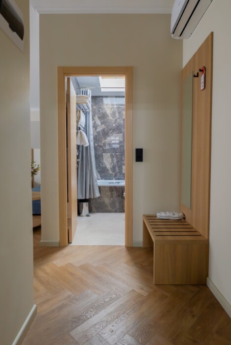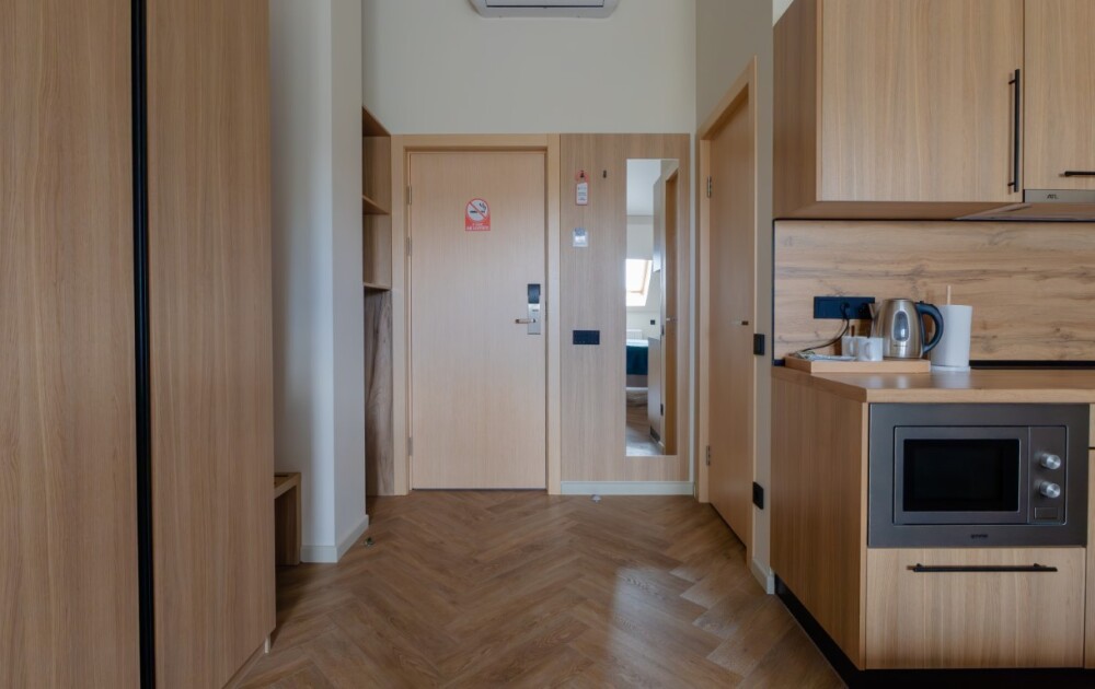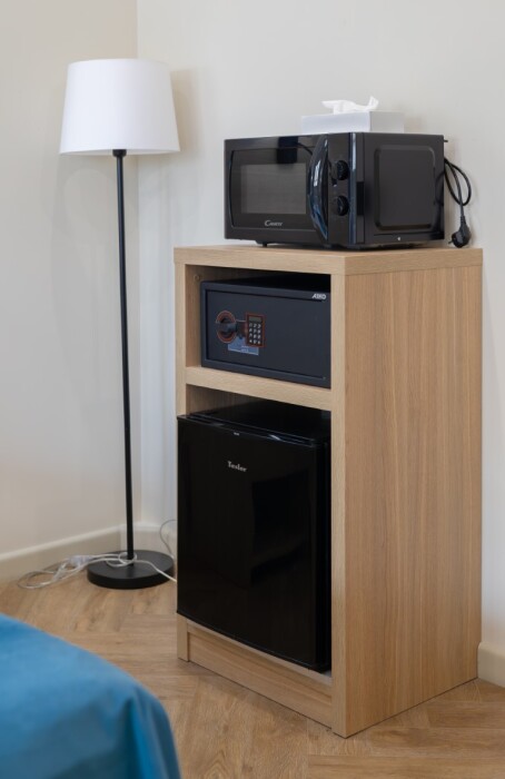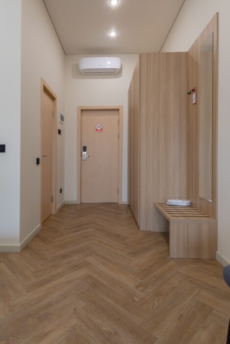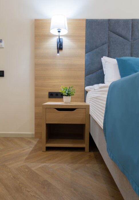 Просторный номер для размещения одного, двух, трех или четырёх гостей. Включает в себя: одну двуспальную или две односпальные кровати с ортопедическим матрасом, удобными подушками, одеялами. Комплект постельного белья высокого качества из натуральных материалов. Тв, холодильник, бесплатный wi-fi, микроволновая печь, кондиционер, телефон, сейф, регулируемое отопление, шкаф, зеркало и прикроватные тумбы.