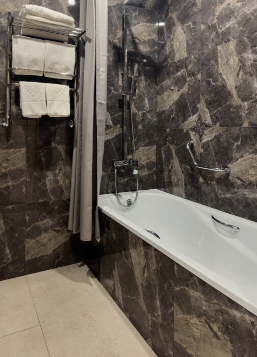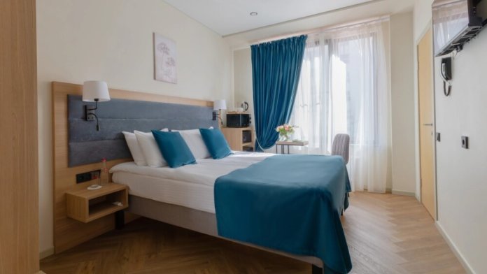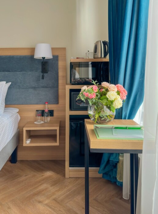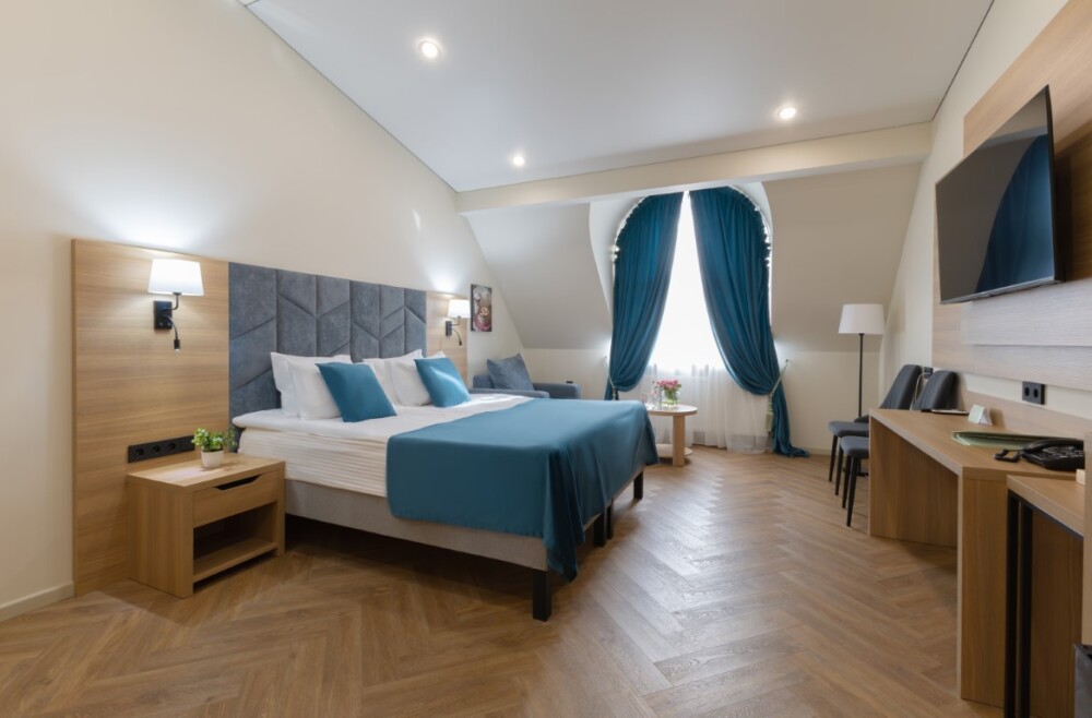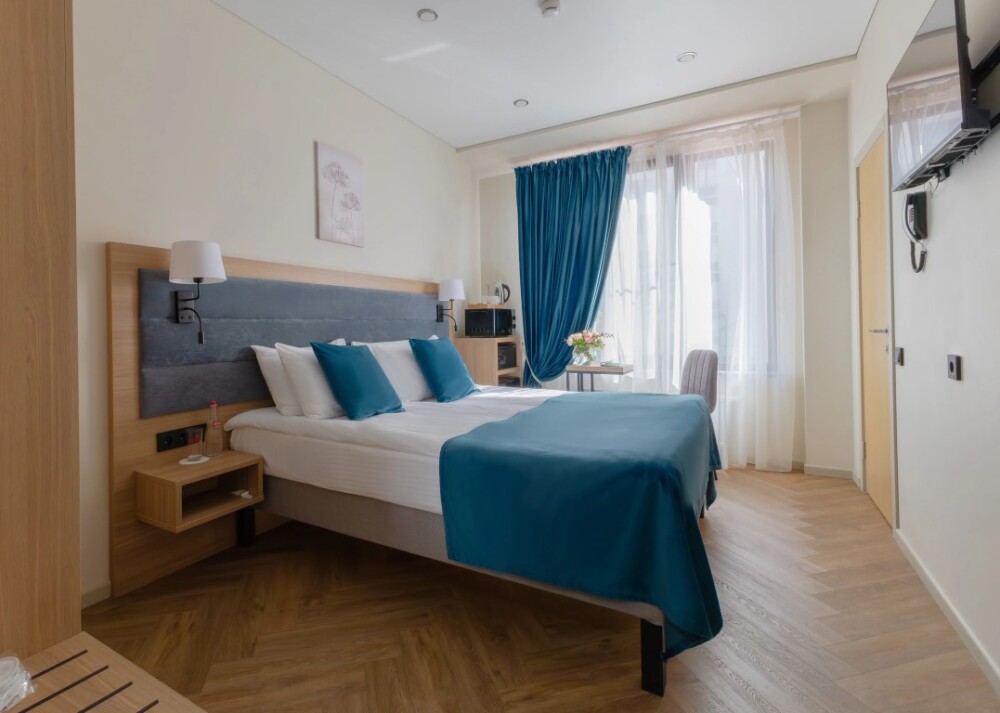 Небольшой, но уютный номер категории стандарт включает в себя: полутора спальную кровать размером 160*200, с ортопедическим матрасом, удобными подушками, одеялами. Комплект постельного белья высокого качества из натуральных материалов. Ванная комната оборудована удобной ванной и всеми необходимыми средствами личной гигиены. ТВ, холодильник, бесплатный wi-fi, микроволновая печь, кондиционер, телефон, сейф, регулируемое отопление, шкаф, зеркало и прикроватные тумбы.