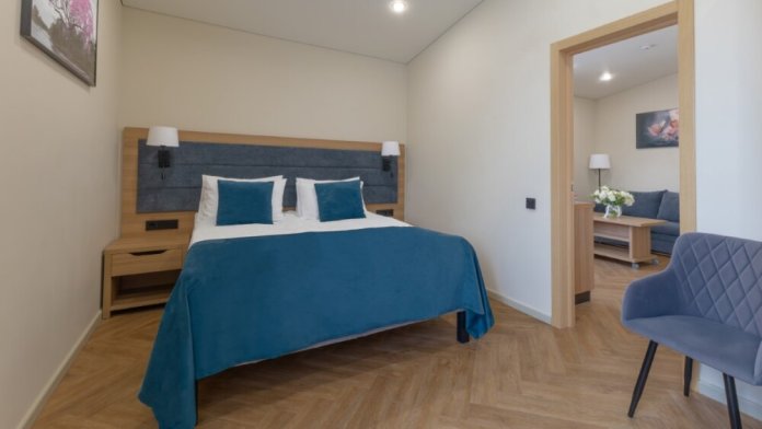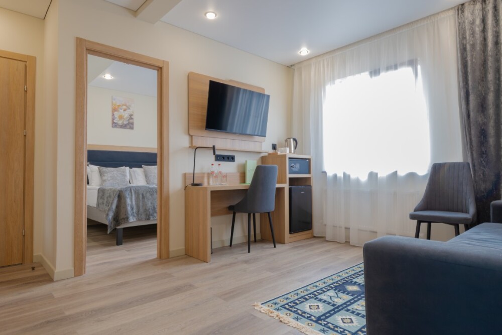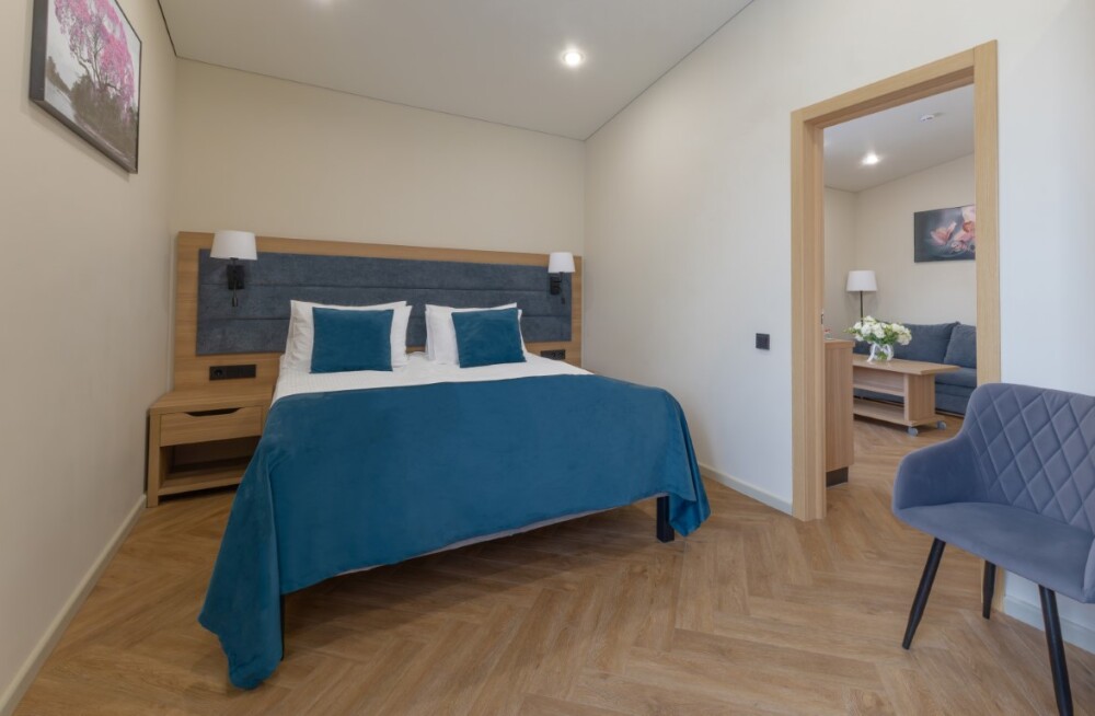 Просторный, двухкомнатный номер, высшей категории, состоящий из двух спален, гостиной и кухни, позволяющий с комфортом разместить гостей. В спальне находится двуспальная кровать, с ортопедическим матрасом удобными подушками, одеялами.