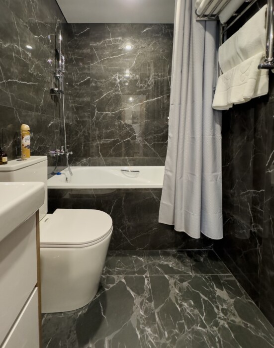 Санузел оснащен ванной, представлен набор туалетных принадлежностей и полотенец
