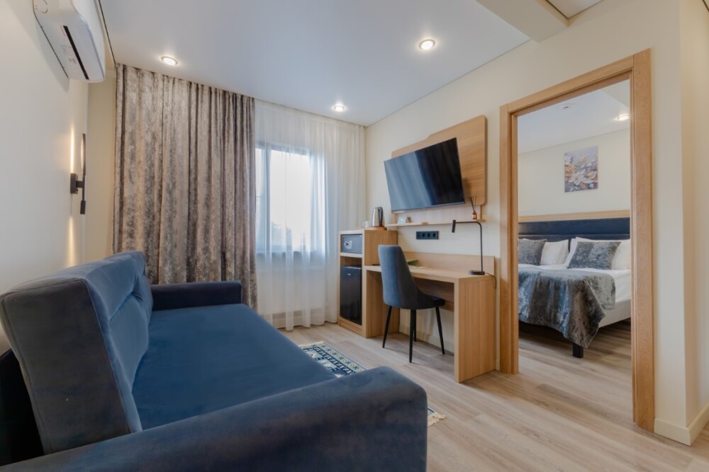 Номер повышенной комфортности, для одного, двух, трех гостей. В номере: одна двуспальная кровать и диван-кровать. Ортопедические матрасы, качественное постельное бельё, удобные подушки и одеяла. Прикроватные тумбочки, зеркало, сейф, телефон, шкаф, ТВ, холодильник, микроволновая печь, кондиционер, посуда.
