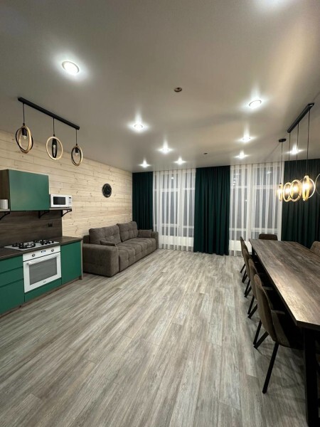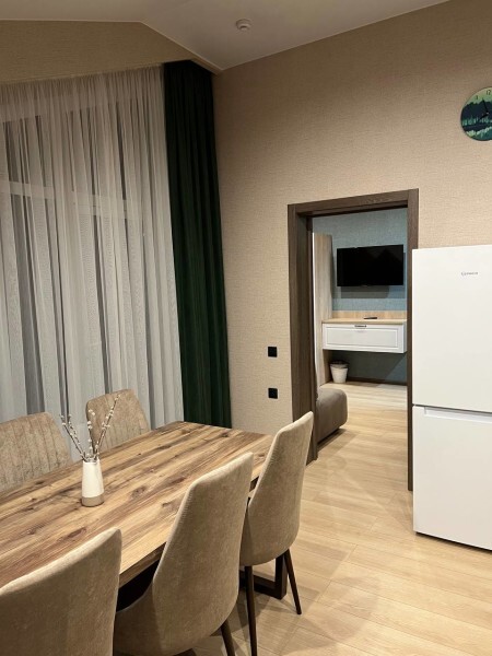 В номере: двуспальная кровать, два двуспальных дивана, кресло-кровать, полностью укомплектованная кухня с обеденным столом, tv, шкафы, санузел с туалетно-косметическими принадлежностями, балкон.
