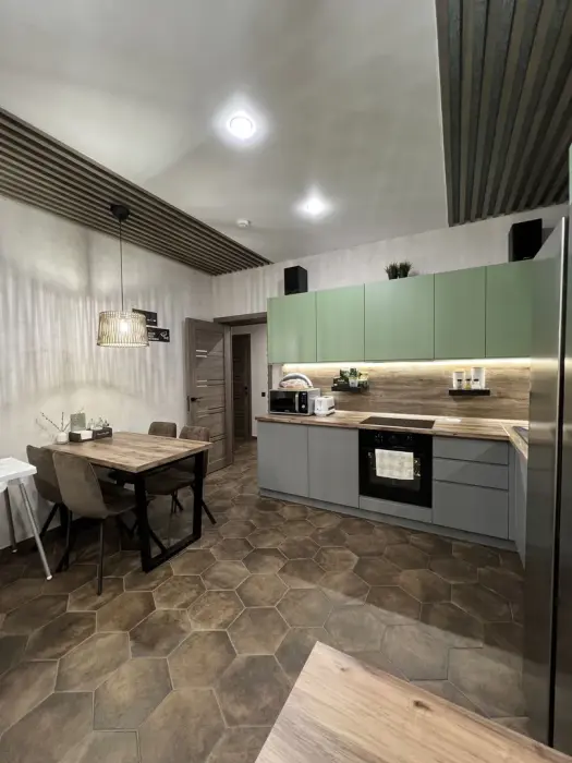 Кухня оборудована техникой: холодильник, микроволновая печь, чайник, тостер, посудомойка, телевизор со Smart TV. Обеденная зона, посуда для готовки. Из кухни выход на открытую террасу 12 м2 /под крышей, не застекленная, оборудованная обеденной зоной.