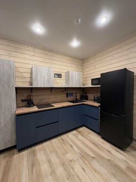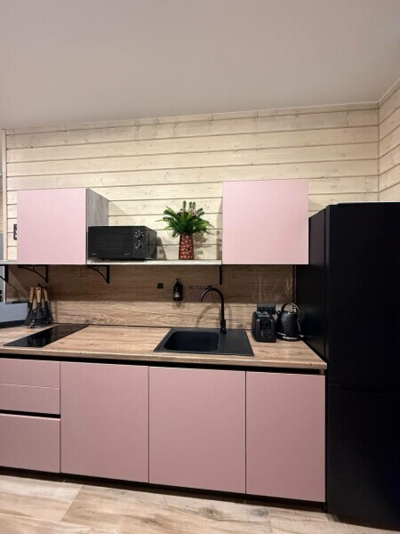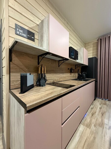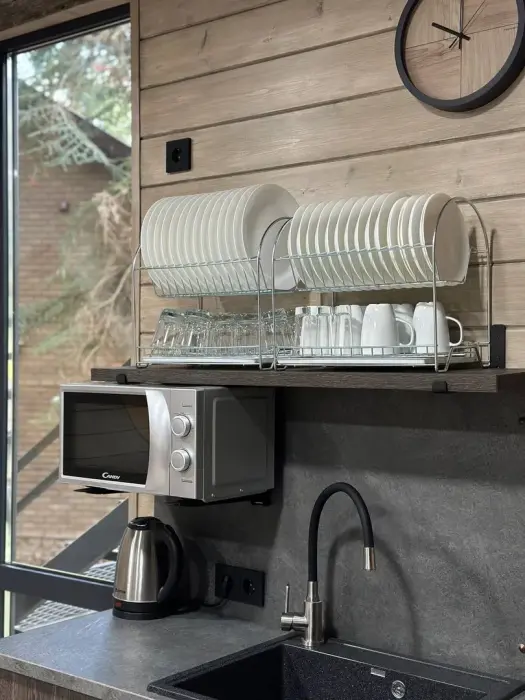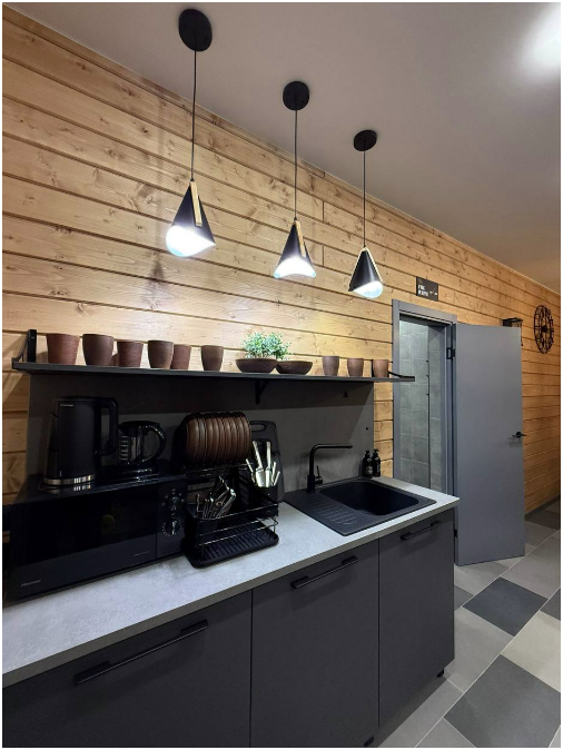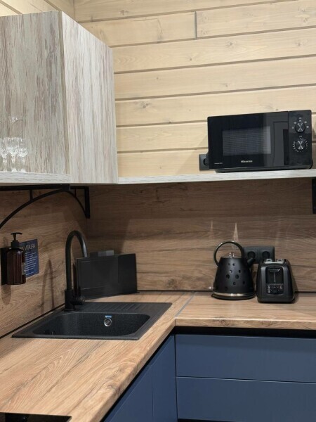 Кухня оборудована техникой: холодильник, микроволновая печь, чайник, тостер, посудомойка, телевизор со Smart TV. Обеденная зона, посуда для готовки и сервировки, раскладной диван. Из кухни выход на открытую террасу 12 м2 /под крышей, не застекленная, оборудованная обеденной зоной.