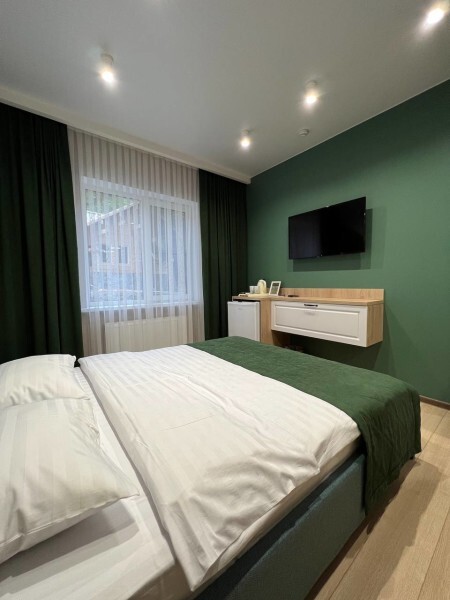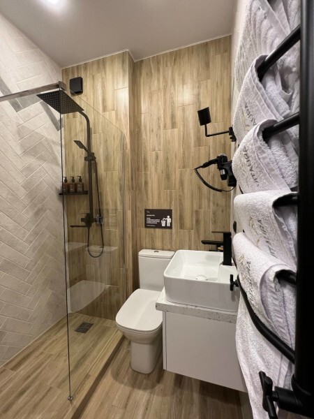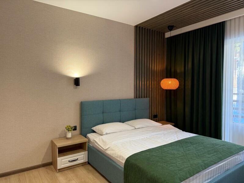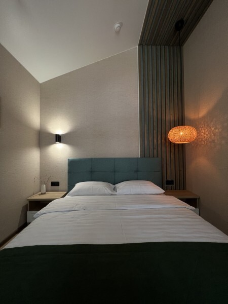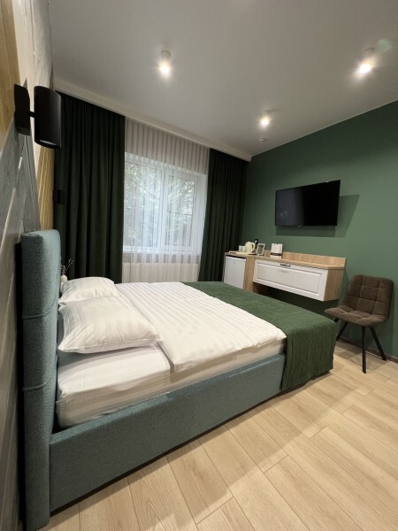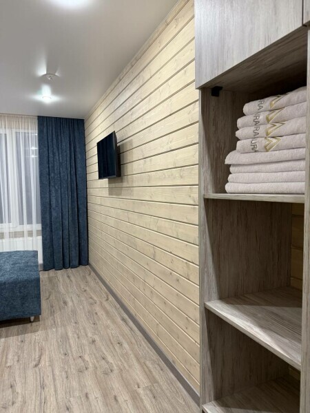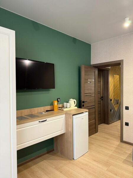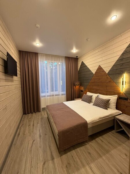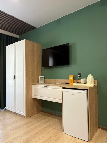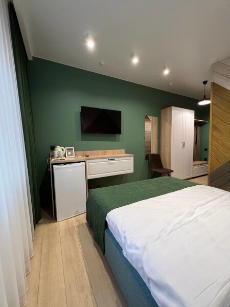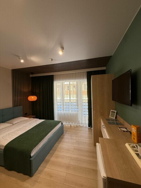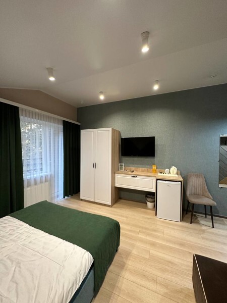 В номере: двуспальная кровать, холодильник, электрический чайник, TV, прикроватные тумбочки, шкаф, мини-комод, стул, санузел с душем и феном, туалетно-косметические принадлежности, полотенца, халаты, тапочки.
