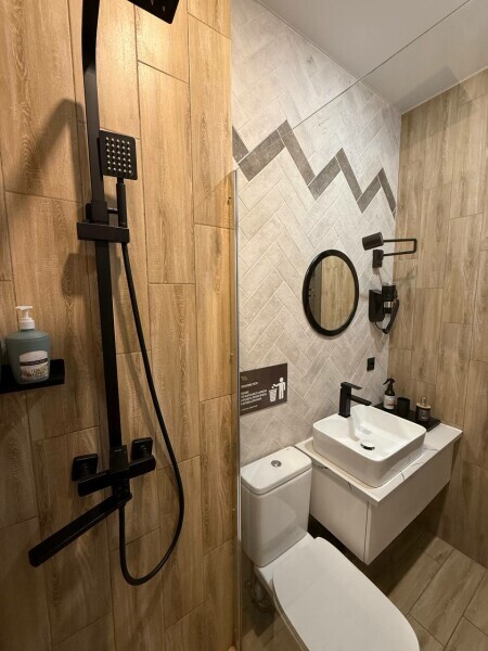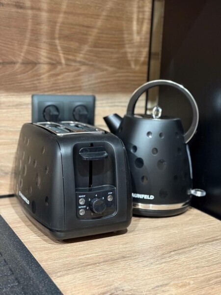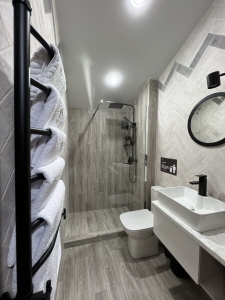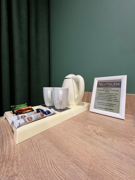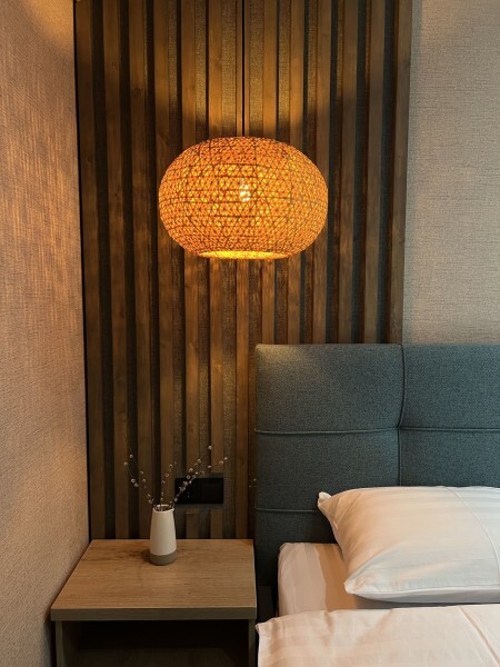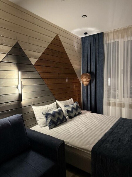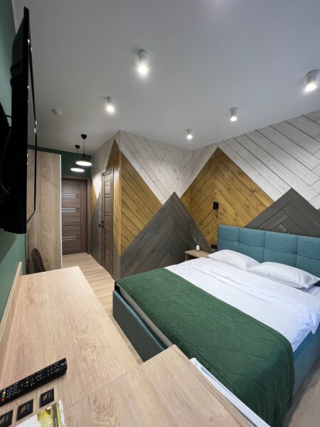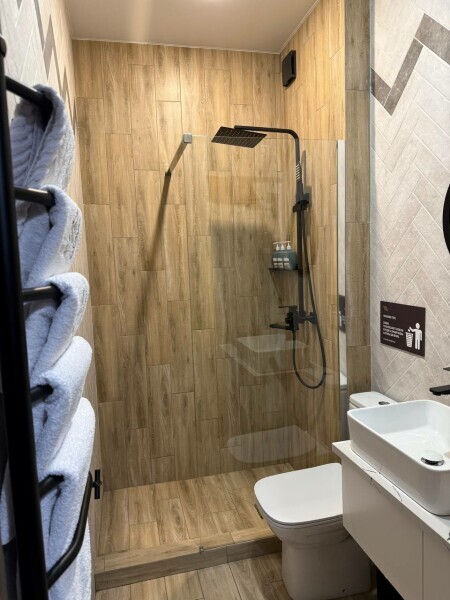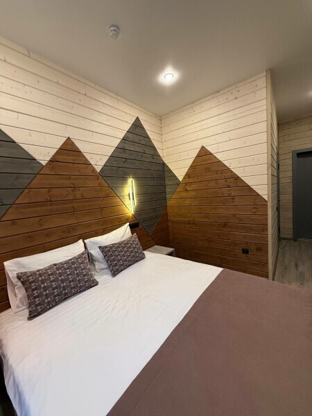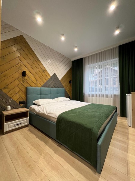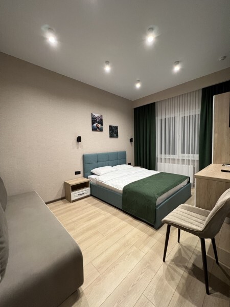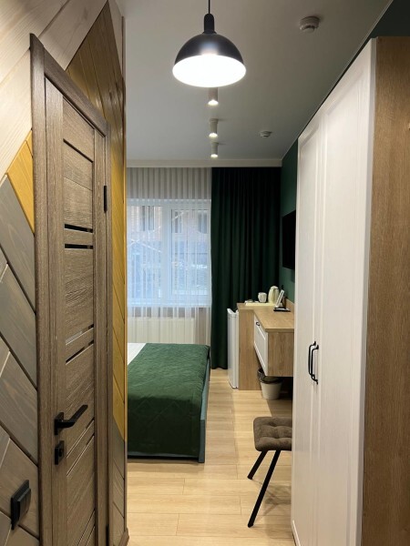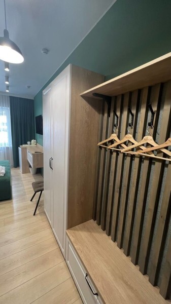 В номере: двуспальная кровать, холодильник, электрический чайник, TV, прикроватные тумбочки, шкаф, мини-комод, стул, санузел с душем и феном, туалетно-косметические принадлежности, полотенца, халаты, тапочки.