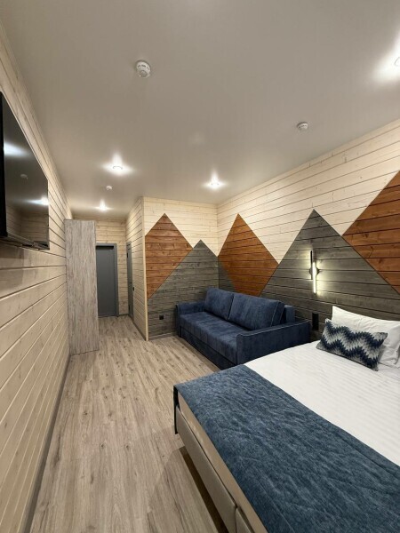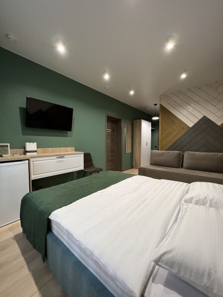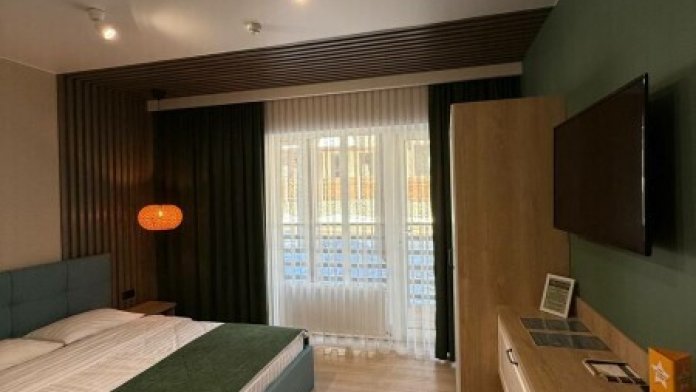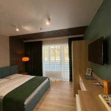 В номере: двуспальная кровать, диван-кровать, холодильник, электрический чайник, TV, прикроватные тумбочки, шкаф, мини-комод, стул, санузел с душем и феном, туалетно-косметические принадлежности, полотенца, халаты, тапочки, балкон.