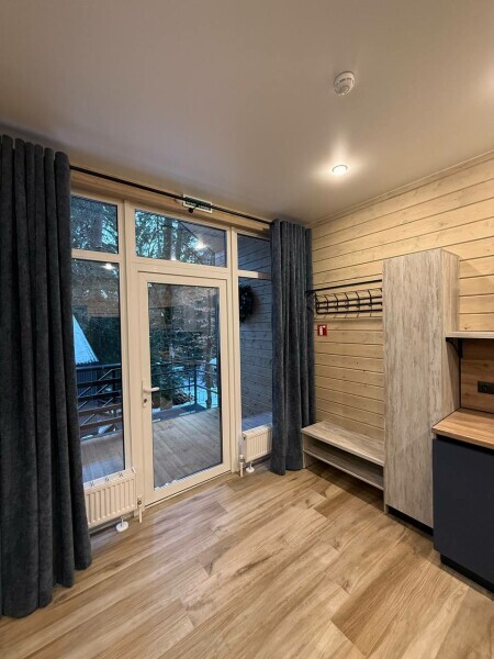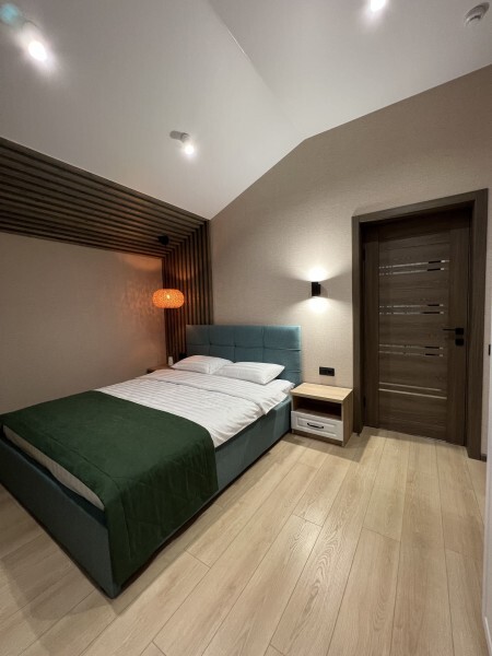 В доме две спальни. Комплектация спален - шкаф для одежды, двуспальная кровать, прикроватные тумбочки, раскладной диван, телевизор со Smart TV.