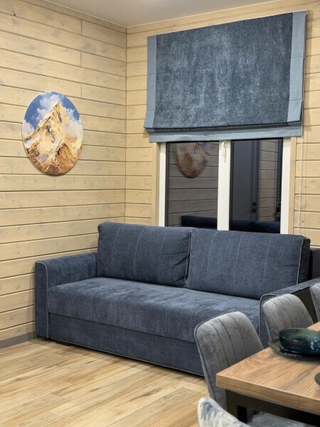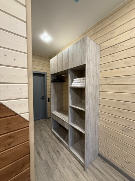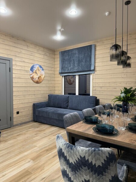 Большой двухэтажный коттедж на 14 человек. На первом этаже: кухня-гостинная с двумя двуспальными диванами, открытая терраса с обеденным столом, санузел. На втором этаже: 3 спальни (2+4+4), 2 санузла, детская кроватка. Рядом с коттеджем своя мангальная зона. В каждой комнате Smart-TV и тёплый пол.
