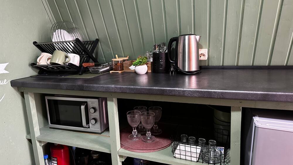 В доме расположен кухонный уголок с чайником, холодильником, микроволновой печью, столовыми приборами, посудой, большим столом.