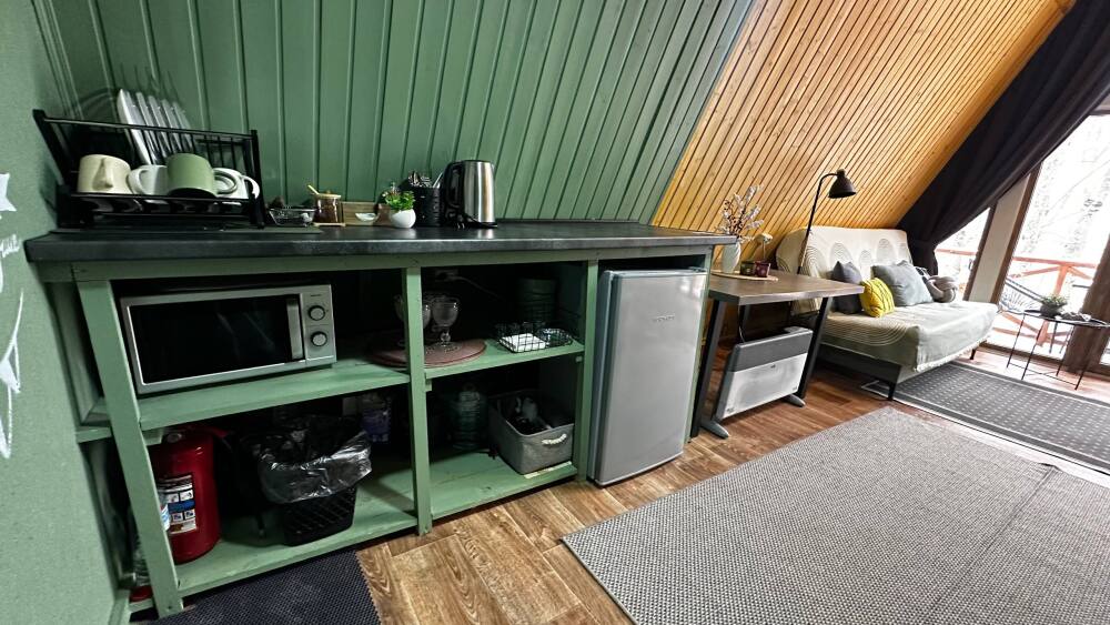 К сожалению варочная панель и мангальная зона в глэмпинге не разрешены, но для наших гостей действует 10% скидка на всё меню в нашем кафе «30ка», расположенном у подножия домика.