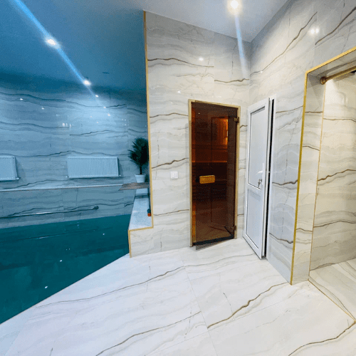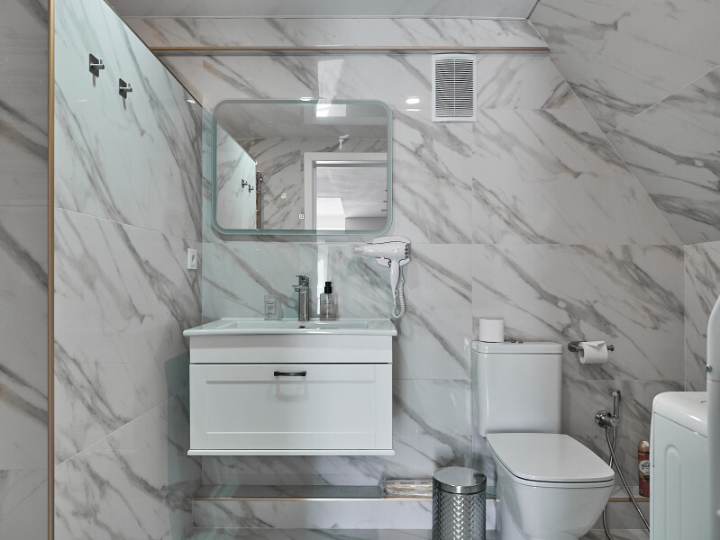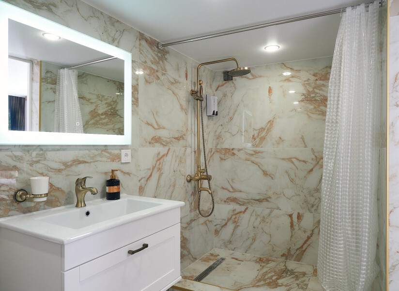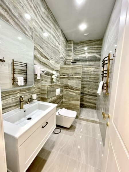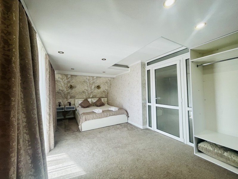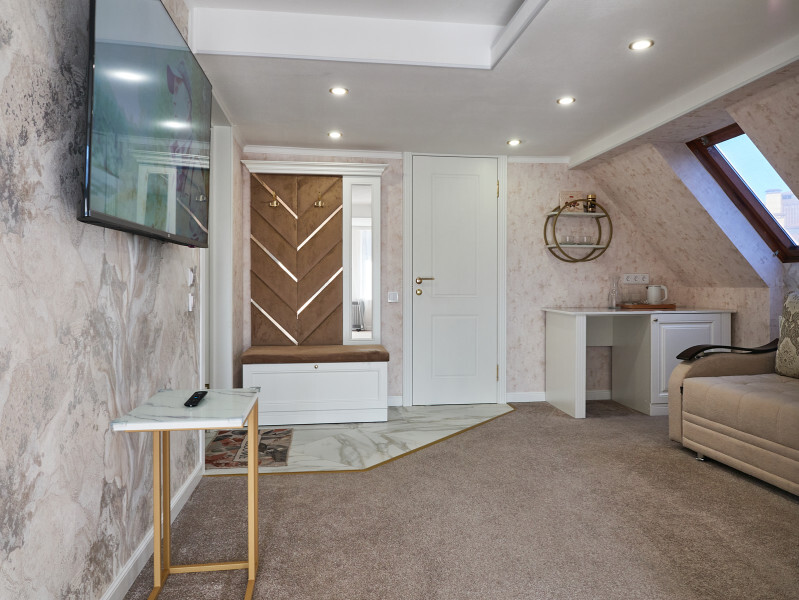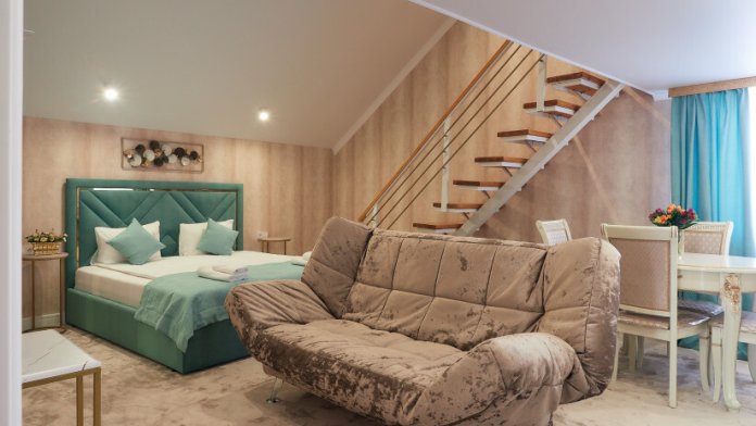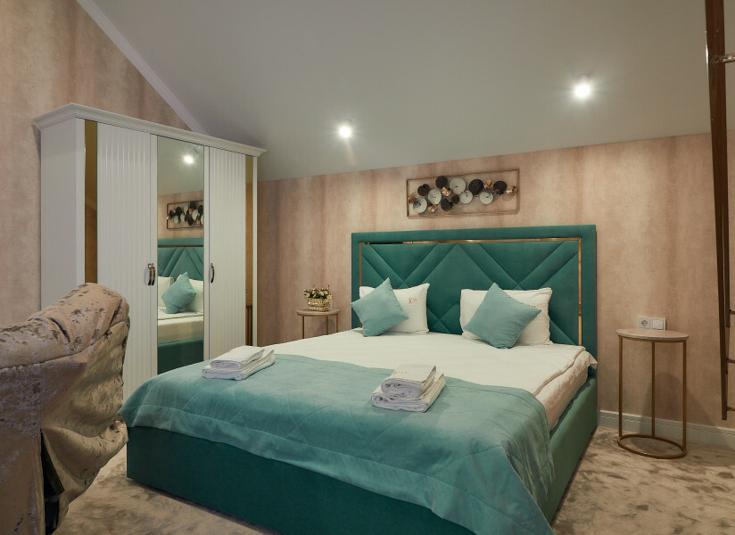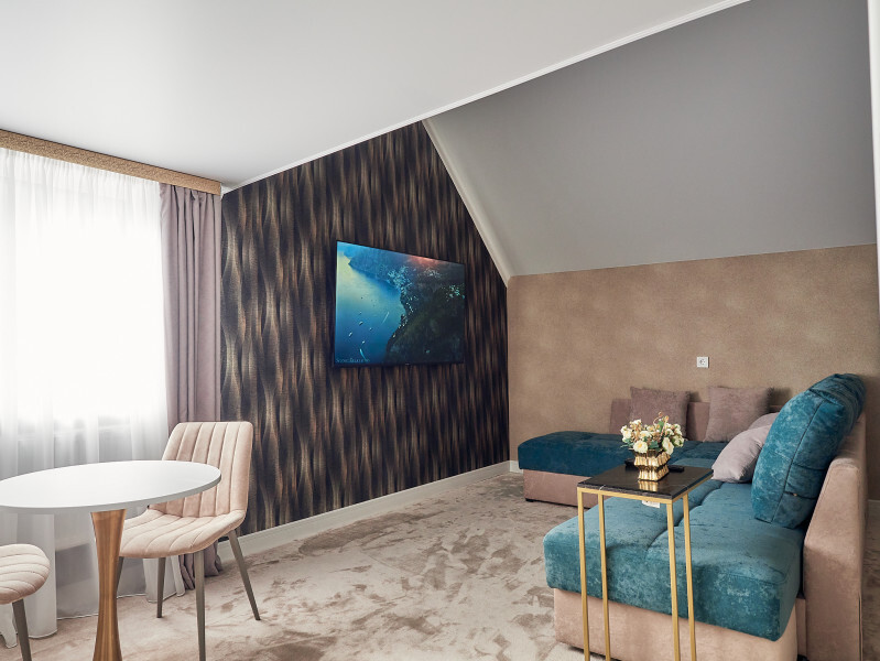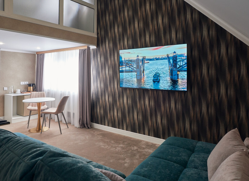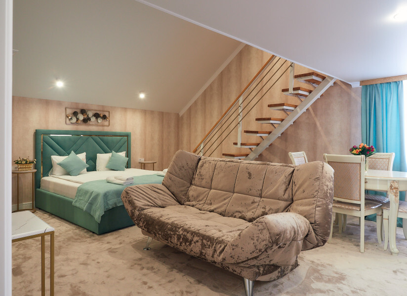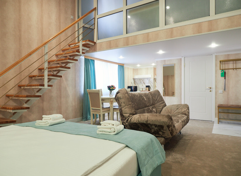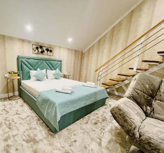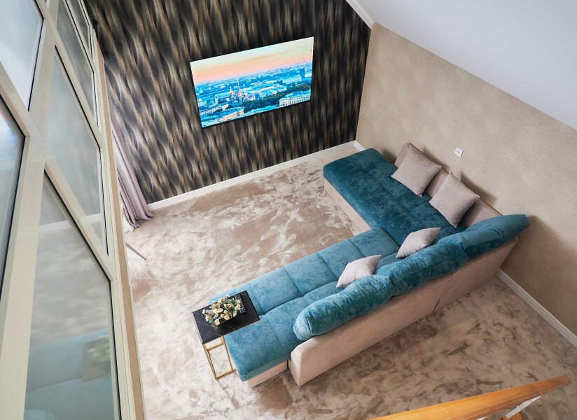 Номер двухуровневый. На первом уровне большой угловой, транформируемый в кровать 160*200, диван. Большой Smart телевизор 65 дюймов, сан узел. На втором уровне двуспальная кровать 180*200, телевизор 50’’.