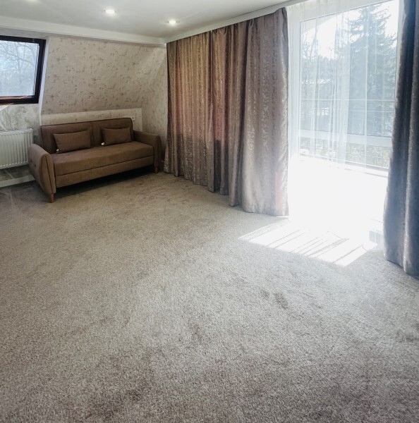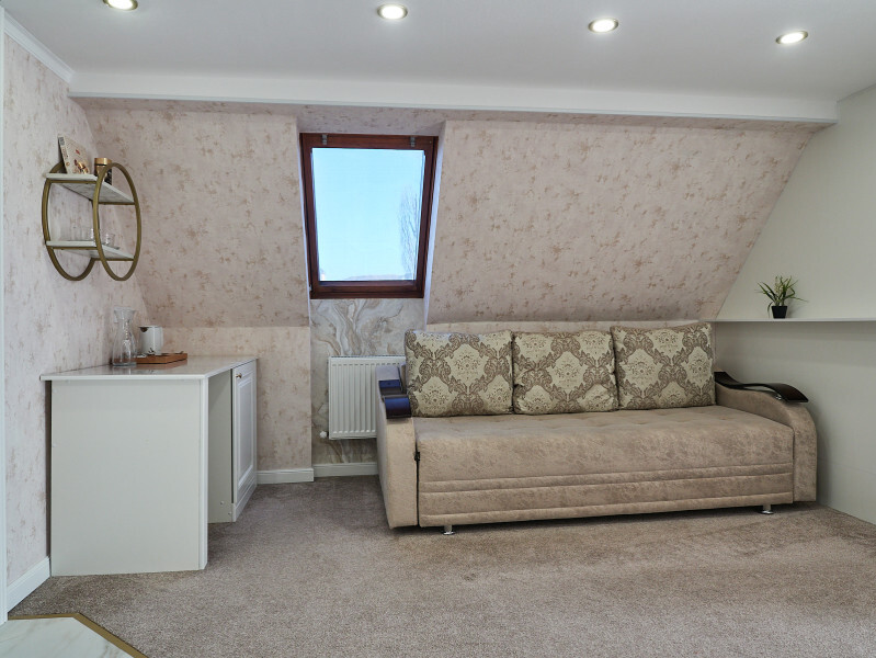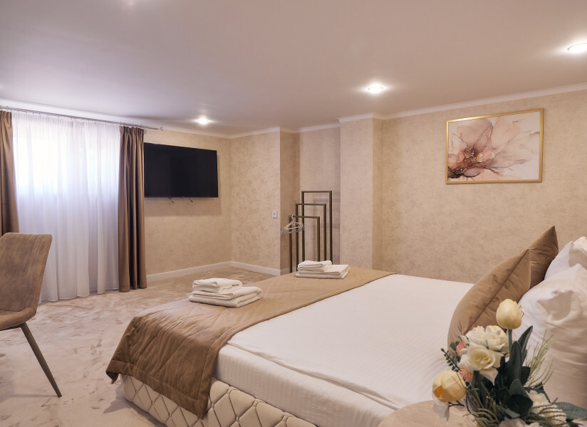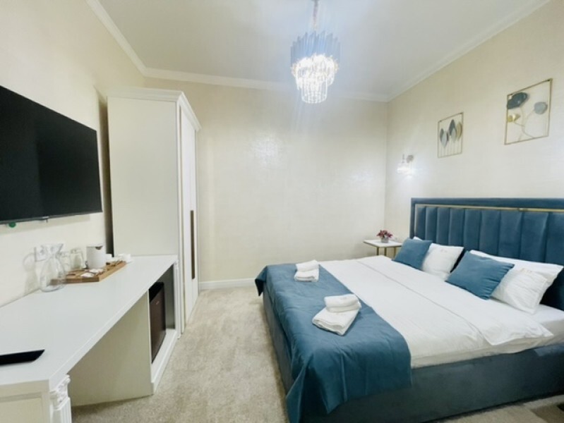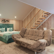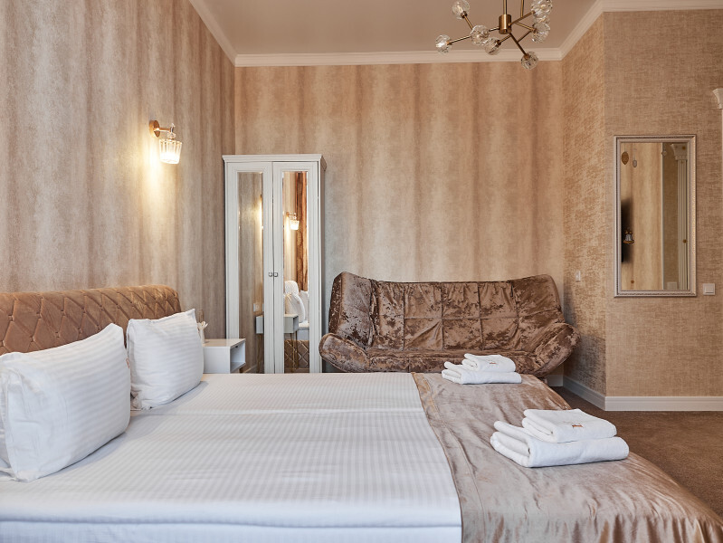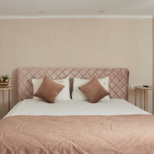 Для ценителей современной классики. Красивый, комфортный номер с большой двухспальной кроватью и диваном. Могут разместиться до 4 человек. Большой 50 дюймовый телевизор, холодильник, чайная зона. Вам понравиться!