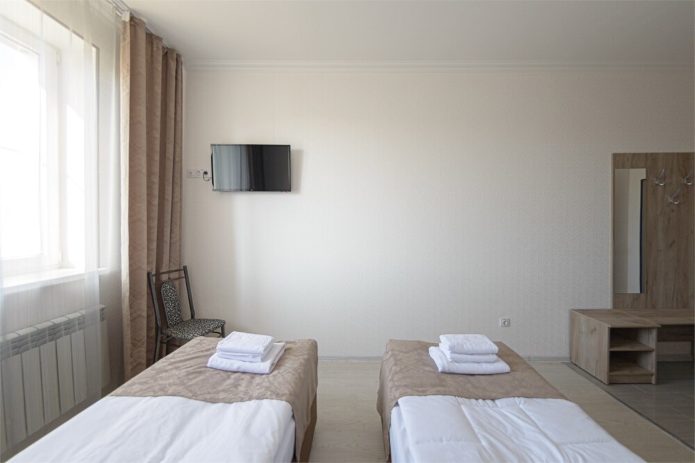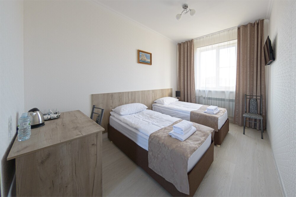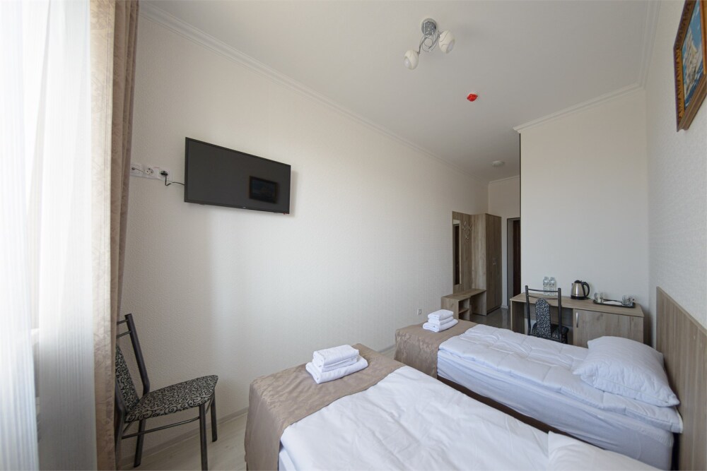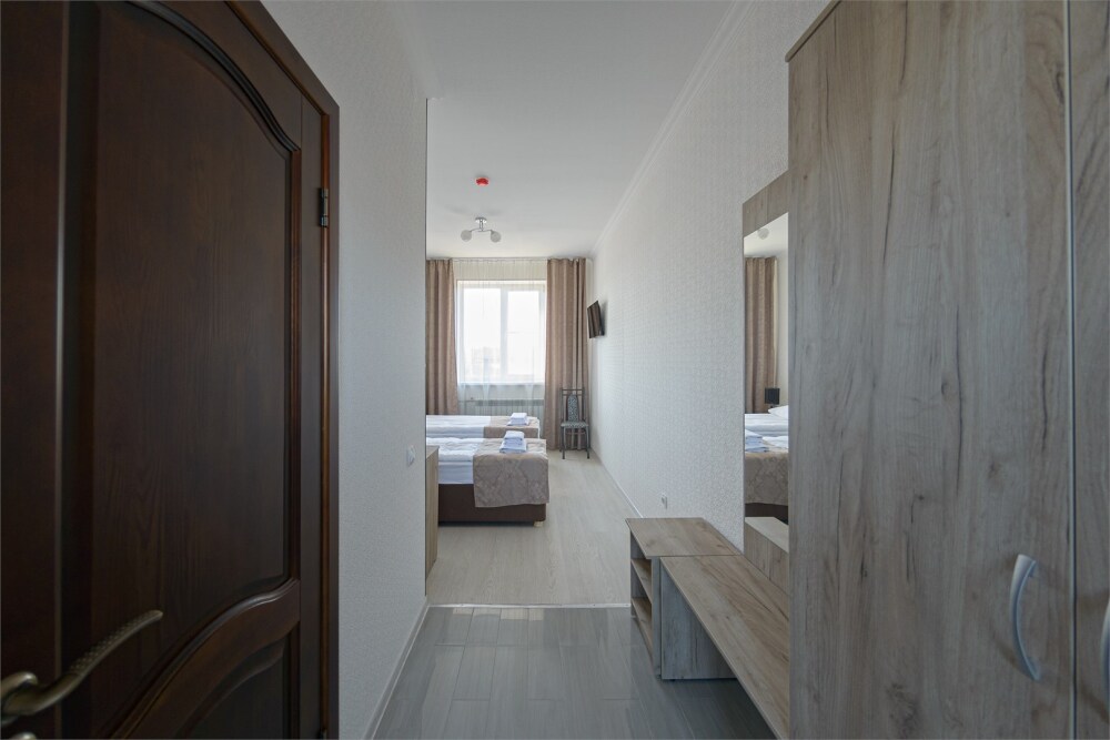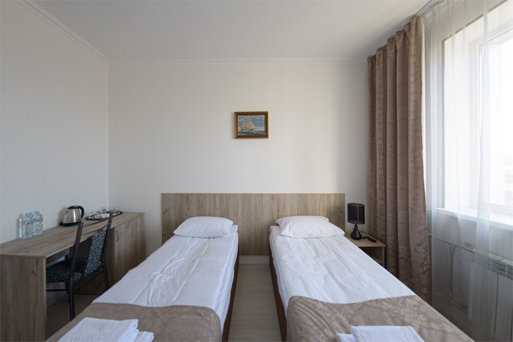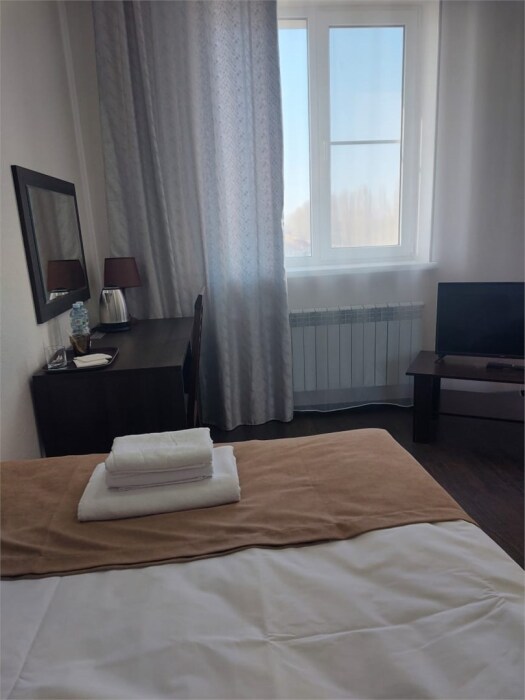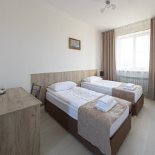 Уютный однокомнатный номер, состоящий из небольшой прихожей и спальной комнаты. В номере удобная современная мебель, 2 две кровати ( 90*200), а так же организованное рабочее пространство с письменным столом.