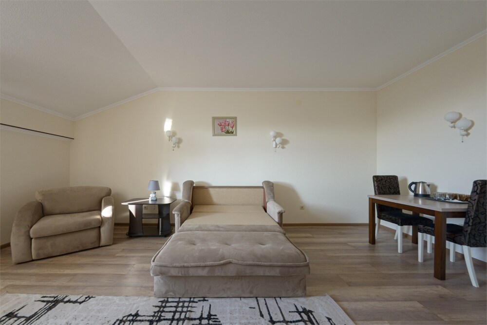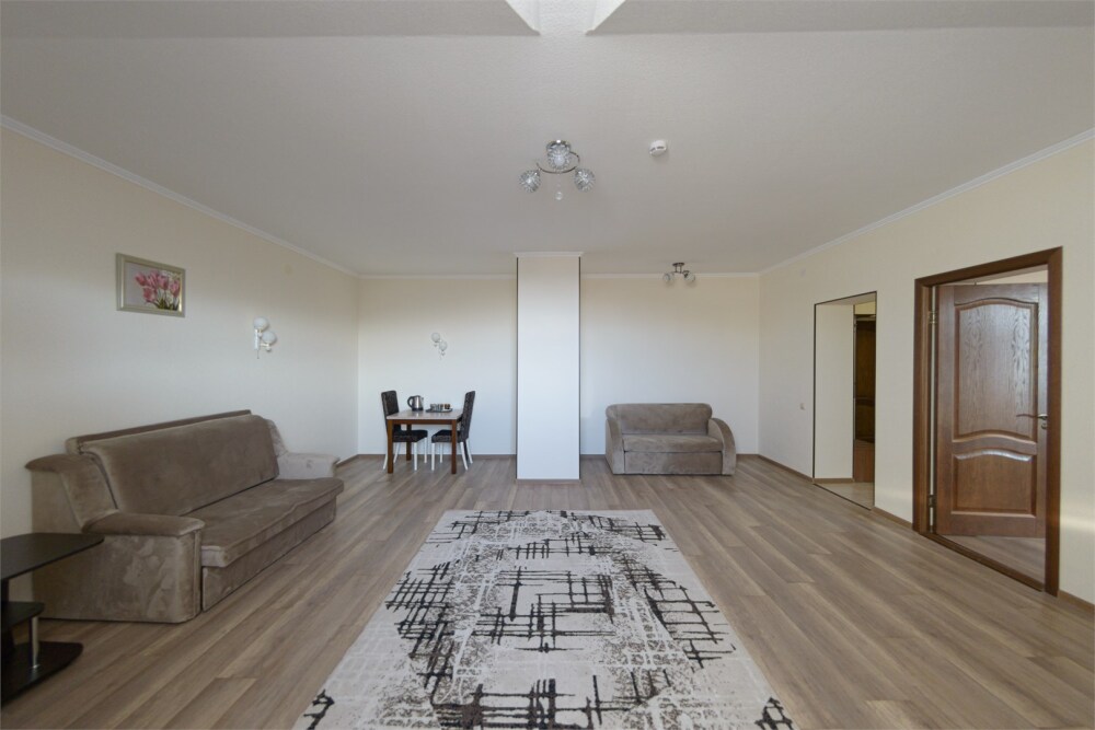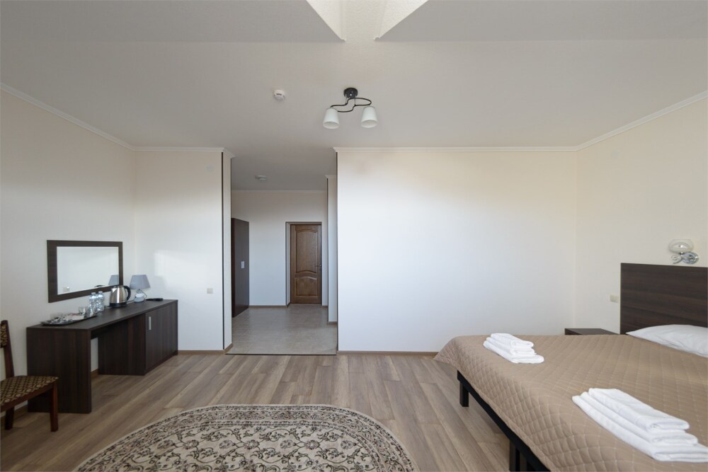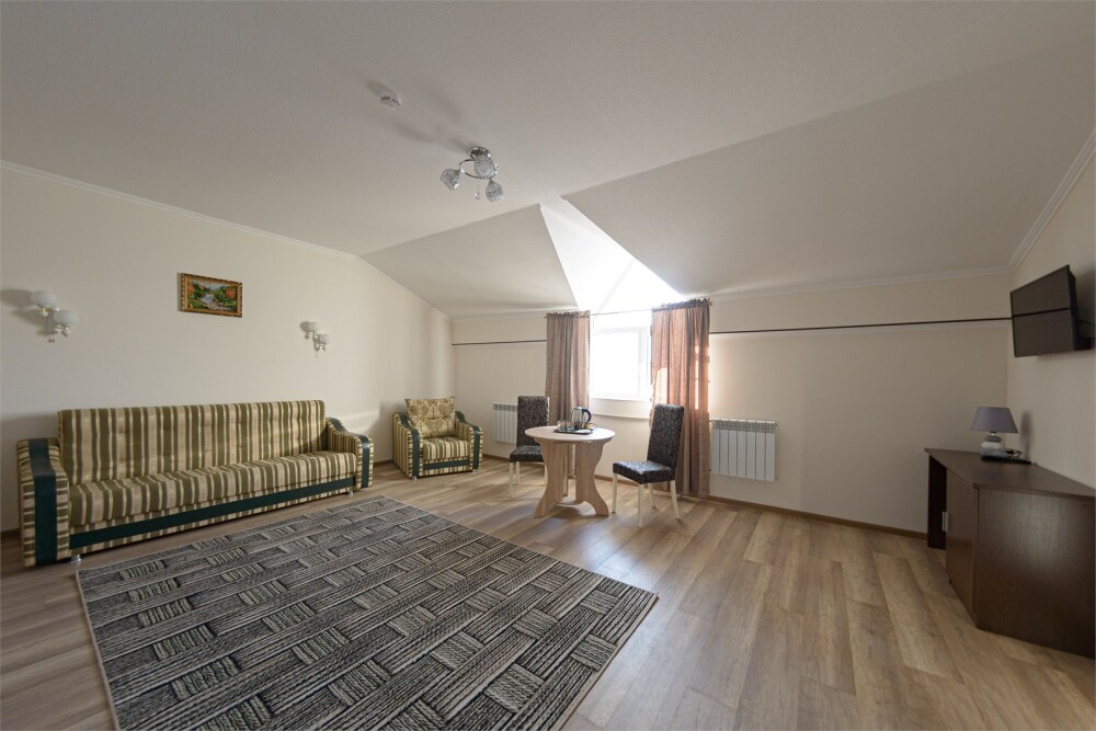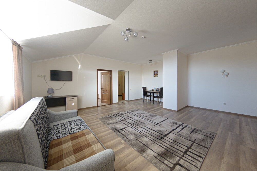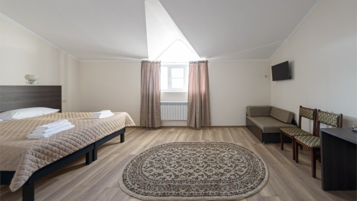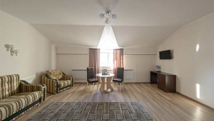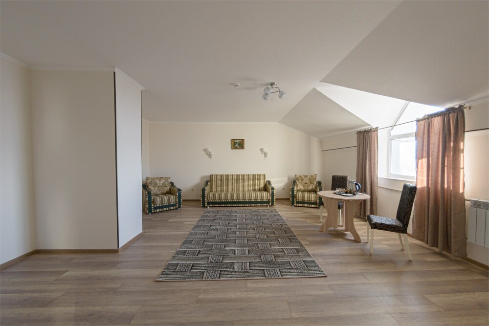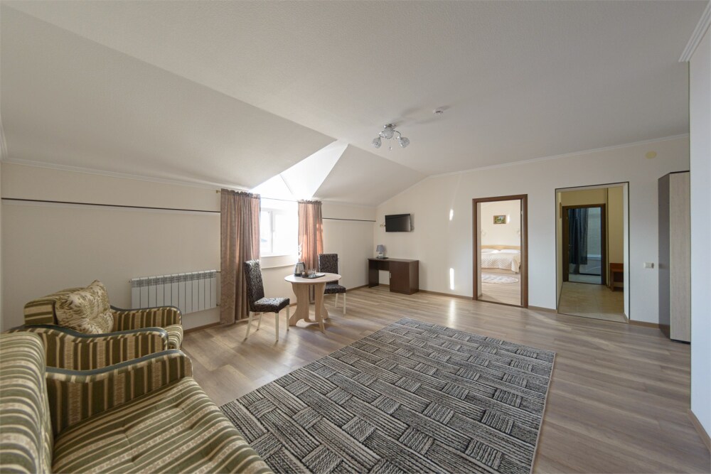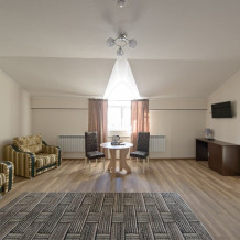 Просторный номер из двух комнат c большой ванной комнатой, располагающий к отдыху интерьер, большая кровать, два кресла-кровати и диван-кровать. Для Вашего комфорта предусмотрена дополнительная мебель: небольшой столик и стулья для Вашего уюта, сюда будет приятно возвращаться после прогулок.