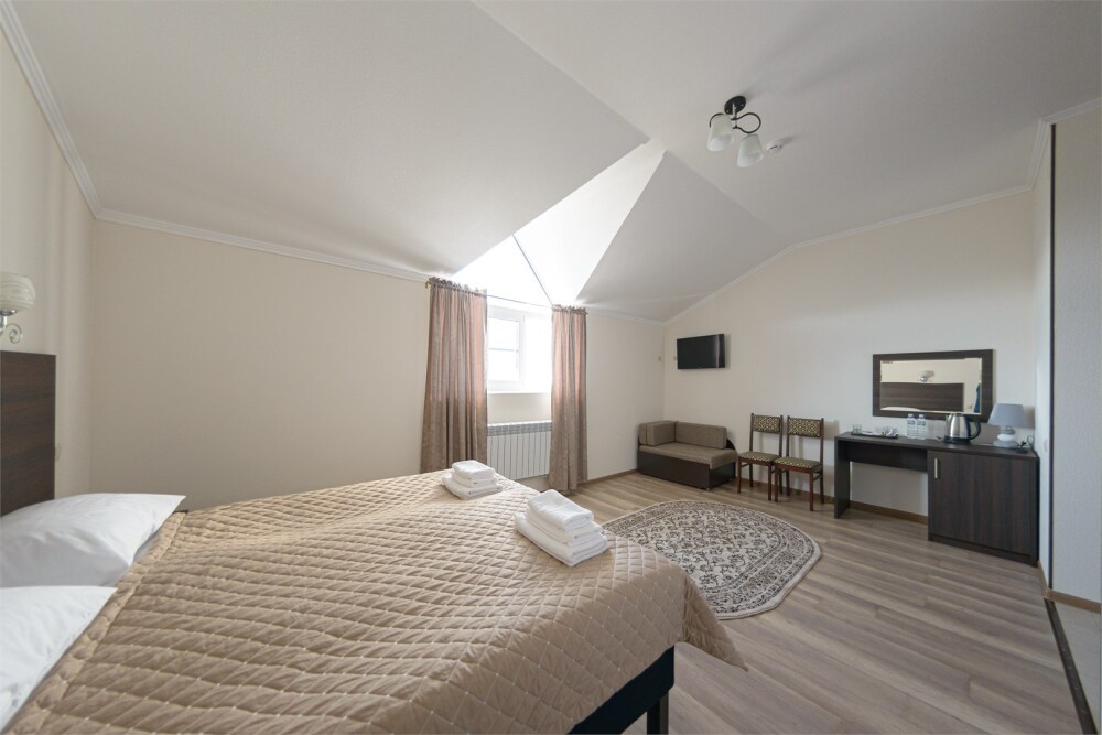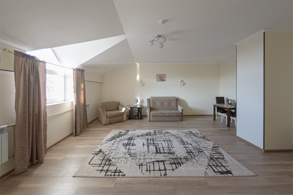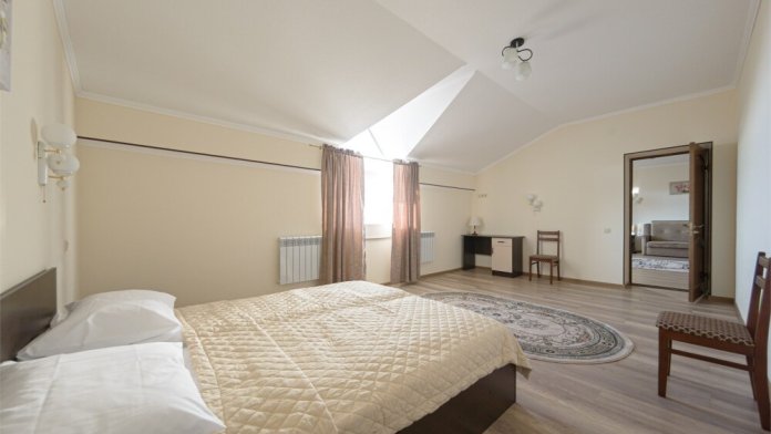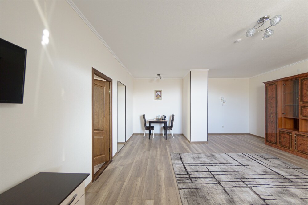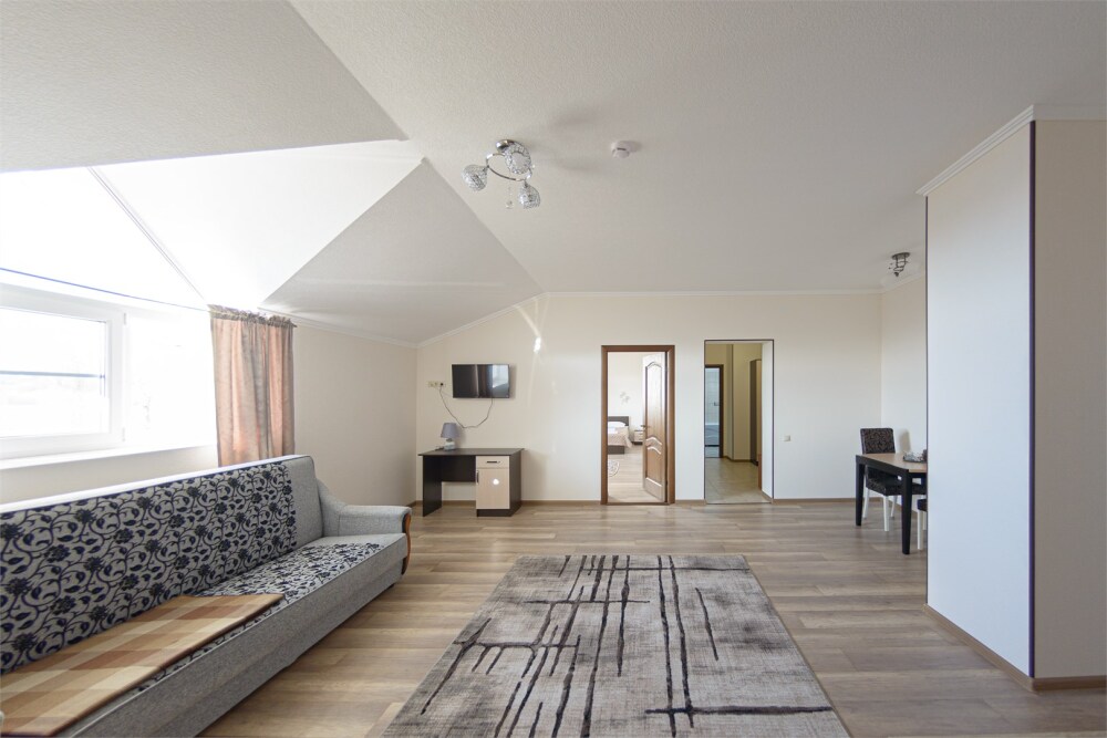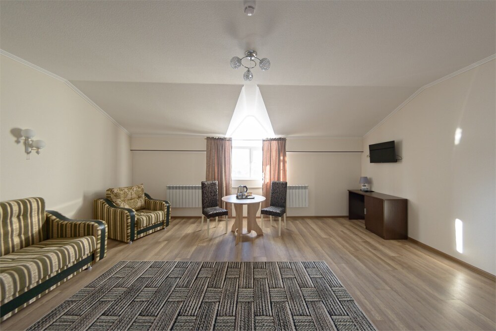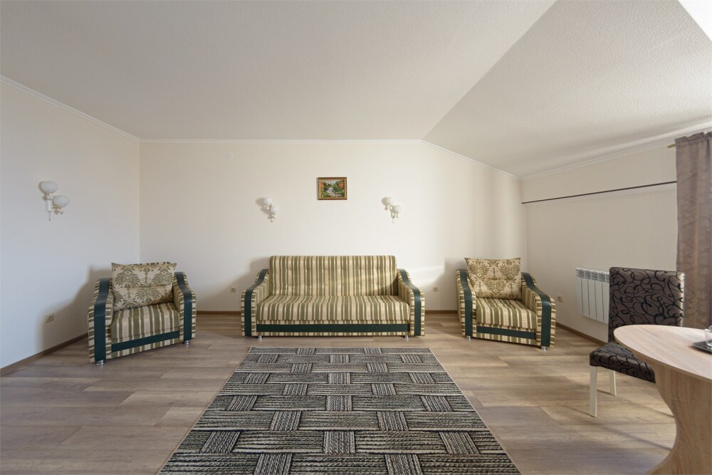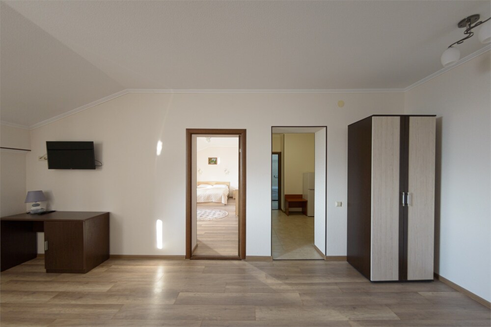 Просторный номер из двух комнат c большой ванной комнатой, располагающий к отдыху интерьер, большая кровать, два кресла-кровати и диван-кровать. Для Вашего комфорта предусмотрена дополнительная мебель: небольшой столик и стулья для Вашего уюта, сюда будет приятно возвращаться после прогулок.
